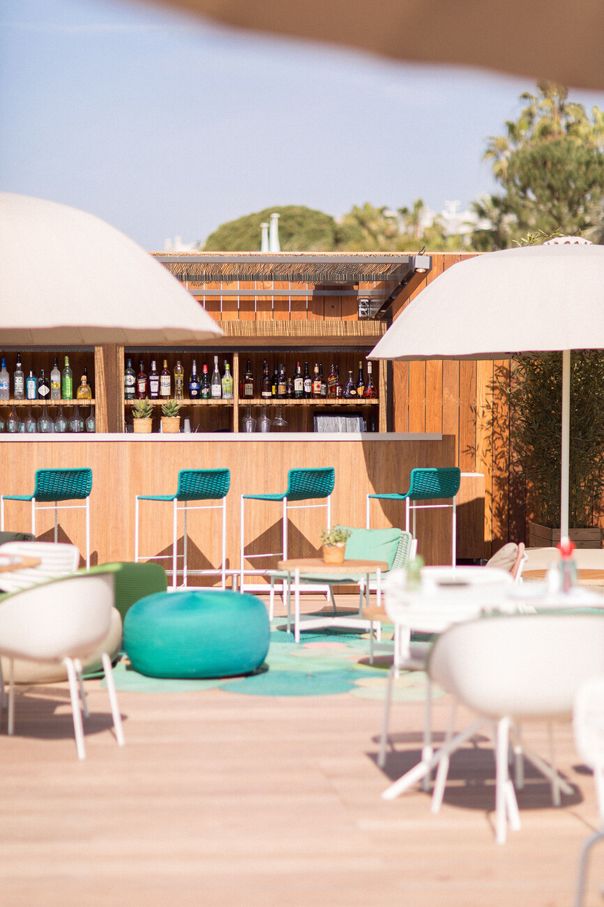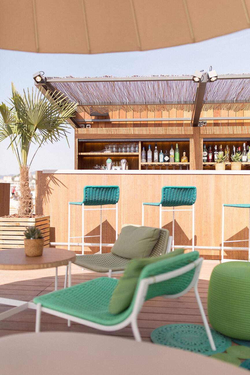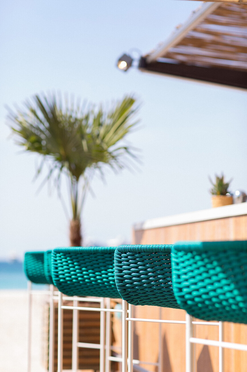In Cannes, a light green and beige version of the “Jali” was chosen, and this produces an ideal ensemble in combination with the small “Heron” side tables and practical poufs from the “Otto” range. Anyone who would rather enjoy the restaurant’s fine, organically oriented cuisine on the bar level, which has been built in wood, can take a seat on one of Paola Lenti’s “Amable” chairs. Alternatively, guests can get comfortable in one of the large “Baia” lounge chairs, while the dome-shaped “Bistró” umbrellas made of fabric and varnished aluminum provide optimum shade. A playful element beneath guests’ feet is the “Cosmo” carpet, which is produced from colored rope cord and is made up of round modules in various colors and structures. Guests sitting directly at the bar can enjoy comfort thanks to the “Heron” bar stools with their small backrests and their bold, petrol-blue covers, which add a nice accent to the light wood of the bar itself. Once the sun sinks beneath the azure-blue water, the battery-operated “Agadir” LED lanterns light the way for guests.