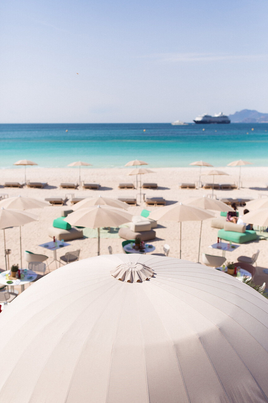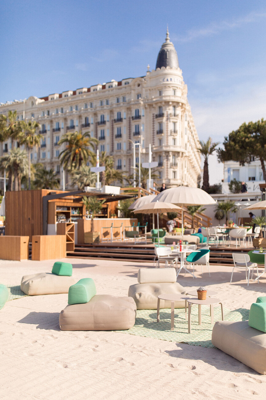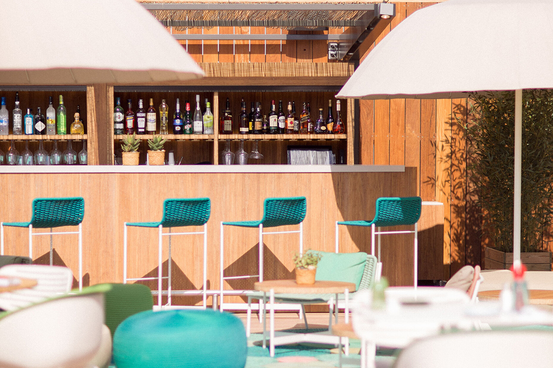 In Cannes, a light green and beige version of the “Jali” was chosen, and this produces an ideal ensemble in combination with the small “Heron” side tables and practical poufs from the “Otto” range. Anyone who would rather enjoy the restaurant’s fine, organically oriented cuisine on the bar level, which has been built in wood, can take a seat on one of Paola Lenti’s “Amable” chairs. Alternatively, guests can get comfortable in one of the large “Baia” lounge chairs, while the dome-shaped “Bistró” umbrellas made of fabric and varnished aluminum provide optimum shade. A playful element beneath guests’ feet is the “Cosmo” carpet, which is produced from colored rope cord and is made up of round modules in various colors and structures. Guests sitting directly at the bar can enjoy comfort thanks to the “Heron” bar stools with their small backrests and their bold, petrol-blue covers, which add a nice accent to the light wood of the bar itself. Once the sun sinks beneath the azure-blue water, the battery-operated “Agadir” LED lanterns light the way for guests.