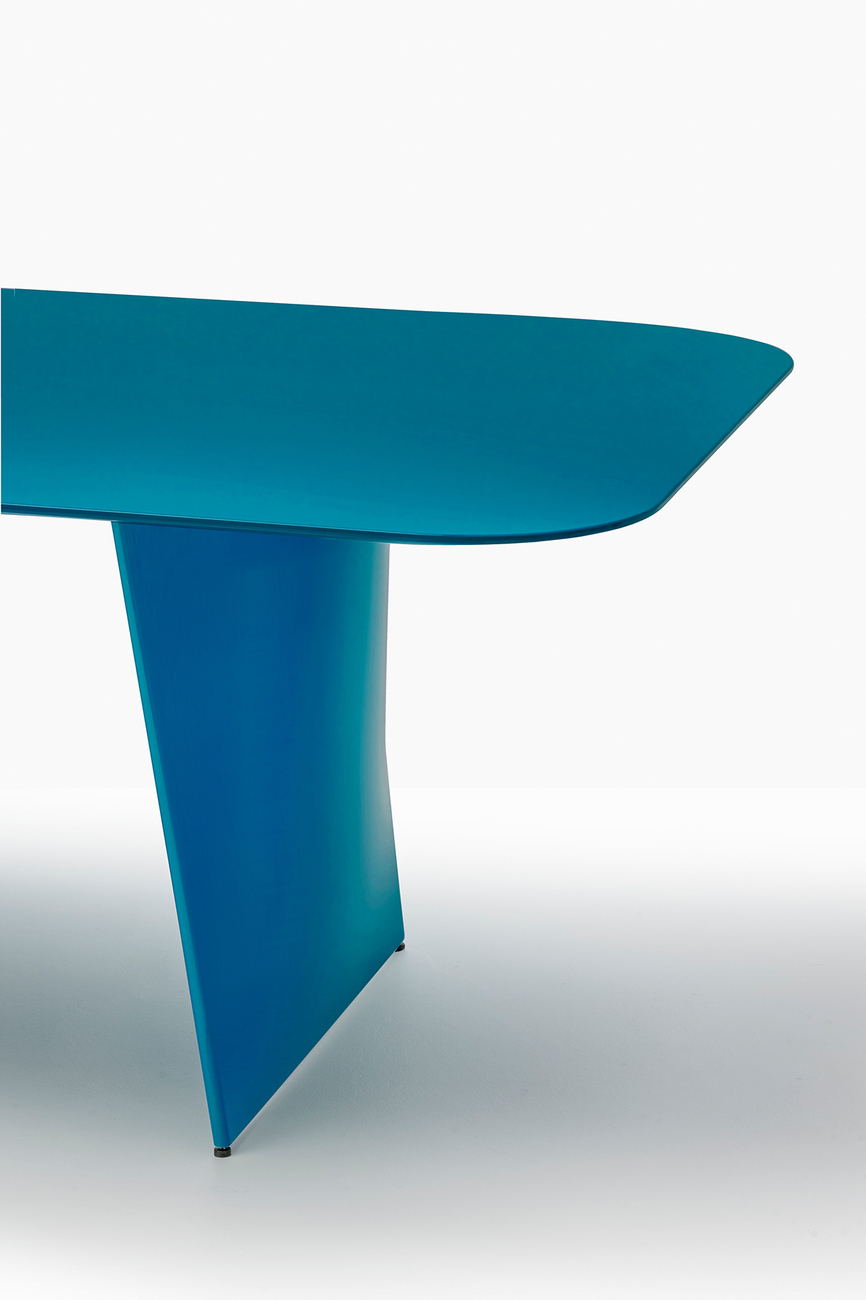 With the "Frank" table for Pedrali, Robin Rizzini explores the possibilities of aluminium as a material: Two slightly inwardly curved bases support the rectangular top, which is available in three dimensions as well as in glass and lacquered MDF. For the aluminium version, an anti-fingerprint finish ensures perfect performance at all times. Held by a sturdy steel beam directly under the top, the dynamic shape of the legs narrows towards the bottom: "For 'Frank', we designed a die-cast aluminium base that starts directly under the top and becomes almost straight towards the floor. The idea was to create the impression of a very stable table, despite its slender profiles," says Robin Rizzini. By combining straight and curved lines, the designer has created a table for Pedrali whose perception changes depending on the viewing angle. The sail-shaped bases give the furniture an elegant curve that can be integrated into any context. And for those who love to make a statement, Robin Rizzini has created a striking version in glossy red MDF. (am)