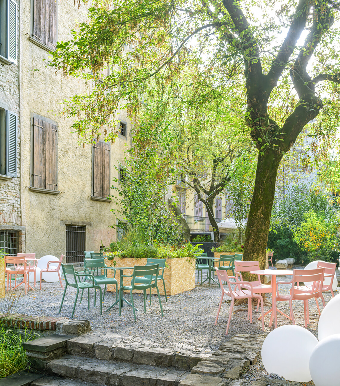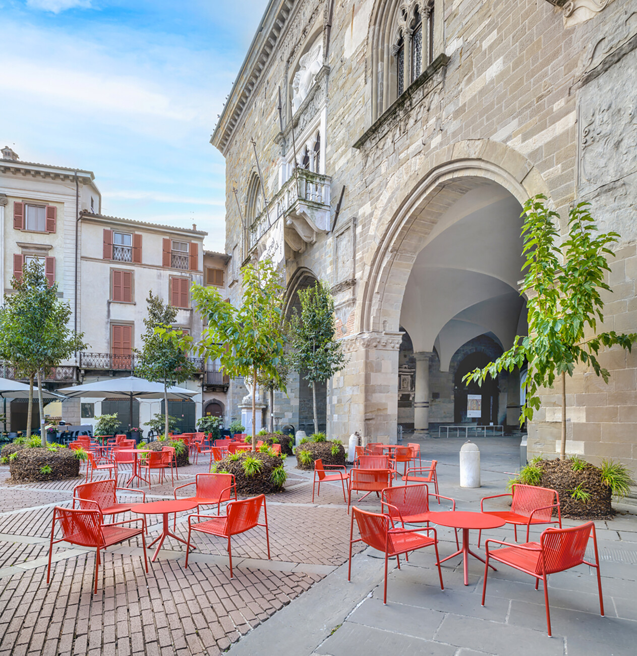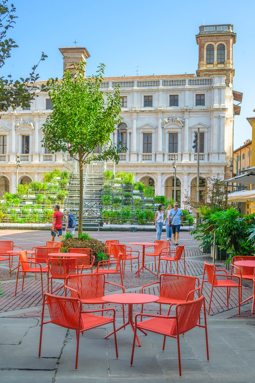 The theme of sustainability, which has always been a guiding principle for the family business, was likewise visible in the diverse display, as it has been for the organisers of the landscape exhibition – the Associazione Culturale Arketipos, the city of Bergamo and the Lombardy region: These included the presentation of seedlings of typical Lombardy forest species on reusable metal frames. "We shape a better future" is Pedrali's guiding principle, which they underlined in an expressive way with the outdoor event in the heart of Bergamo.