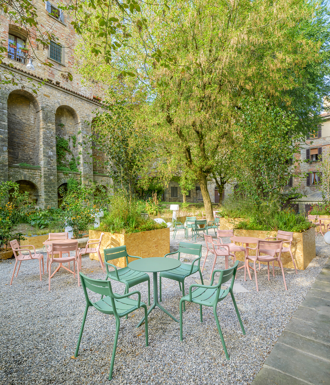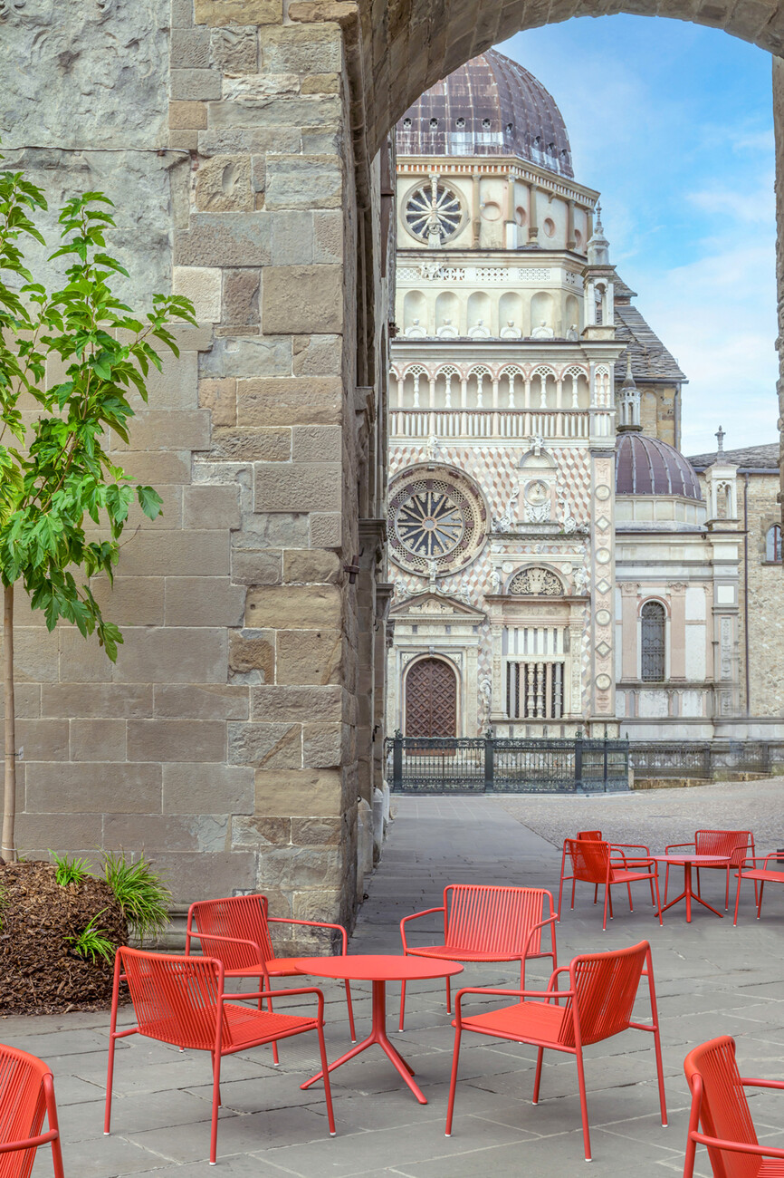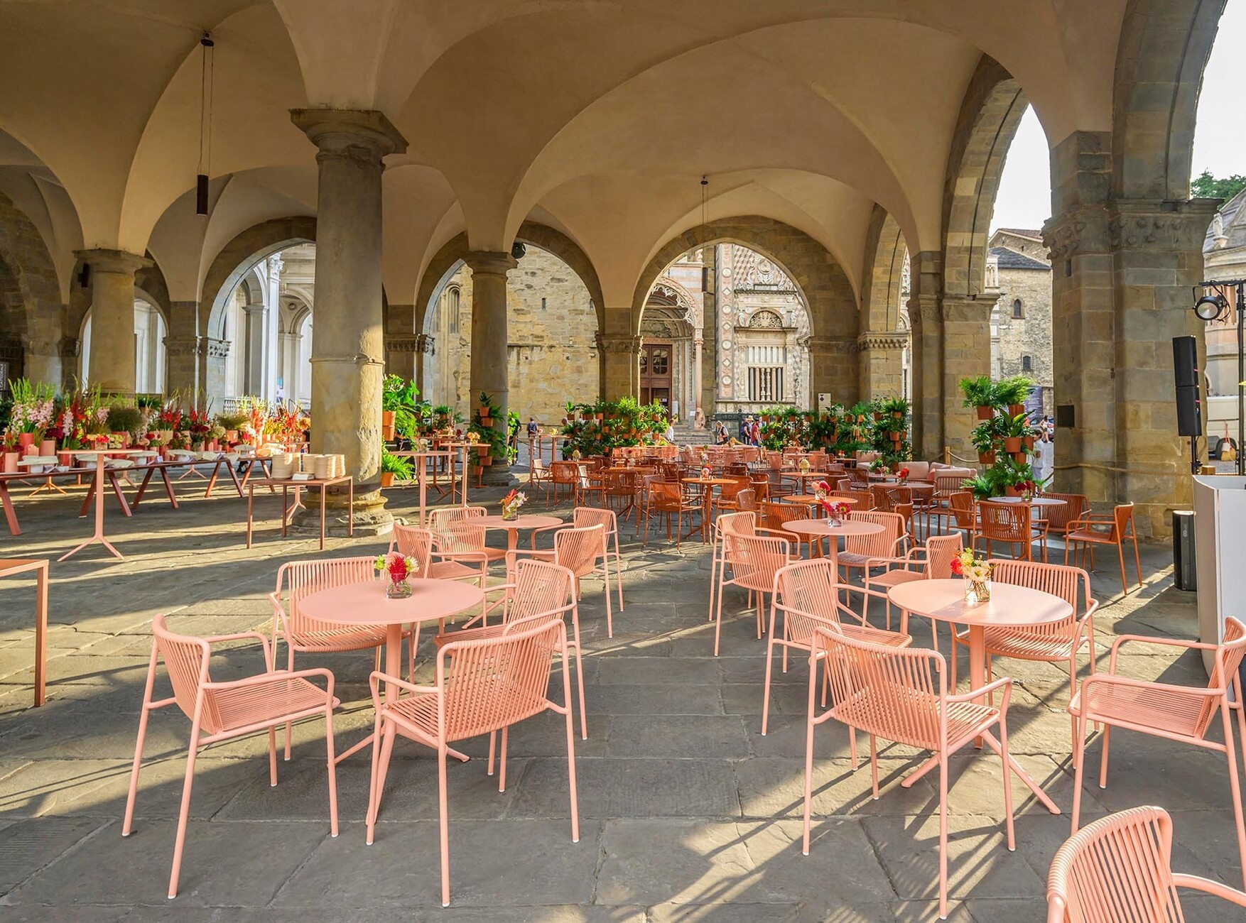 The setting could not have been more perfectly chosen, as Piazza Vecchia in the historic centre of Bergamo offers an architecturally impressive scenery that was completed in the 15th century and has lost none of its charisma to this day. At regular intervals, it is also the centre for the I Maestri del Paesaggio festival, whose ideas for sustainable landscape planning are supported by Pedrali. "Grow together" was this year's motto, which translated seamlessly to the community: The Pedrali family brought together great names from the design and architecture scene, such as architect and designer Michele De Lucchi, who designed the wooden Pedrali Pavilion together with his team from AMDL Circle to mark Pedrali's 60th anniversary, or Marva Griffin Wilshire, the founder and curator of SaloneSatellite, the most important international platform for young designers. In a relaxed atmosphere, the guests were able to celebrate together, make new connections and strengthen existing ones. Seating was provided on outdoor furniture by Pedrali, both under the arch of the Campanone, the historic city tower, and by the Antico Lavatoio, the old washing fountain, as well a historic landmark in the city.