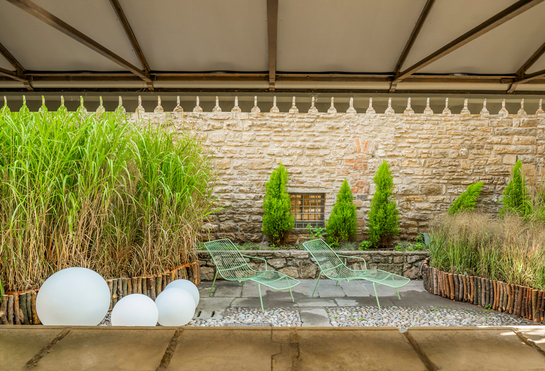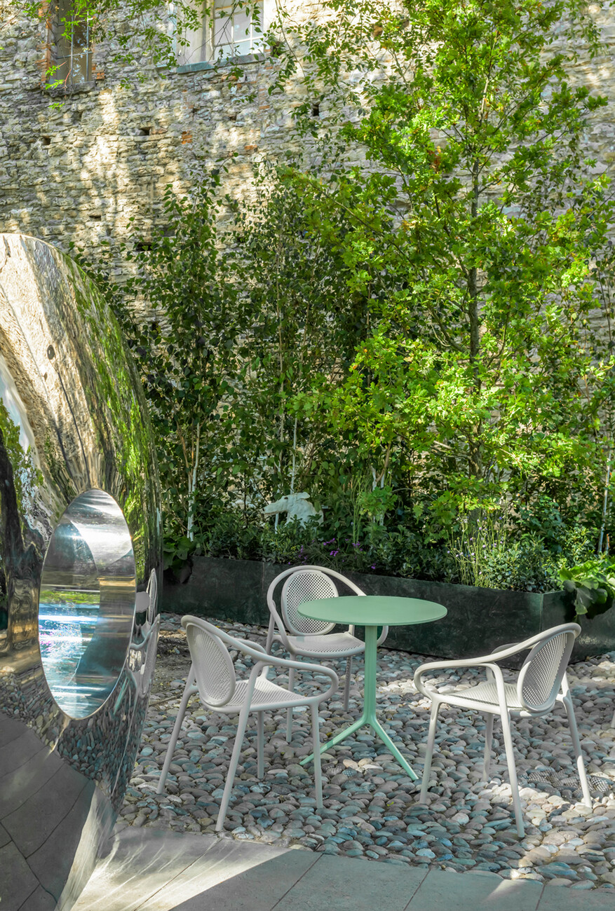 Pedrali chose an appealing combination of furniture from the established range with new models: The "Souvenir" chair by Eugeni Quitllet features a monobloc armchair made of polypropylene, while the "Remind" chair from his hand is reminiscent of the dynamic curves of wooden chairs from the second half of the 19th century and translates the aesthetics of Viennese wickerwork into a new context using a perforated backrest made of polypropylene. The "Tribeca" collection by CMP Design represents a contemporary interpretation of the patio chairs from the 1960s, whose metal form has been covered with plastic ropes: The designer trio has thus chosen a straight-lined base, optionally with slightly flared armrests. The strands of extruded PVC with a nylon core offer a particularly high level of seating comfort and return to their original position when not in use. At the same time, the metal furniture make reference to the metal garden chairs with which Mario Pedrali founded his company in 1963. It was just as wonderful to relax on the "Nolita" chaise longue from CMP Design. A green frame was provided by the "Hevea" flower pot holder by Victoria Azadinho Bocconi, whose six pots on a steel stem can be placed either facing each other or in a spiral.