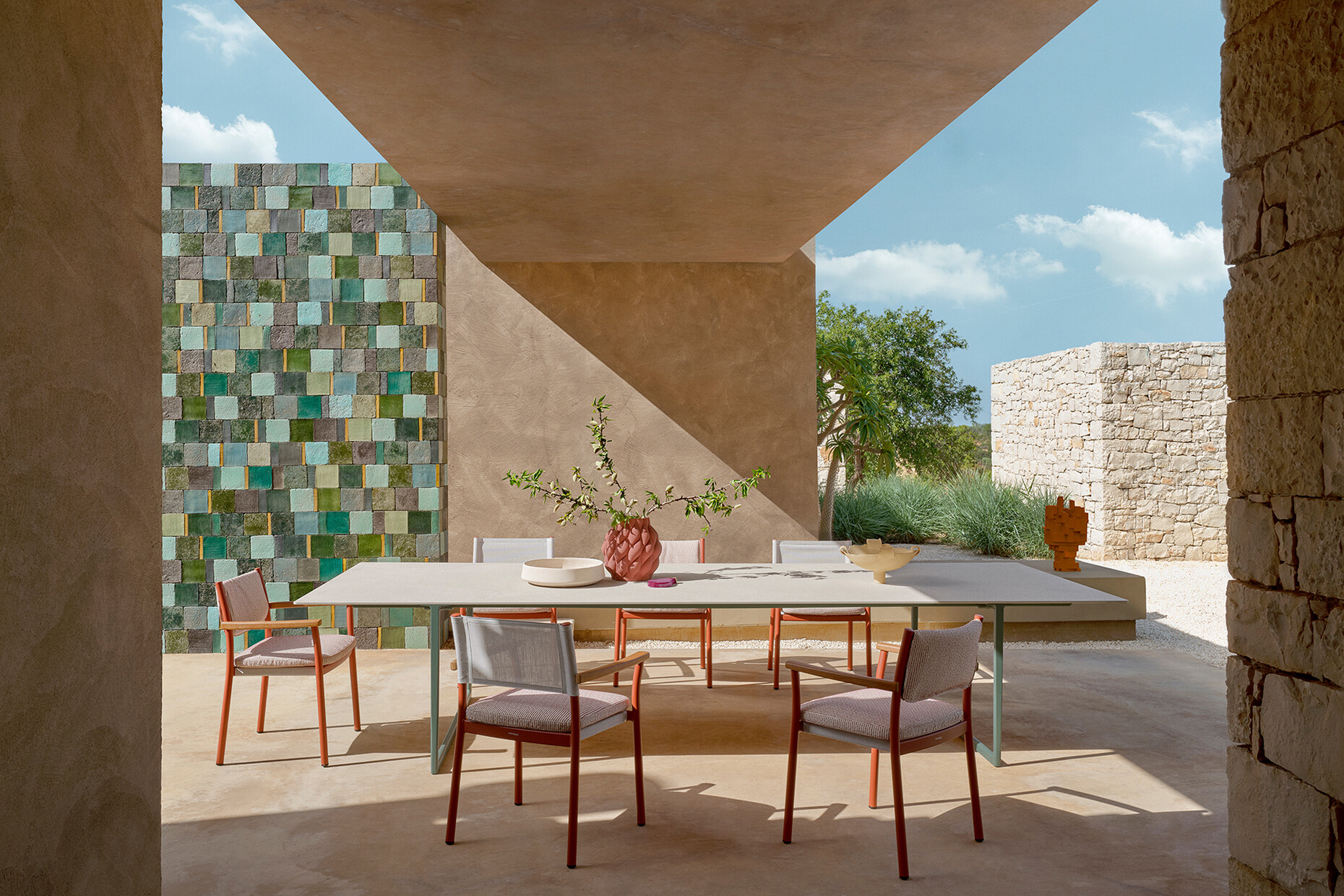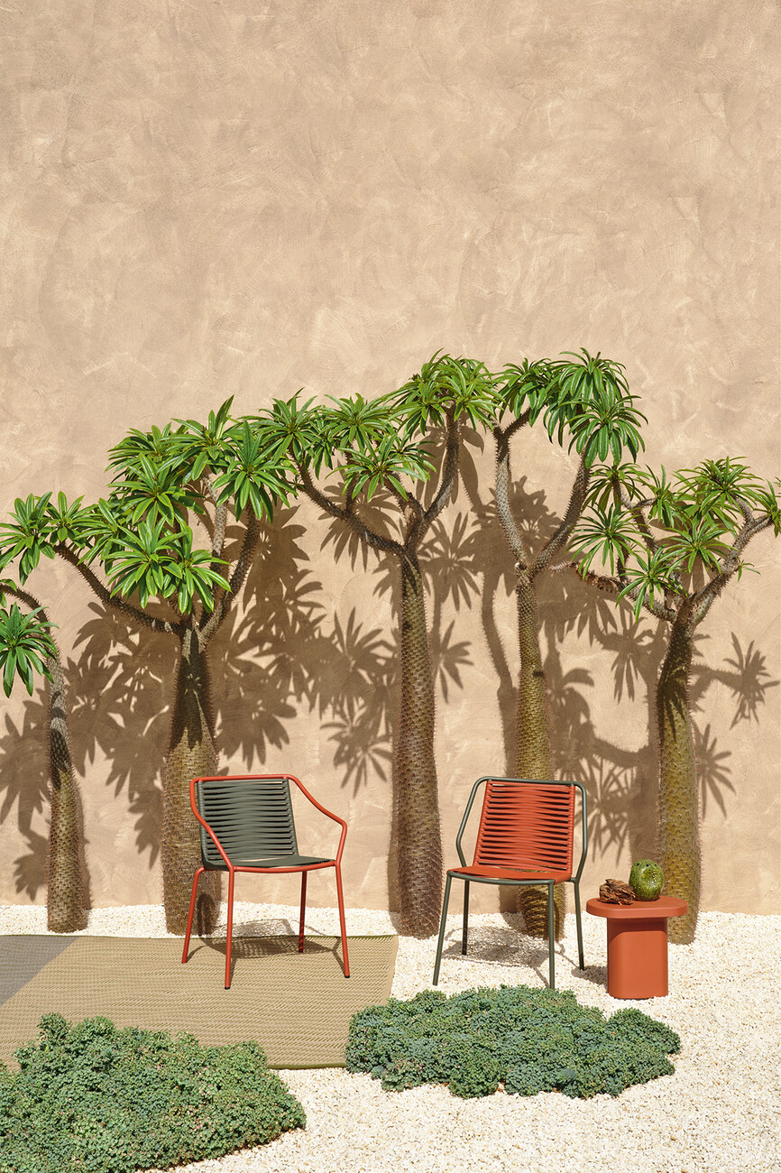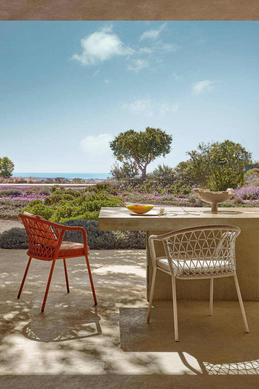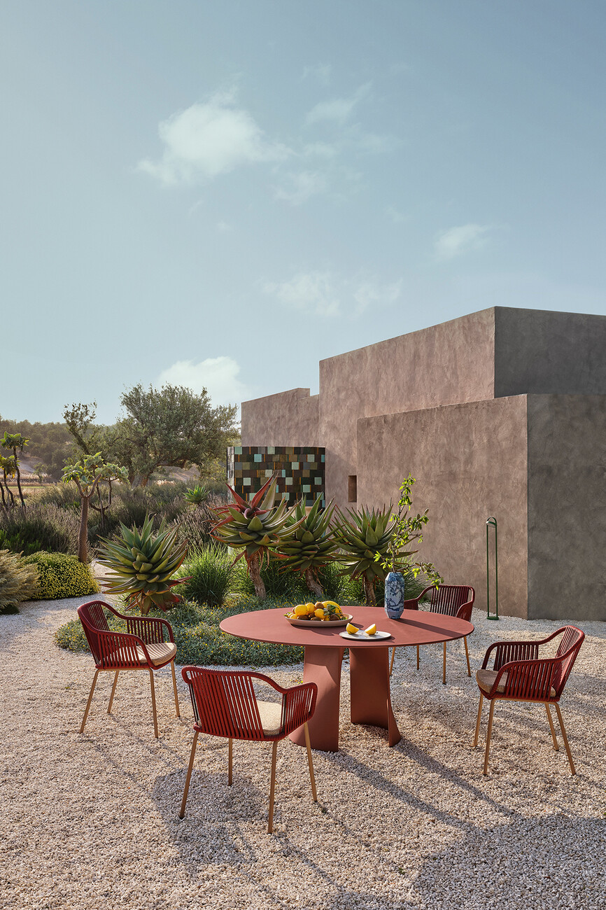 Even if getting up afterwards isn't any easier: in a cosy corner, "Anemos" entices you to the table with its formal elegance and charming twist. The warm terracotta colour reveals its architectural character. Pio and Tito Toso have designed a round table that impresses with its minimalist yet classic design language. Its base consists of two separate concrete shells, which take on a flexible and sinuous form with a double curvature: like a piece of cloth moulded by the wind. Visually light and dynamic, it is stable thanks to its weight and structure - even on windy days. The matching "Babila Twist" armchairs by Odo Fioravanti echo the soft, dynamic language. A rhythm of straight and curved lines represents the connection between the built and the grown environment - and corresponds harmoniously with southern thick-leaved plants.