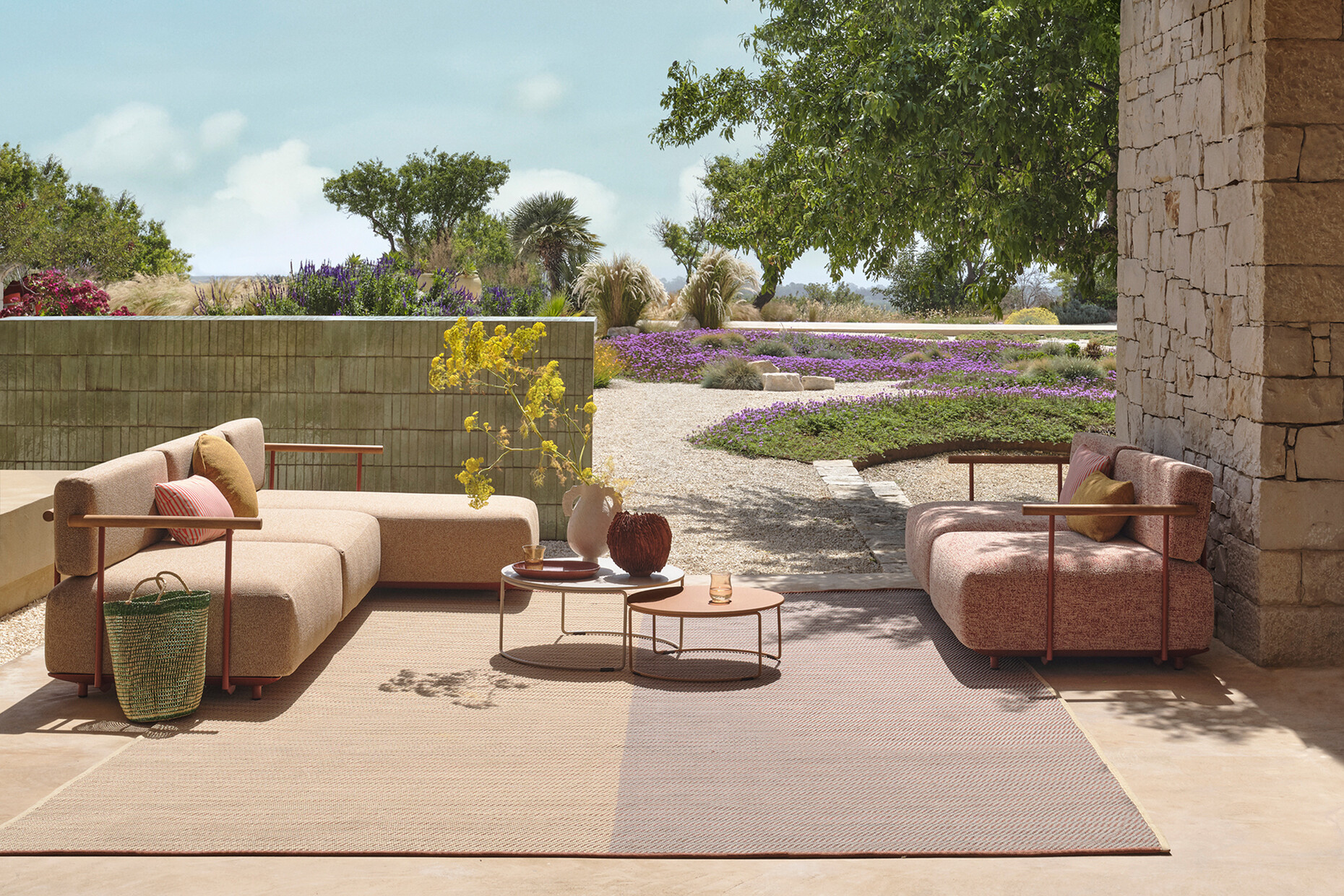 The aperitif is classily served on the veranda: Rectangular upholstery on a lightweight aluminium frame characterise the elegant design of "Arki-Sofa". Exquisite teak details on the armrests and backrest emphasise the cosy and clean character of the sofas. The modular series is available in two seat depths and can be combined with chaise longues to create a flexible lounge area. With warm earthy colours, the furniture harmonises with the friendly colours of limestone. And the "Twiny" rug by DWA Design Studio creates a particularly cosy atmosphere in the outdoor setting. With its sandy tones, it not only flatters bare feet and radiates Mediterranean hospitality: There's nothing in the way of settling in and feeling at ease.