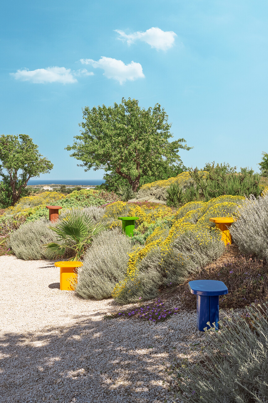 As the cool water of the pool promises refreshment, the features of the latest addition to the family, "Buddy Oasi", come into their own at the poolside scenery: designed for outdoor use, you can dry off on the sofa in the sun as the removable cover is equipped with a waterproof lining. The design by Busetti Garuti Redaelli brings a playful lightness to the setting with generous cushions and delicate legs. The special feature of "Buddy Oasi" is the movable backrest. It can be freely positioned on the seat and, thanks to its weight and non slip fabric on the underside, provides a solid base for cosy lounging around. The colourful collection plays Pin-Pong with broom and lavender in the flowerbeds. "Caementum" by Marco Merendi and Diego Vencato adds colourful accents. As a monobloc table made of concrete, it forms a solid base for drinks, books laid aside or serves as an eye-catcher wherever a little splash of colour is required.