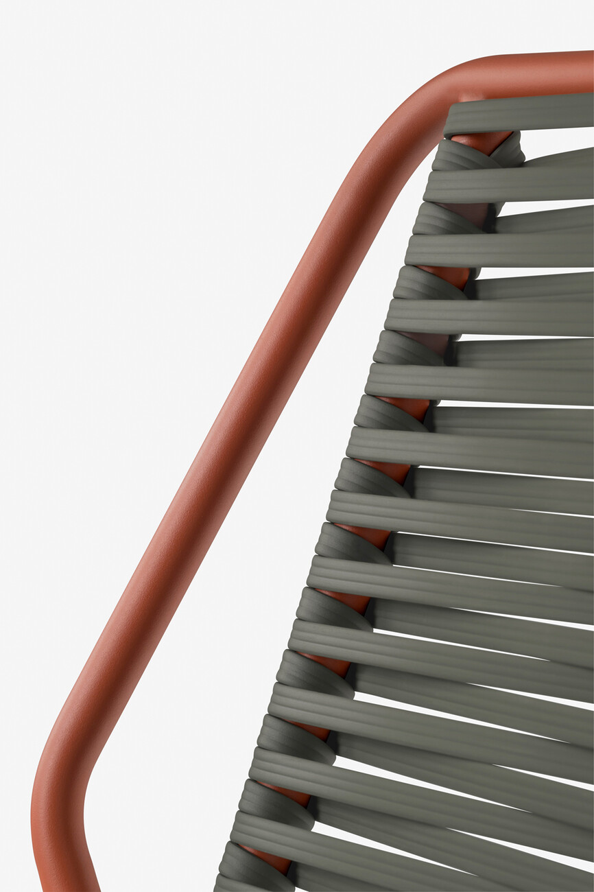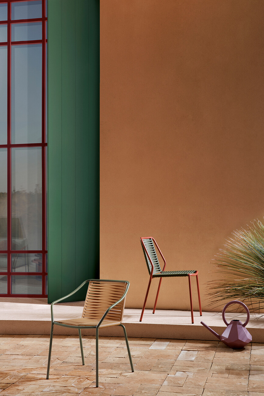 "Philía" is a collection of outdoor seating furniture by Pedrali that celebrates the traditional Italian garden chair and the enjoyment of extended outdoor gatherings. For the first time, its designer Odo Fioravanti was inspired rather by a feeling, than by nature or geometrics – although the collection’s shape also reflects on both of them. The feeling was the one he has, seeing families, friends – "Philoi" in Greek – and neighbours gathering at a bar around the corner: the pleasure of being together. Therefore, he has paired appealing aesthetics with a high level of comfort and a robust construction. The chair and armchair are available in classic colours such as terracotta and green and can be combined in monochrome or with a different coloured frame. Long comfort is guaranteed by a characteristic tubular steel structure around which a PVC cord is woven. The horizontal weave crosses in the centre and generates ergonomic elasticity that embraces the body. Pedrali is thus expanding its wide portfolio with a versatile piece of furniture that can also be stacked in both versions – in case the get-together comes to an ending. (eb)