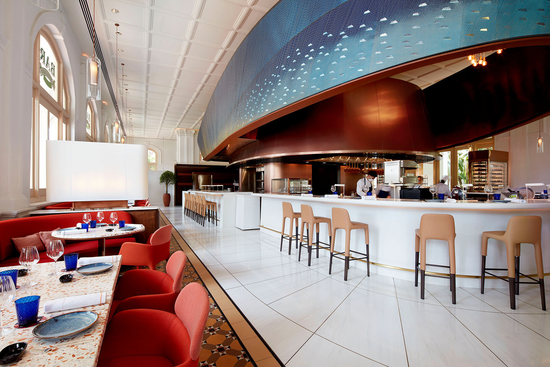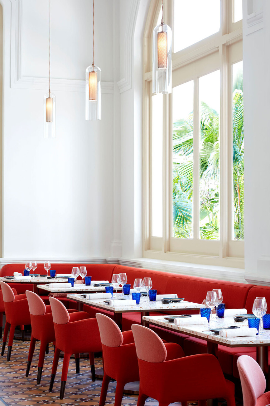 Studio Jouin Manku: When we design a project, the most important thing for us is not to create a static space, but to evoke emotions in people. Adjacent to a lush garden, we wanted to create a sense of wonder in this very colonial space when you enter. Starting from the spectacular sculpture glittering on the ceiling, we wanted people to discover the social life in it - the culinary, the social life, the sharing. So in the middle we have the theatre and around it the comfort. From there, you gradually move to the back of the space and discover a cosy bar.