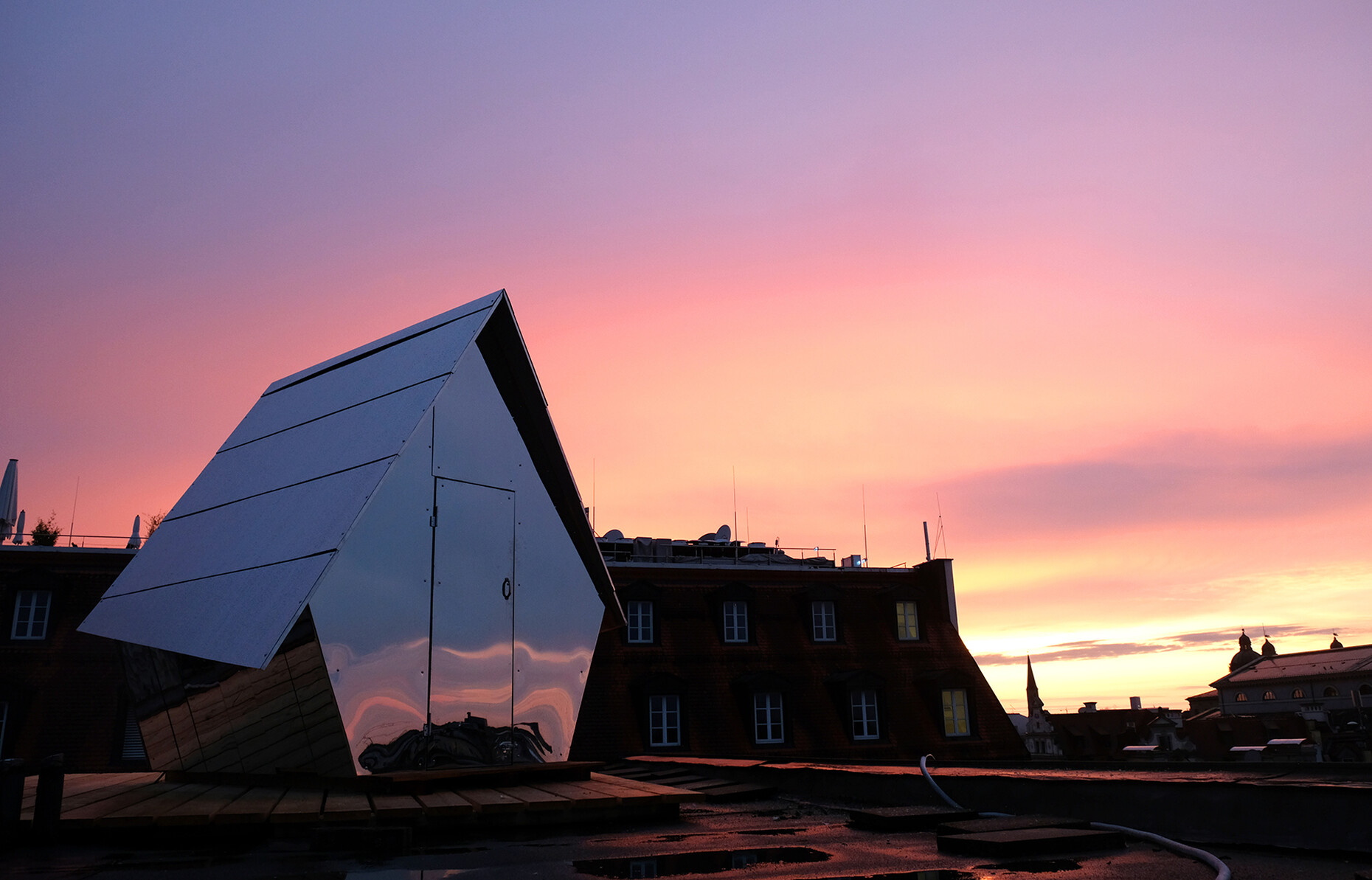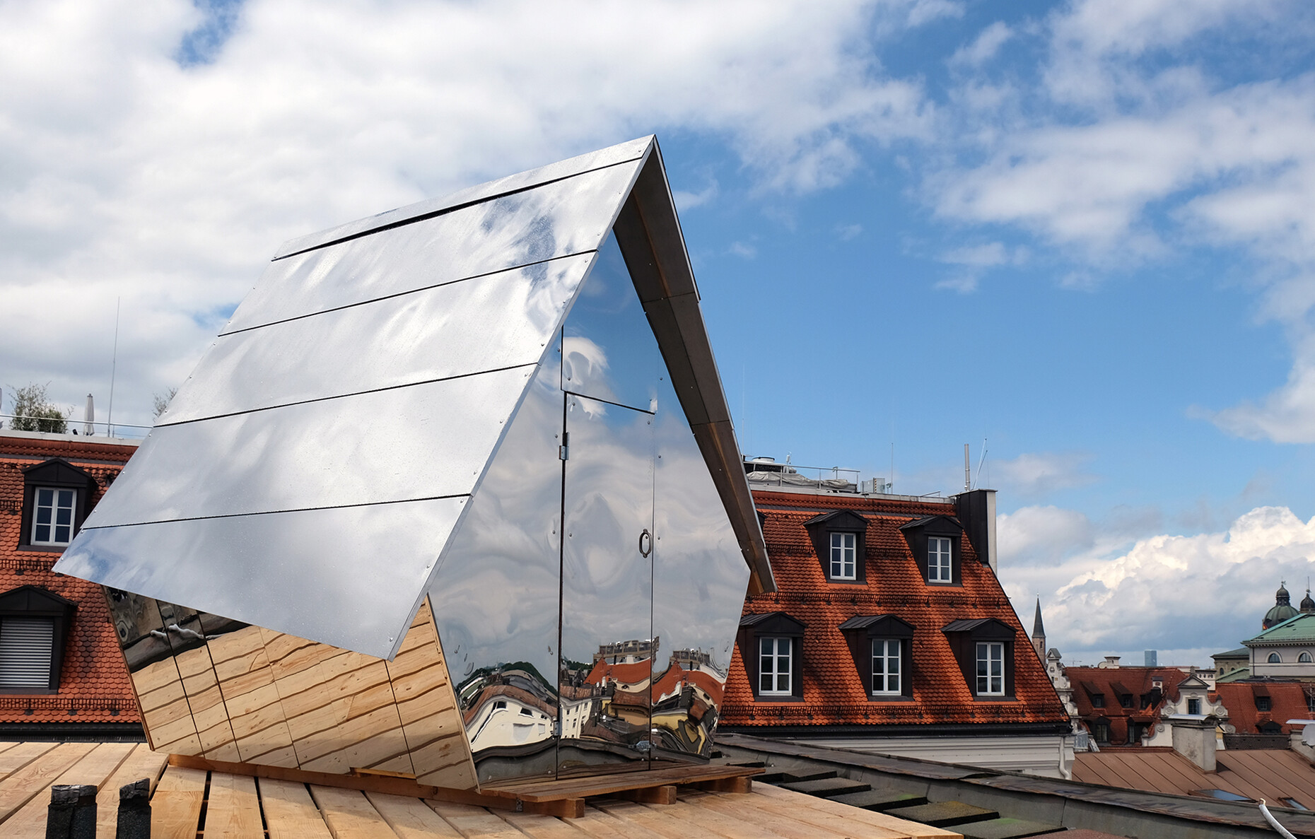 “The living areas, those free spaces where you can be creative, now they are getting ever fewer and far between – and ever more expensive,” says Jakob Wirth. The art and sociology student teamed up with a friend who is an economist, and calls himself Alexander Zakharov for the campaign, to devise the Tiny House. Built from recycled wood, Multiplex panels, clad in sheets of stainless steel and mirror foil, the result boasts 3.6 square meters of living space with a customized interior – a bed, a desk, two gas-fired cooking hobs, a washbasin complete with water tank, and a compost toilet. A basic fit-out for a small space. What is extra-special is the location of the house, as Wirth and Zakharov have positioned the mini-penthouse at regular intervals on buildings in prime downtown locations – without the owners noticing. “Precarious and privileged” is what the two creators call their housing. While you don’t get electricity, you do get a great, uncluttered view out over the city. The stainless-steel cladding reflects the architecture of the luxury properties nearby – and the sky. The “Parasit” blends with its surroundings, because it needs camouflage in order to remain undiscovered for as long as possible by its “host”, the owner of the building on which it is perched.