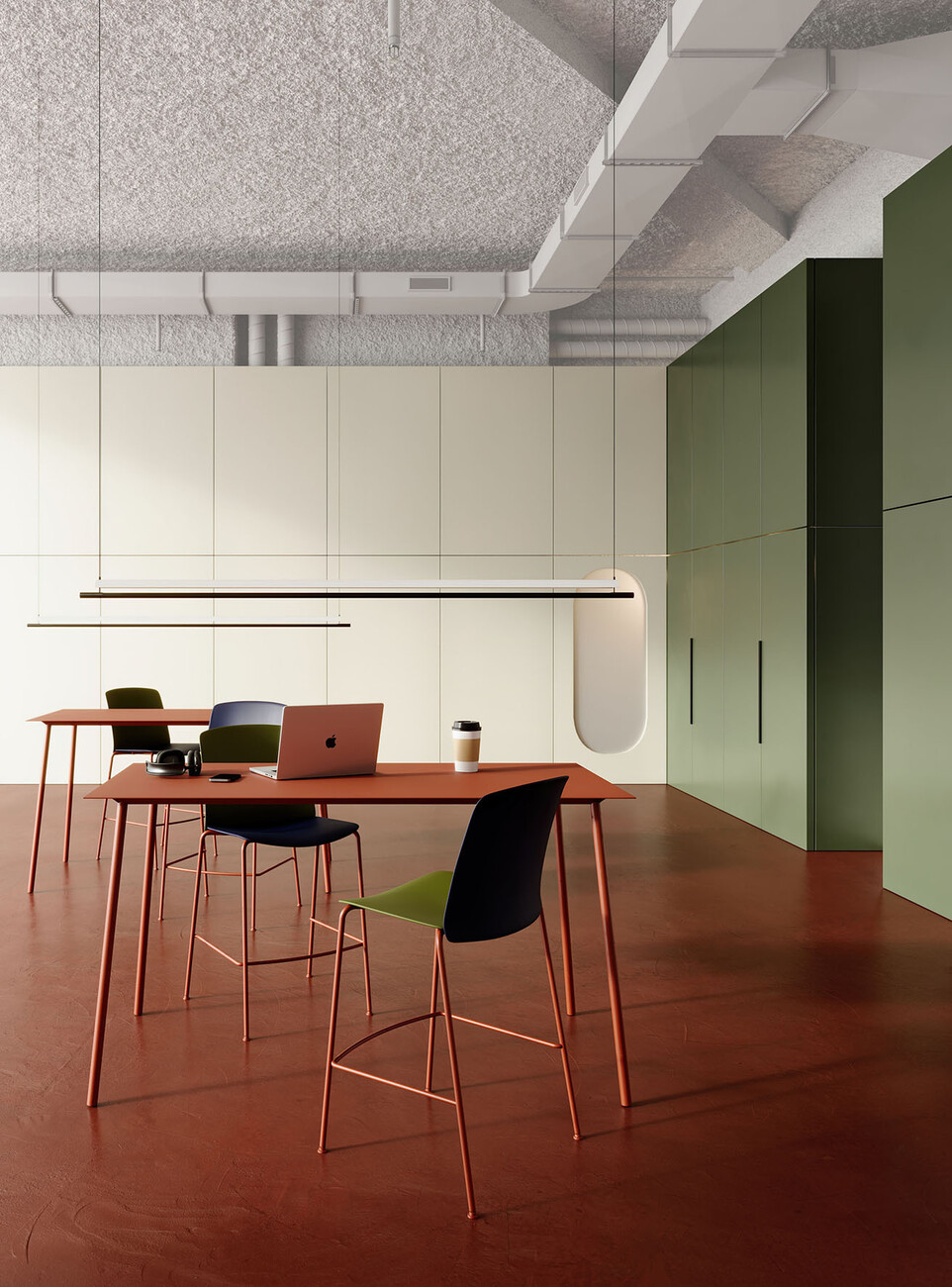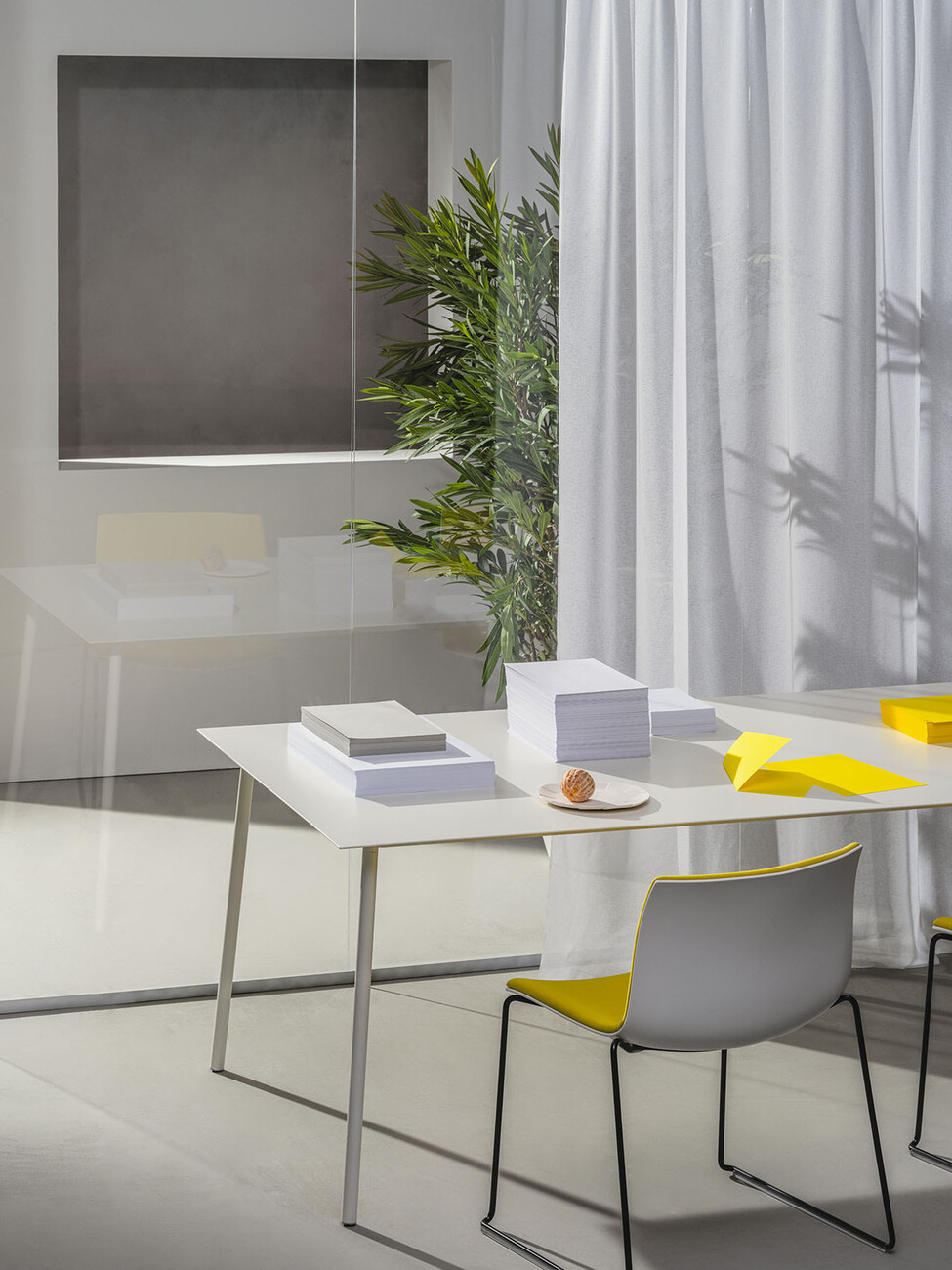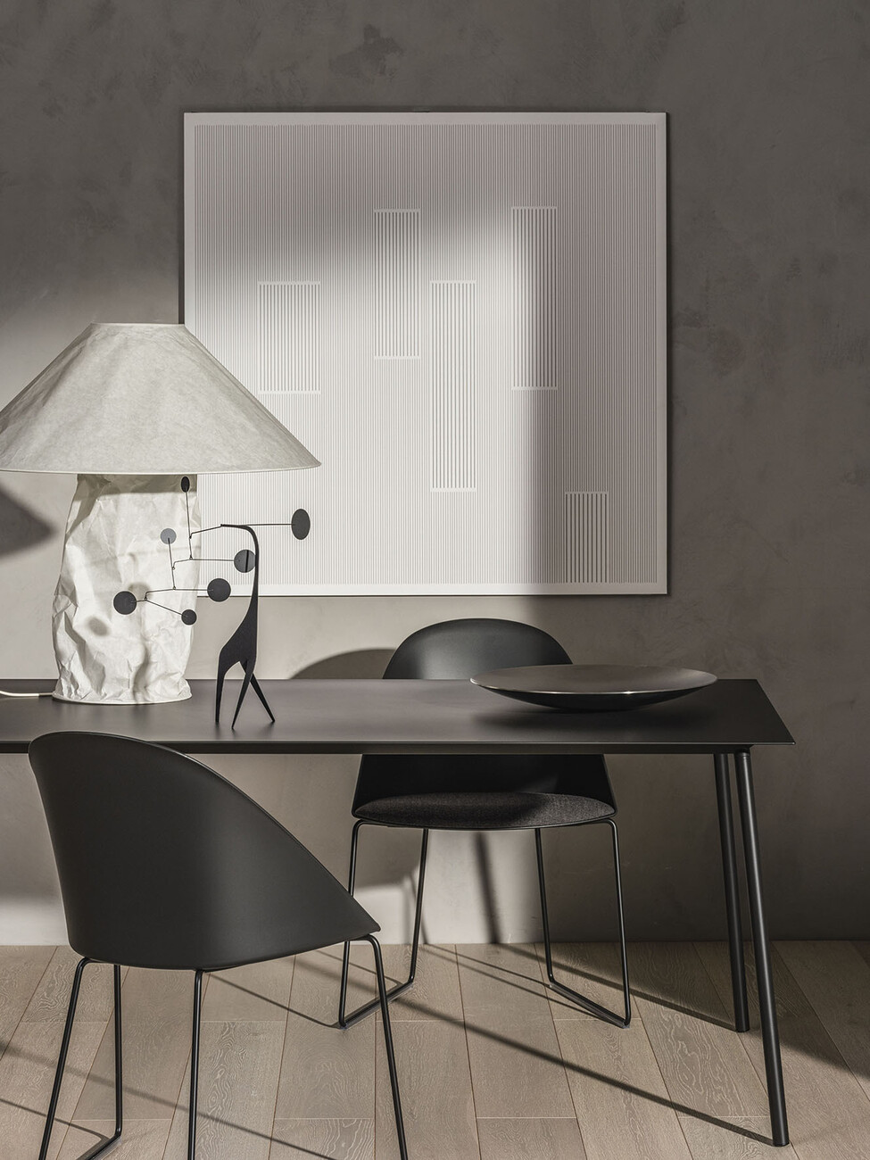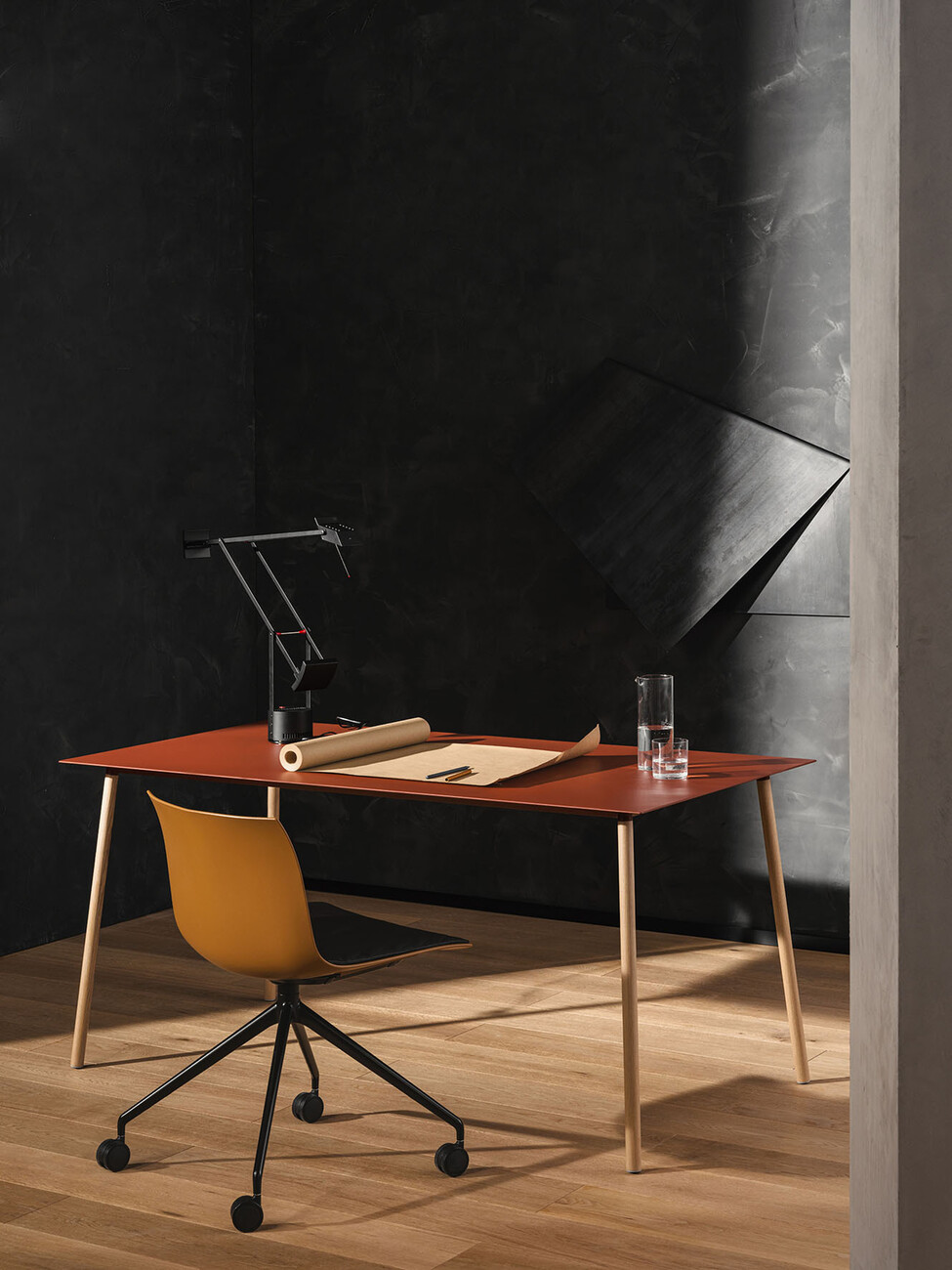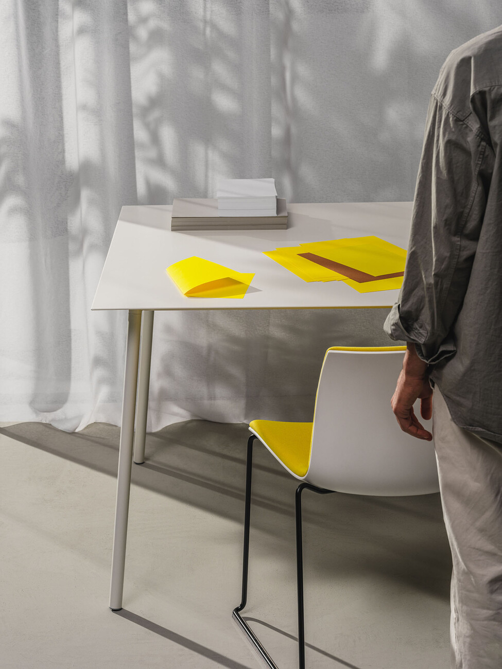Peter Kunz: There are enough tables already. In my opinion, the only reason to still design a table today is in constructions and production methods that open up new possibilities. At "ONEMM" we only design with one material in the sense of sustainability. As a result, the table is very light and even I could hardly believe that it has such high stability. With the Monocoque technology, the sheet metal is cut with a laser and then folded. I was very fascinated by the possibilities this offers. Instead of the usual structure of a table consisting of a frame and a top, we thus have the essence: a top with four threaded sleeves into which I can turn the legs without tools. What's more, the components can be easily stored in a flat cardboard box. The fact that the table takes up so little space when disassembled also has great advantages for storage. The nice thing about working with Arper is that the claim of sustainability is not just an empty phrase, but is actually lived by the company.