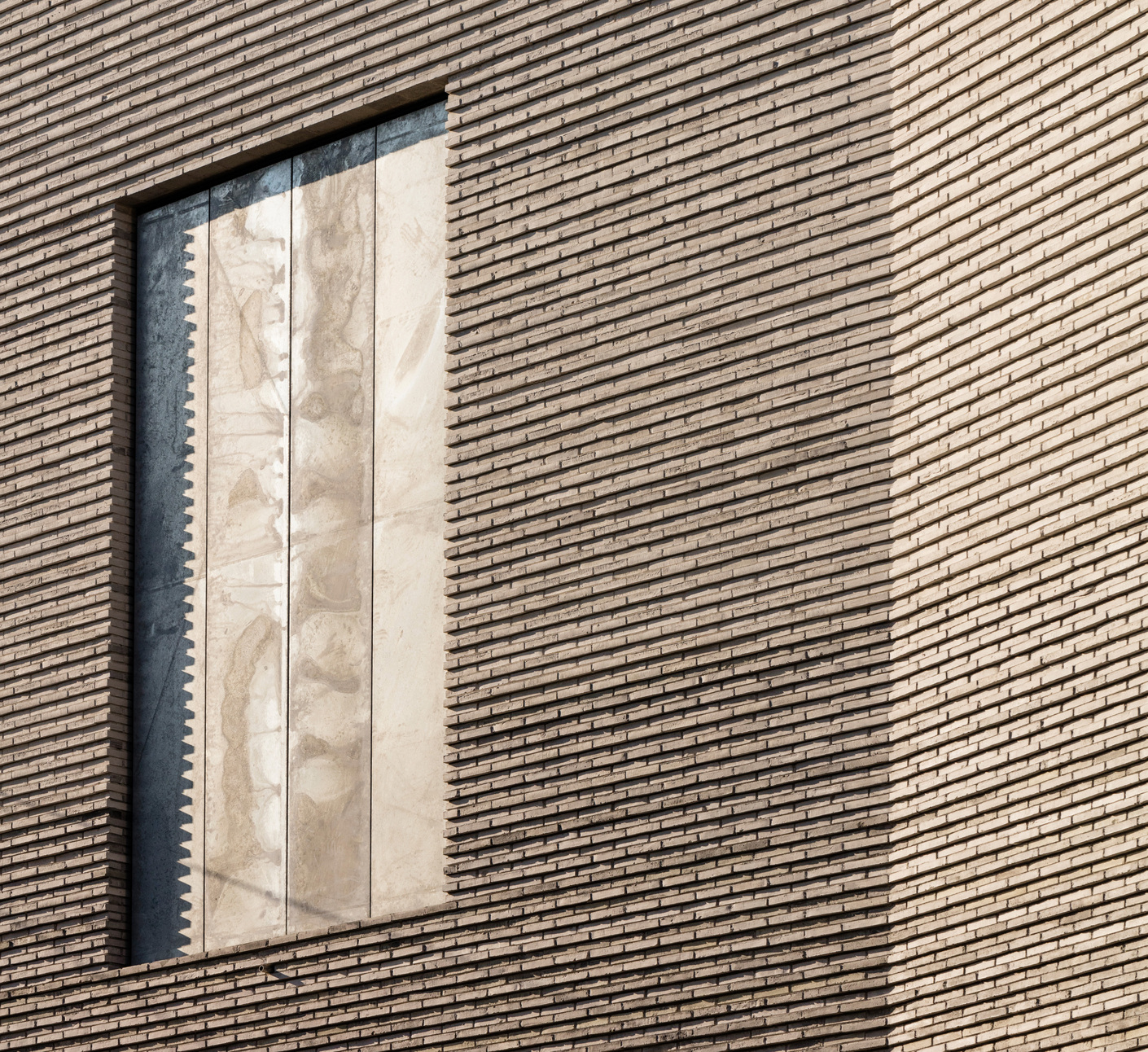 Handmade clinker bricks with a color gradient of light to dark gray form the façade of the five-story structure, with the darker rows close to the ground giving the impression of a firm anchoring. The narrow D91 and D11 bricks, which Petersen produced specially for the cladding, subdivide the building into horizontal bands. Owing to the omission of expansion joints between the projecting and recessed brick inlays, the surface appears to be one continuous piece and creates delicate silhouettes depending on the incidence of light. Then, in the evening, 12 meters up above the ground a large LED light frieze wraps its way around the building. The brightness of the individual letters adapts to the respective outdoor light situation by means of sensors. In order to be able to position the LEDs in the closed shell, Petersen produced hollow bricks. The special thing about the frieze is that the LEDs are recessed, meaning they are themselves not visible. (am)