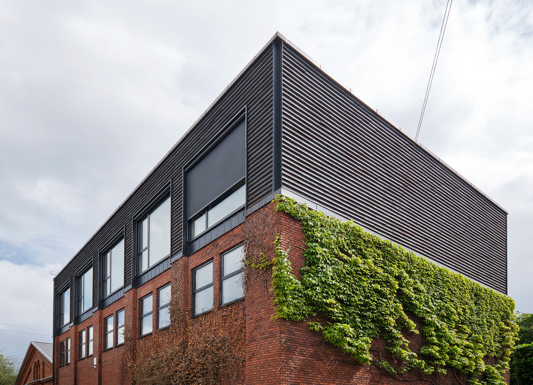 The extension was constructed using a Petersen Cover, a new brick cladding from the Danish brickworks, which is handmade in wooden molds. This creates a rough, varied surface that gives buildings a special texture. The color spectrum ranges from graphite gray to dark brown and violet hues, with some glazed areas. This is an advantage that Nodo Arkitekter also appreciates for the school project: "Using Cover instead of bricks makes the building look less monolithic because it breaks up the surface. The trick was to get the tone right, and we soon found ourselves drawn to C56, which alternates from graphite grey over dark brown to lilac hues. Some of these shades are also found in the red-brick façades, but the brick is quite dark overall. The contrast with the red bricks underlines the impression that the recent addition could be a roof."