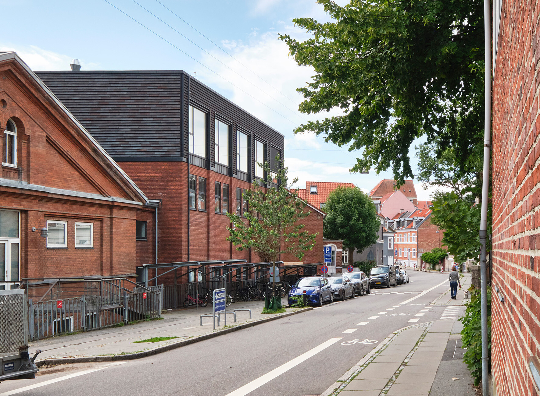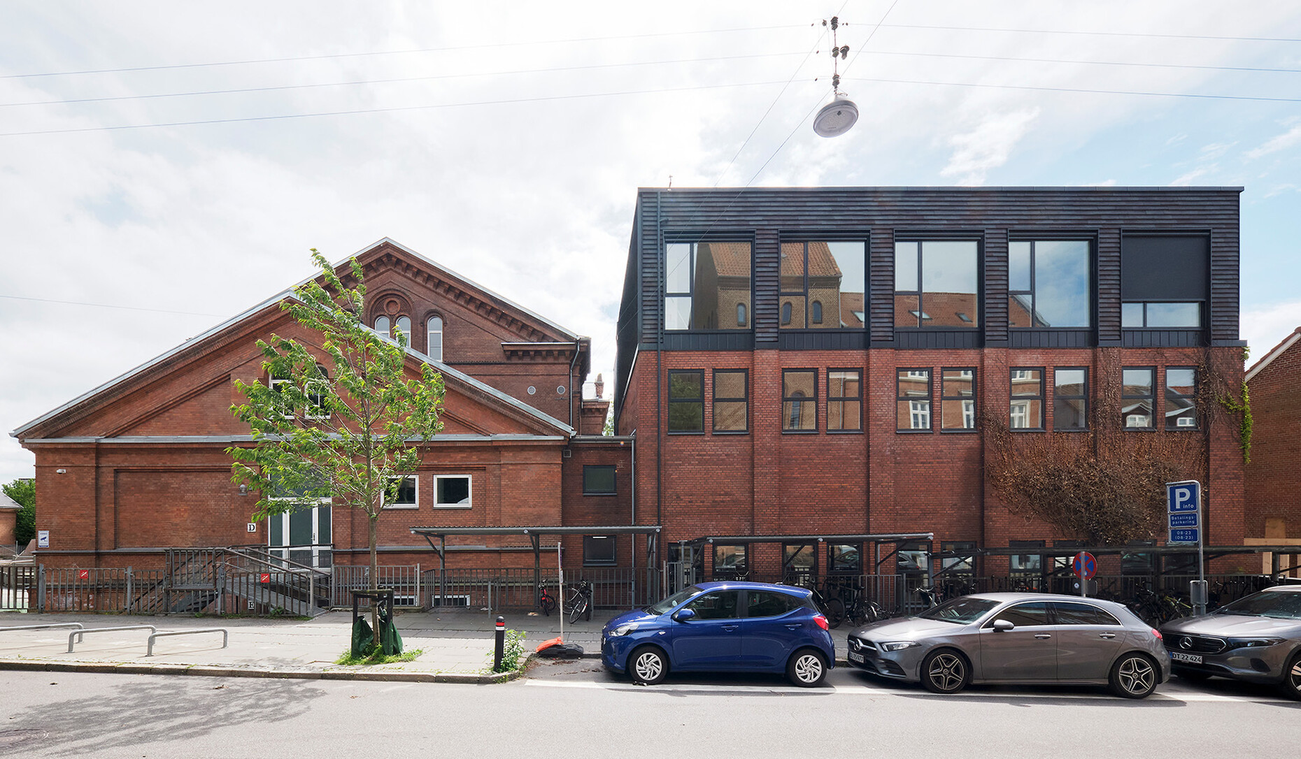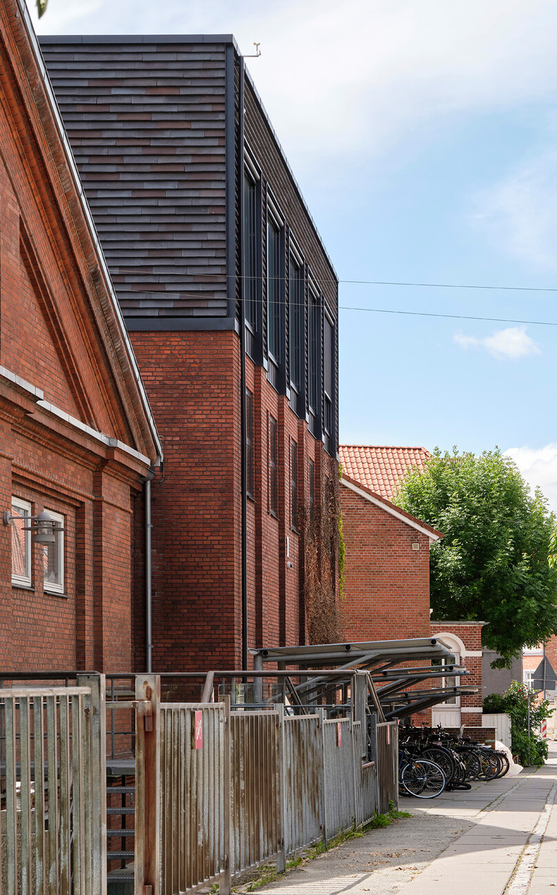 The school consists of a group of buildings that are grouped around a central schoolyard. The main building, a red brick structure running north-south, dates back to 1888. It is flanked by newer buildings that were constructed between the 1950s and 1990s. The team at Nodo Arkitekter had a special idea for the new assembly hall: the 165-square-meter hall was built on top of an existing two-story building from the 1950s, which is taller than the other buildings and formerly housed gymnasiums. The existing building has a simple aesthetic with smooth red brickwork structured by load-bearing columns. It was therefore particularly important to find a solution for the extension that would blend harmoniously into its surroundings, as Louise Balle Rosbjerg and Tinne Søndergaard from Nodo Arkitekter emphasize: