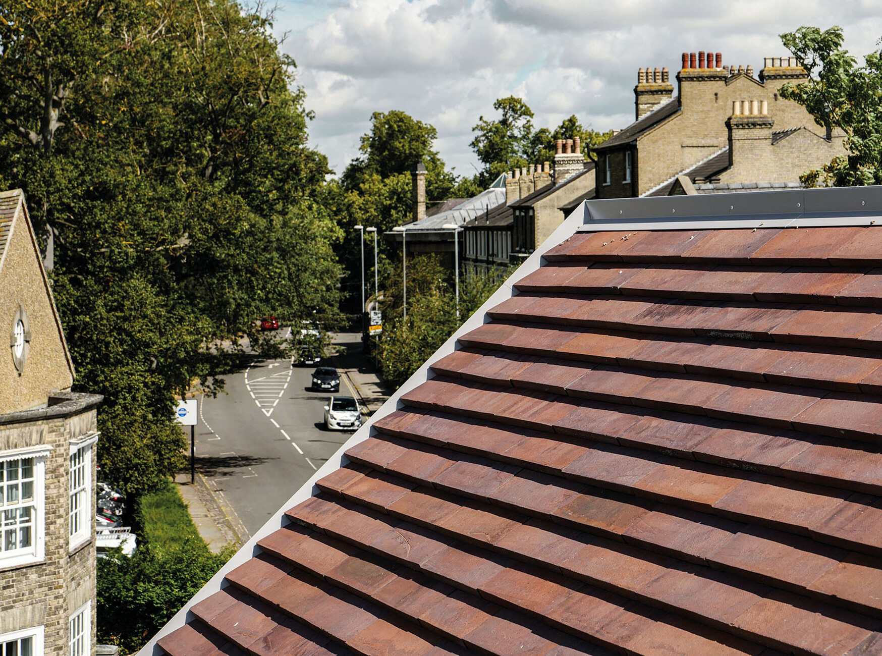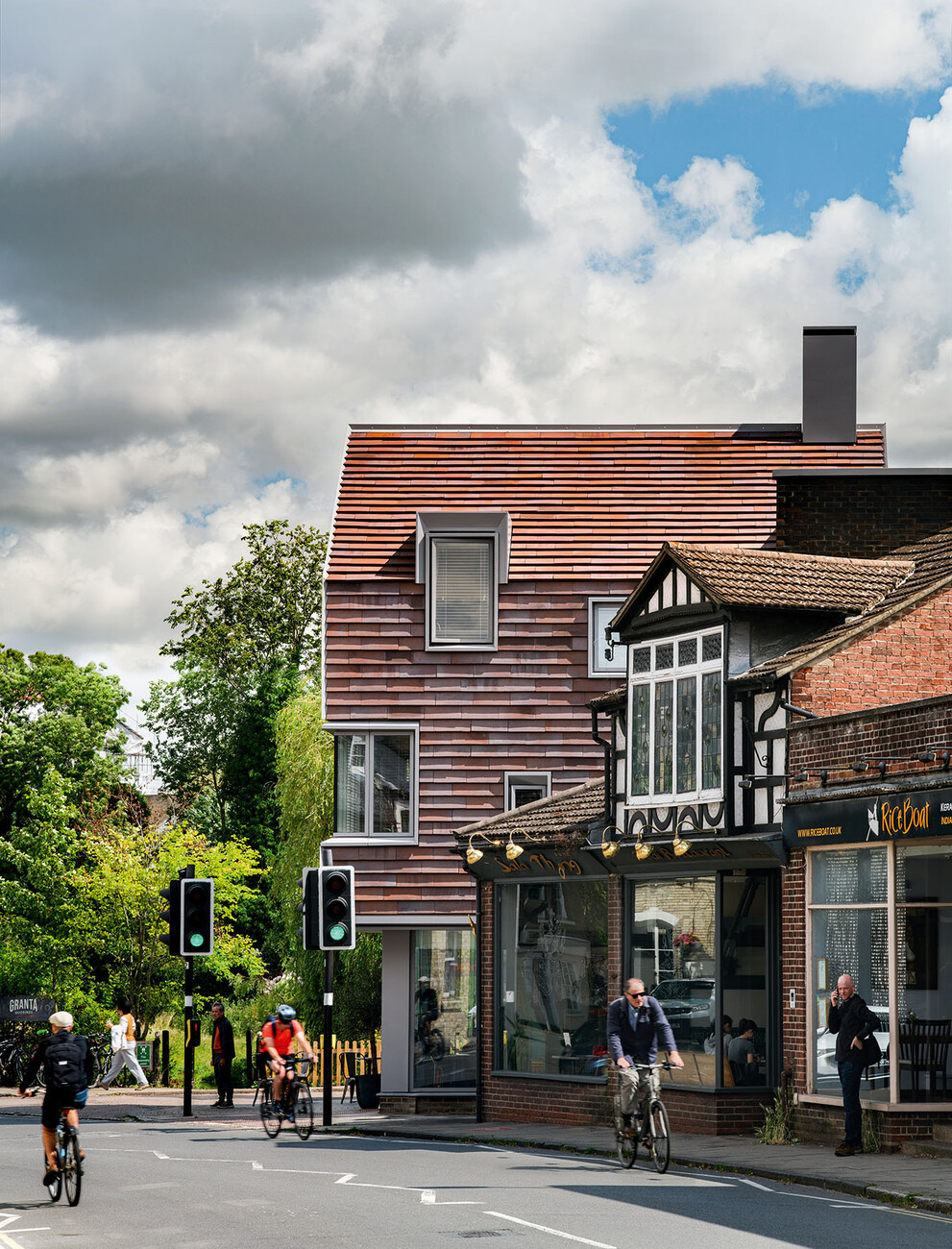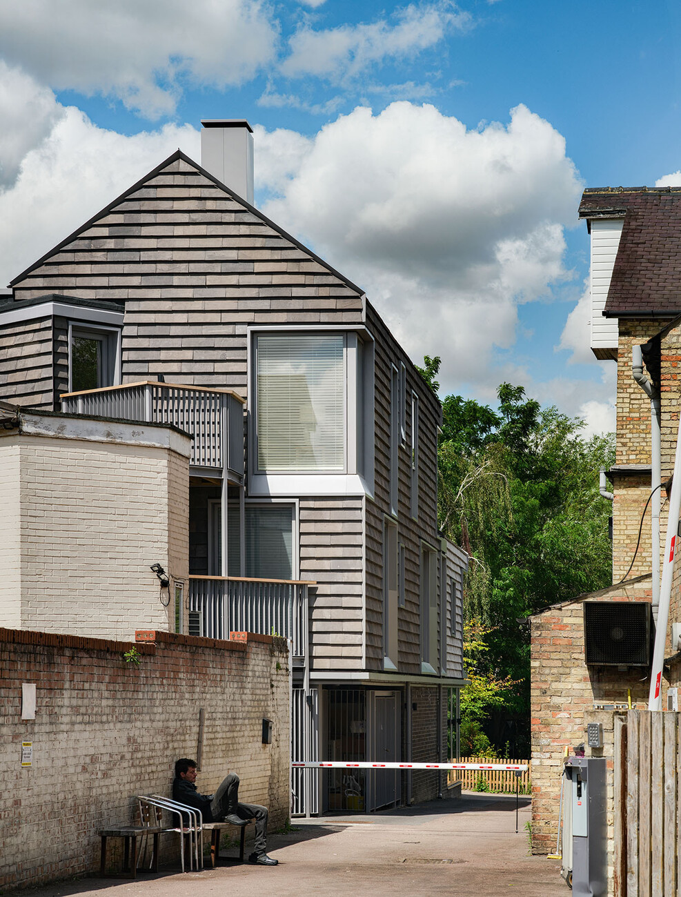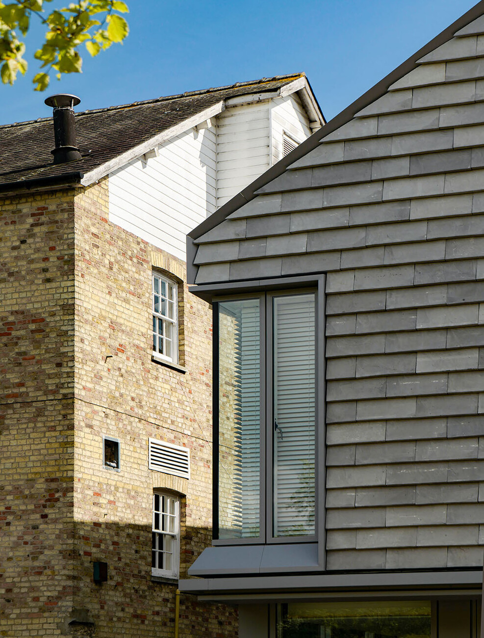 MCW Architects came up with an ingenious solution to the task of designing the structure such that it blends into the cityscape: They created a building complex that is comprised visually of three small units. From each perspective the elongated building with different storeys looks like three individual houses each with gables facing the water. The floor plan blends into the complex geometry of the plot and the neighboring building. MCW Architects explain: "We chose the Petersen Tegl 'Cover' tile for a number of reasons ... It was a reflection of our desire to design using a contemporary interpretation of traditional materials. It allowed wall and roof cladding to be homogenous, reinforcing the concept for three simple but coherent building volumes, and the color range available allowed each volume to be subtly different, enabling the scheme to nestle into the ad-hoc shifting urban character of its immediate context."