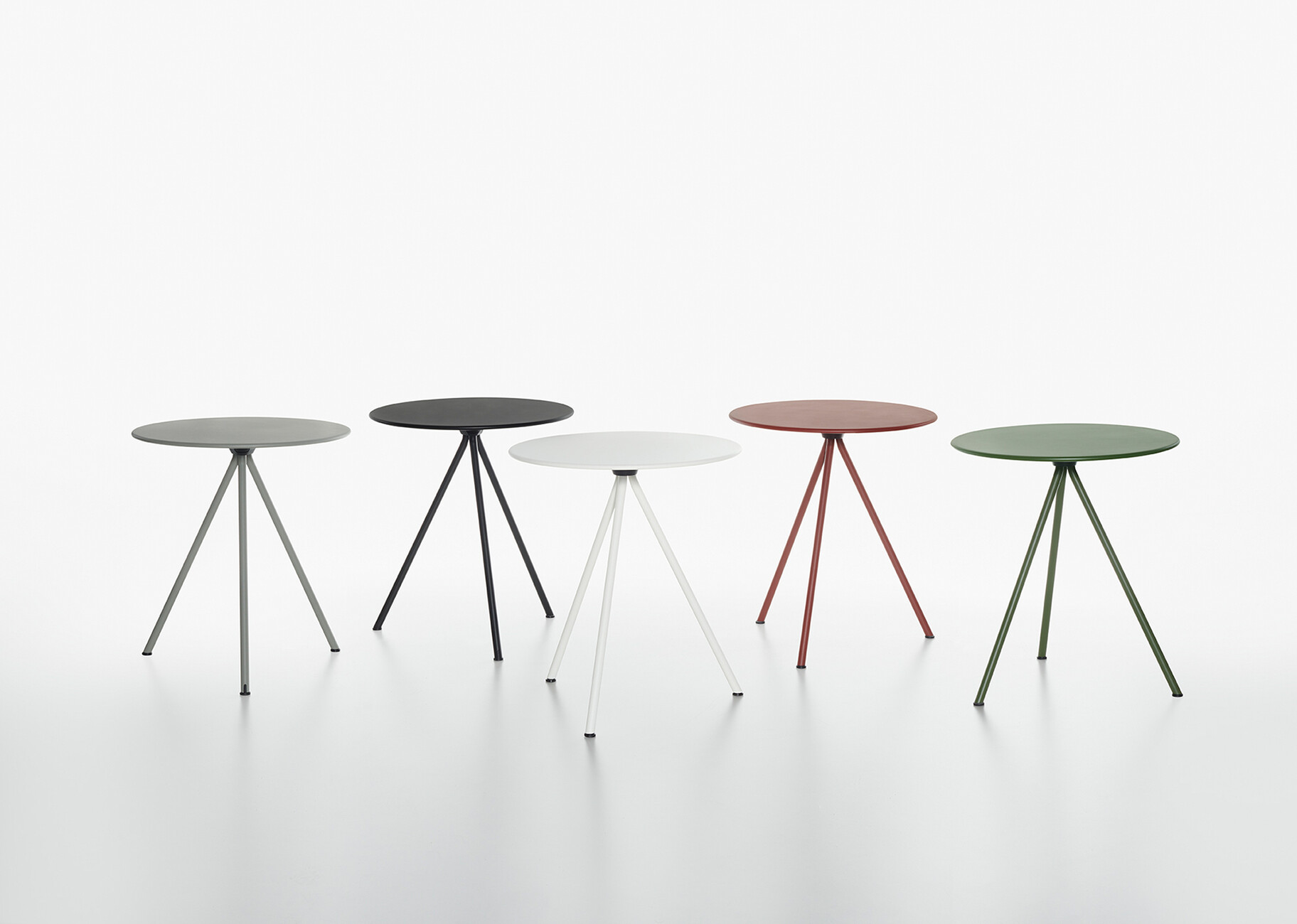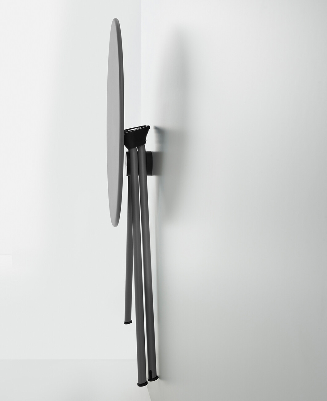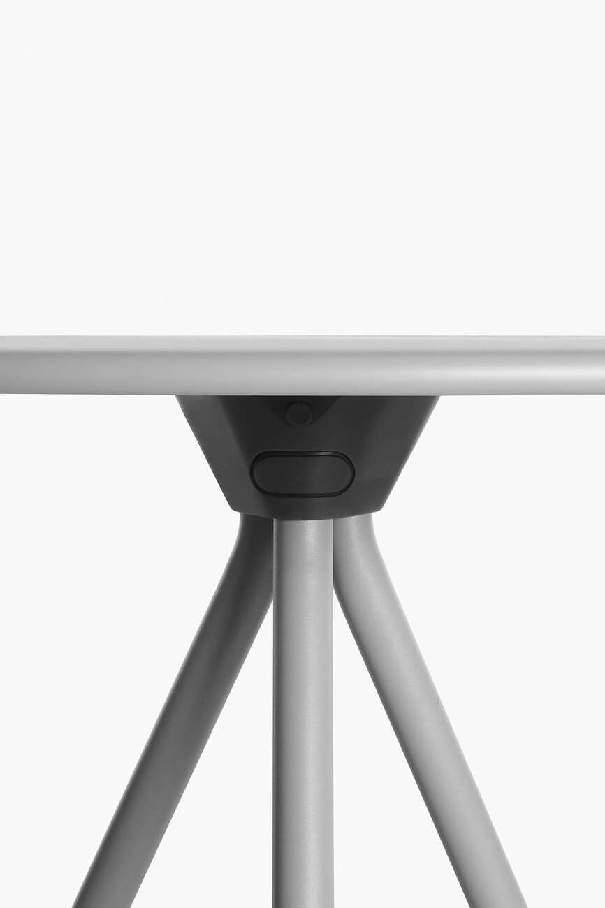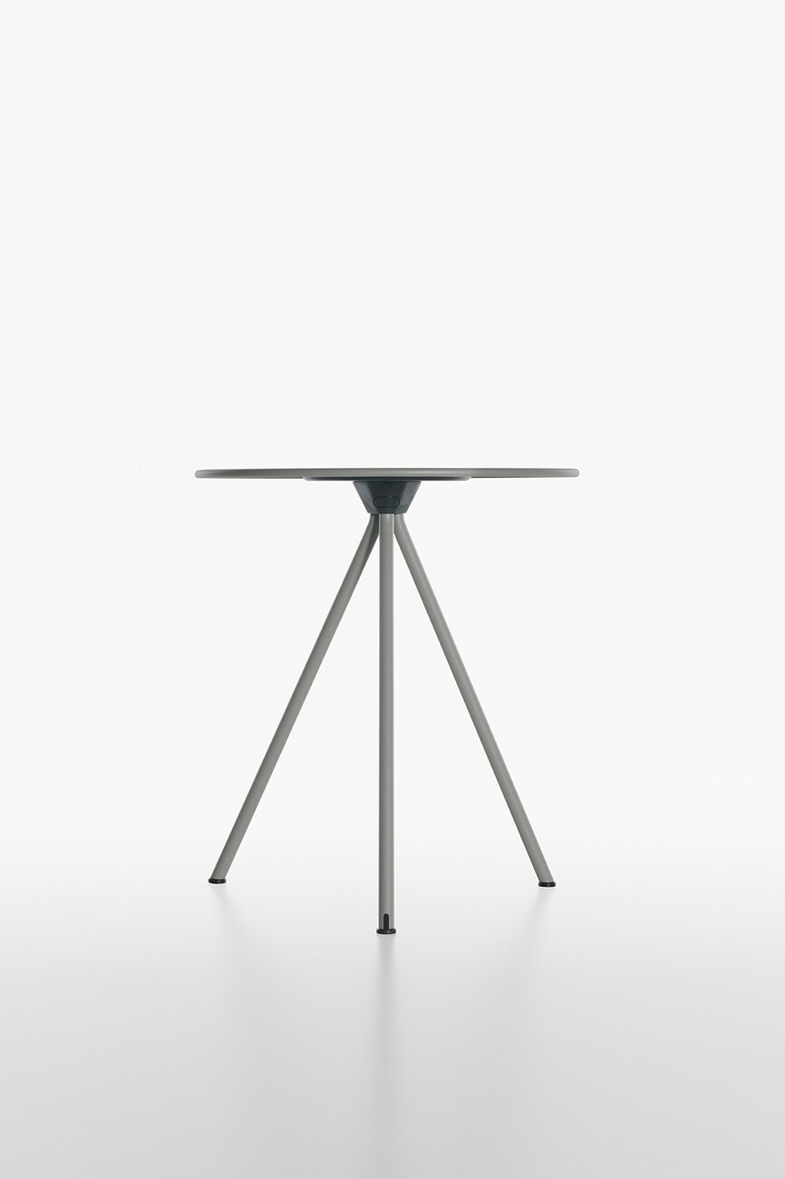 The design of the model made of galvanised powder-coated metal shows the essence of a table: three legs extending from the centre of the round top are sufficient for a stable stand. For the colour scheme, you can choose between black, white, oxide red, olive green and concrete grey. The possibilities for use are manifold, because thanks to the robust surface, "Randevu" by Cisotti + Laube for Plank can be used both indoors and outdoors. A tool is not necessary for the dynamic function of "Randevu", a simple handle is enough to fold or unfold the table. And if "Randevu" is not needed, it can be stored quickly and in a space-saving way – a special hook allows the table to be stored on the wall. The creative duo has also thought of resource-saving transport: "Randevu" is delivered pre-assembled in flat packaging. If the folding mechanism is not desired, Plank also offers a version that always stands upright. (am)