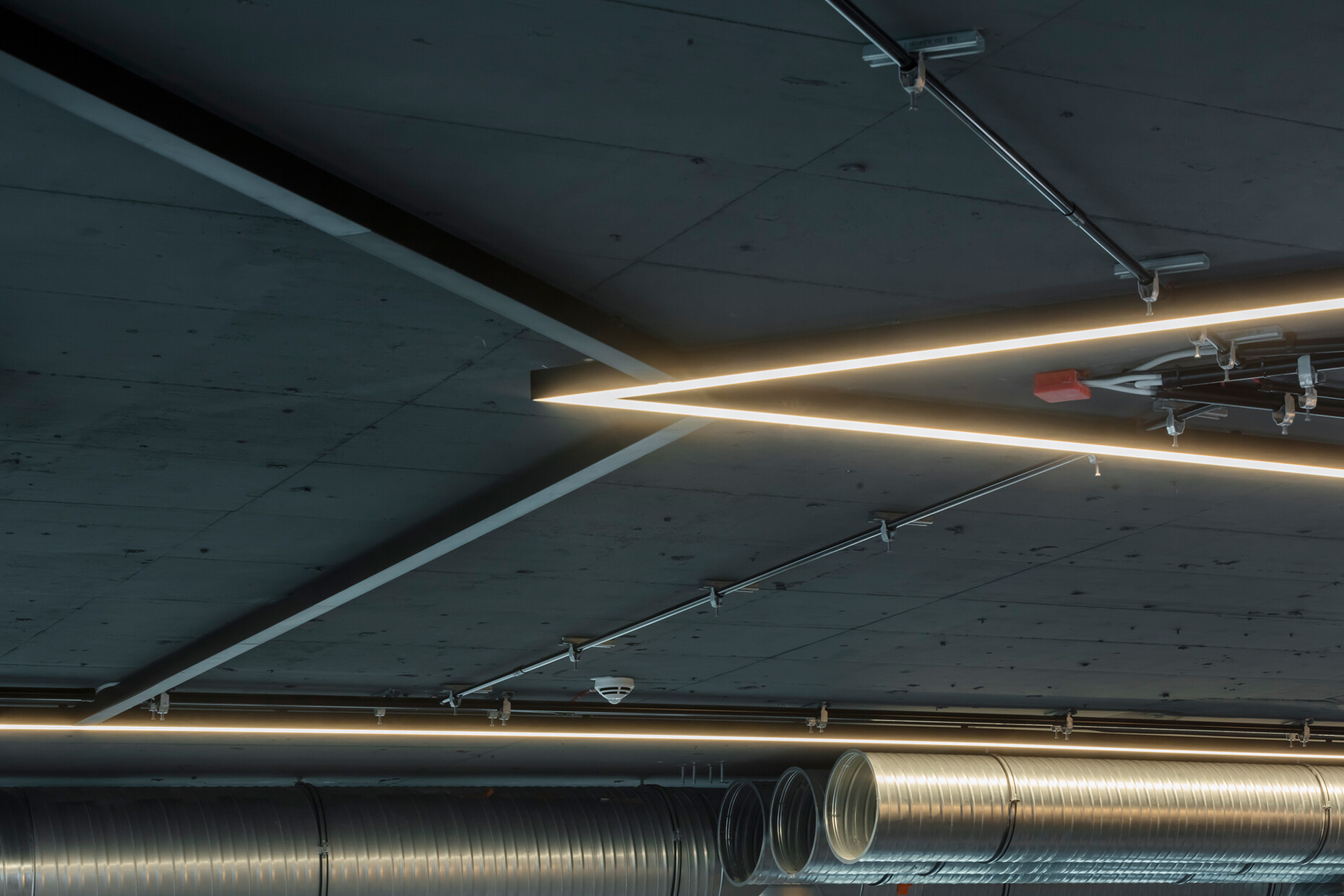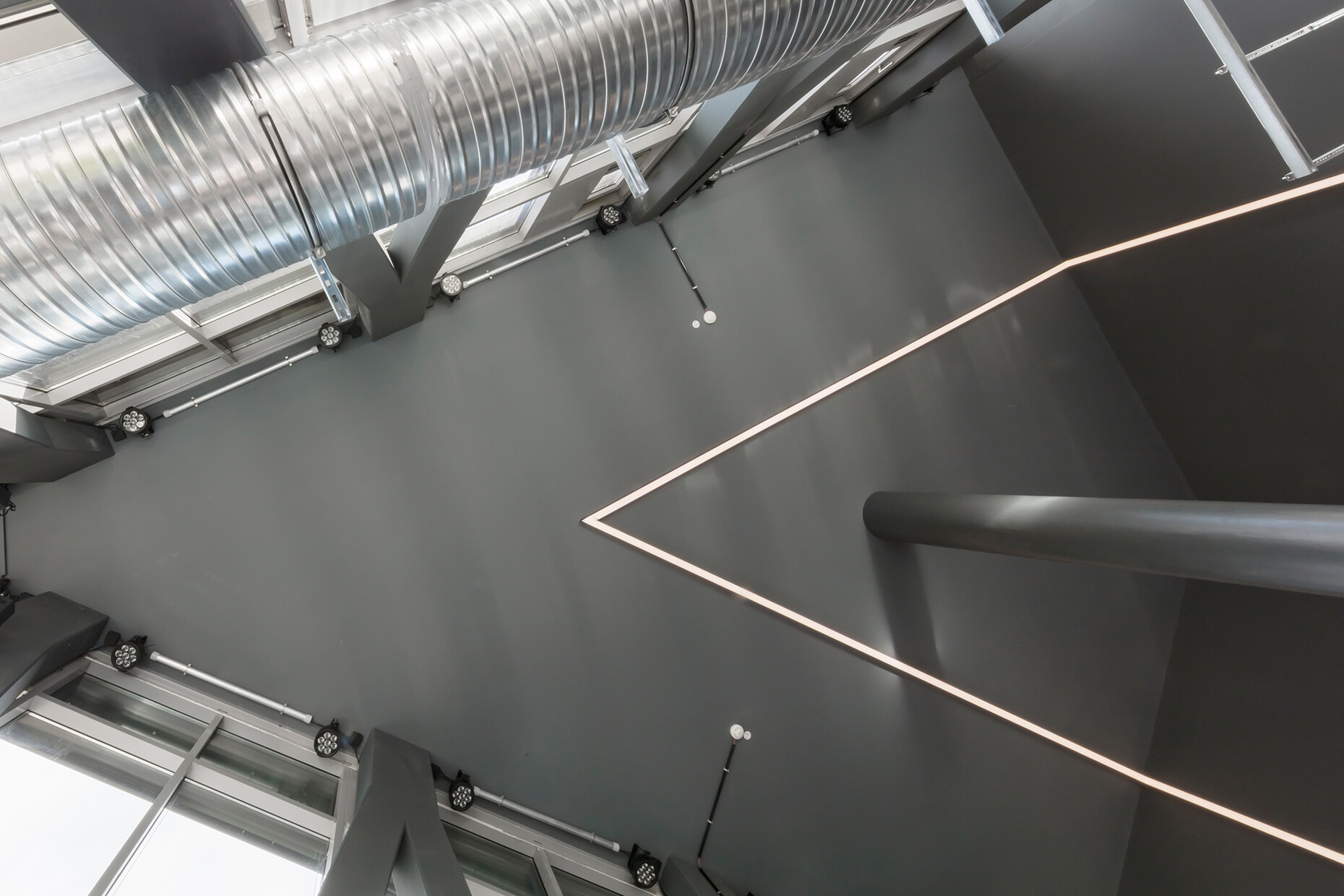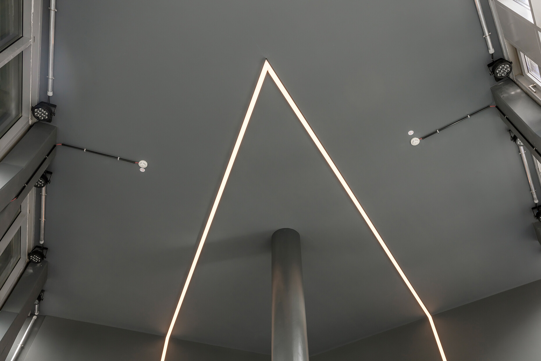 To this end, they follow the geometry of the V-shaped room, bridge various ceiling projections and form a precisely placed peak in the entrance area. Parallel to this, another light line runs close to the interior wall, its right-angled branches guiding training guests to the adjoining rooms with changing rooms, showers and toilets. As the basis for the light lines, the planners chose the aluminum profile "L-Line Standard 24", which was mounted directly on the reinforced concrete ceilings. With a width of 60 millimeters and a height of 50 millimeters, it offers enough space to accommodate the mounted LED strips together with the control gear and all the wiring. In addition, the power supply units in slimline design and the DMX dimmers are also housed there. White opal plastic was used as a cover for the aluminum profiles, which ensures uniform and soft light distribution.
