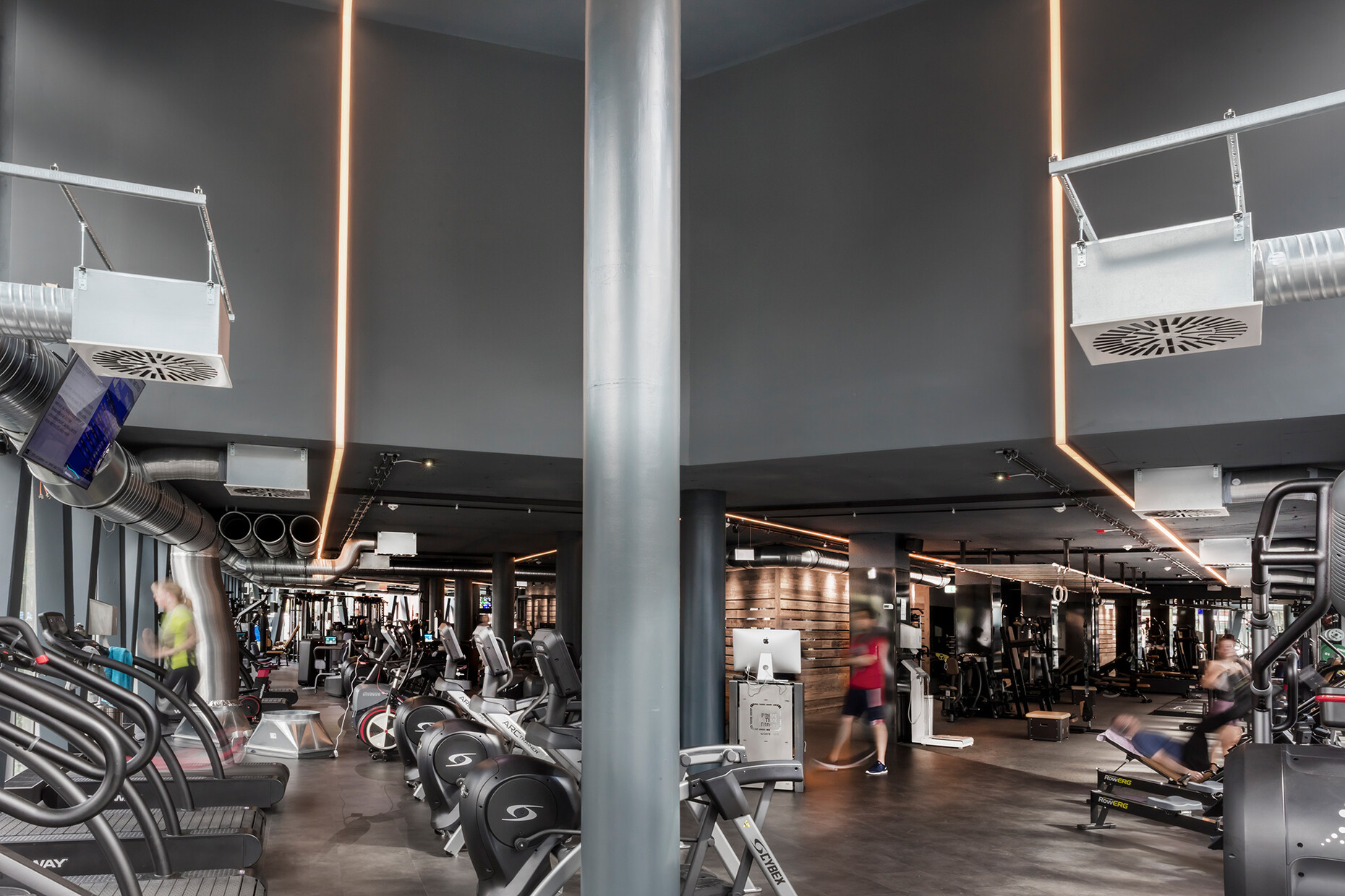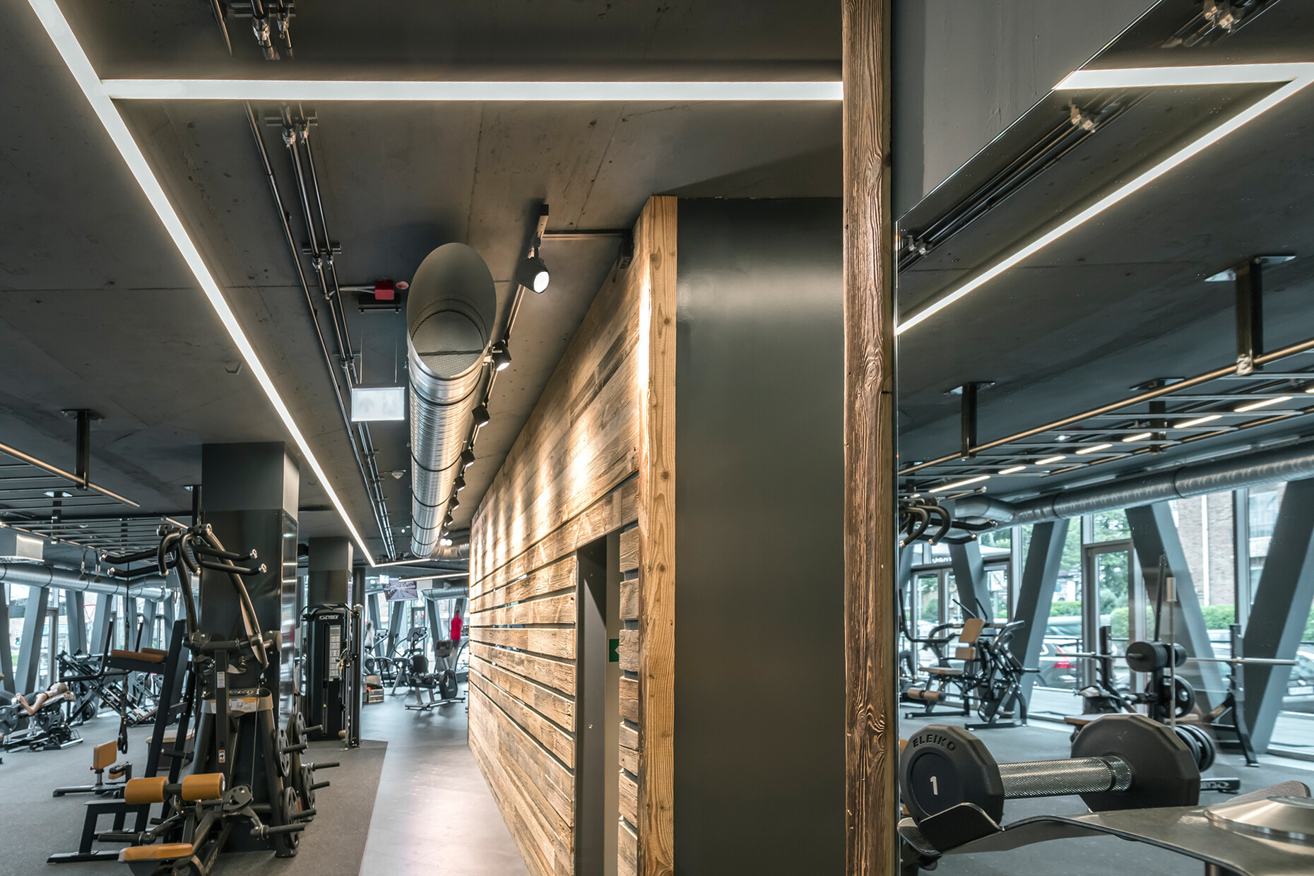 To this end, the interior design developed by the club operators in collaboration with Thomas Hess of Plan A Architekten picks up on the chain's corporate design: Surfaces such as floors and ceilings are laid out in a dark gray palette, creating a contrast with the silver metal pipes that have been visibly mounted on the concrete ceiling. Wall paneling and fixtures are made of wood, while the exercise equipment has a uniform dark finish and honey-colored seat covers. A special role is played by the lighting concept, in which the planners from Sota – a consulting firm specializing in fitness studios – worked with linear LED elements from Proled. This results in continuous light lines with a total length of 180 meters, which on the one hand take over the illumination of the training areas and ancillary rooms, but on the other hand also develop a strong graphic effect in the room.