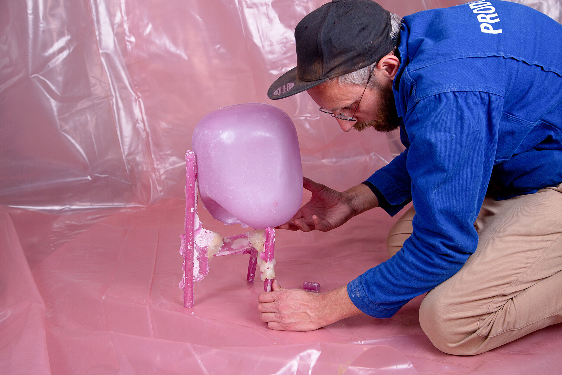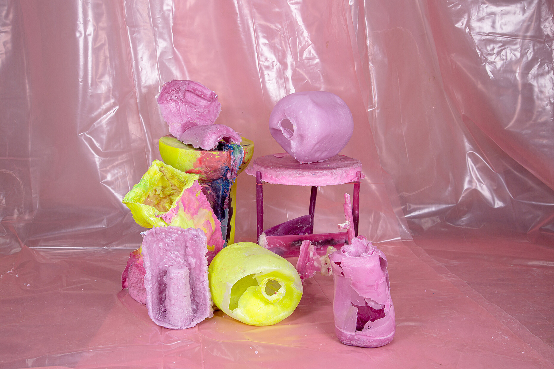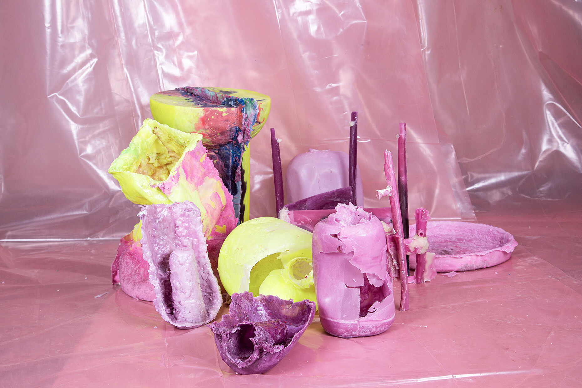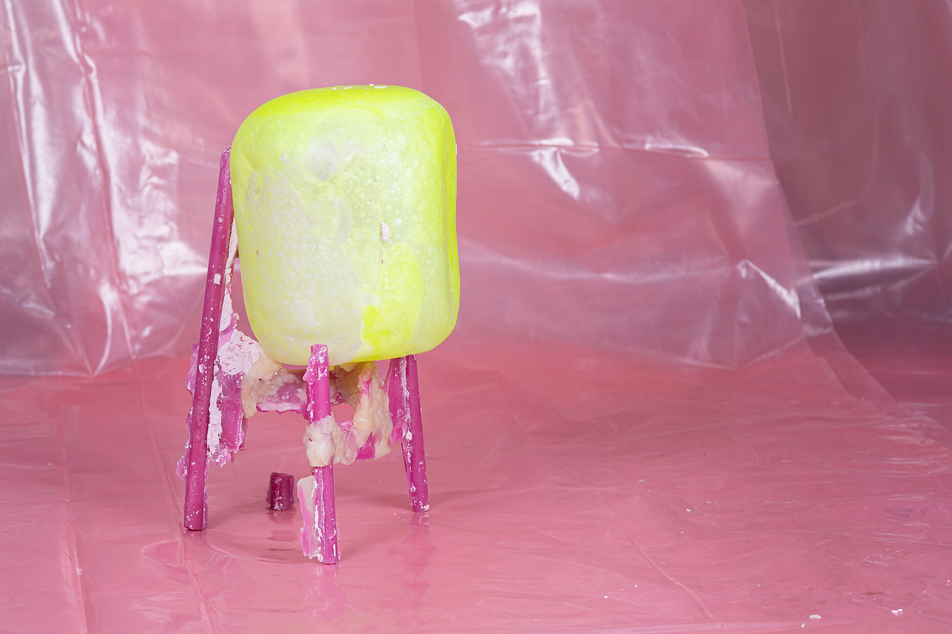 Letting processes happen, accepting a loss of control and instead gently guiding the material which anyhow has a life of its own and is subject to the force of gravity; this letting go is a challenge Treindl has also taken on for the first artist‘s edition of the pulpo catalog. For the performance the products of the portfolio such as “Container”, “Alwa” or “Oda” by Sebastian Herkner, were covered with molten wax which Treindl then let harden, thereby producing fragmentary objects, whose original form is only vaguely recognizable. These represent a homage to the designer, but also form a fascinating contrast to them as regards the requirements that they are constantly expected to meet. While the design object would ideally like to be owned in a state that remains unaltered throughout its life, the structure, color, feel and lifespan of its rudimentary moldings in wax cannot be influenced. “The idea was to mold the design object in a fragmentary fashion in a different context so as to create a reminder of sorts of the original state,” says Treindl. And in doing so intervenes in the hierarchical pyramid of material and final product as with the refinement of the steel mats in the production of the side table. While in that case he declares the material the final product the final product for the “Wax Object Edition” serves him as material. As such, the figures created in this manner are temporarily present, lack any function beyond that of their mere existence, and readily oscillate between the worlds of design and art. “Letting go is the operative word,” says Patrick L'Hoste.