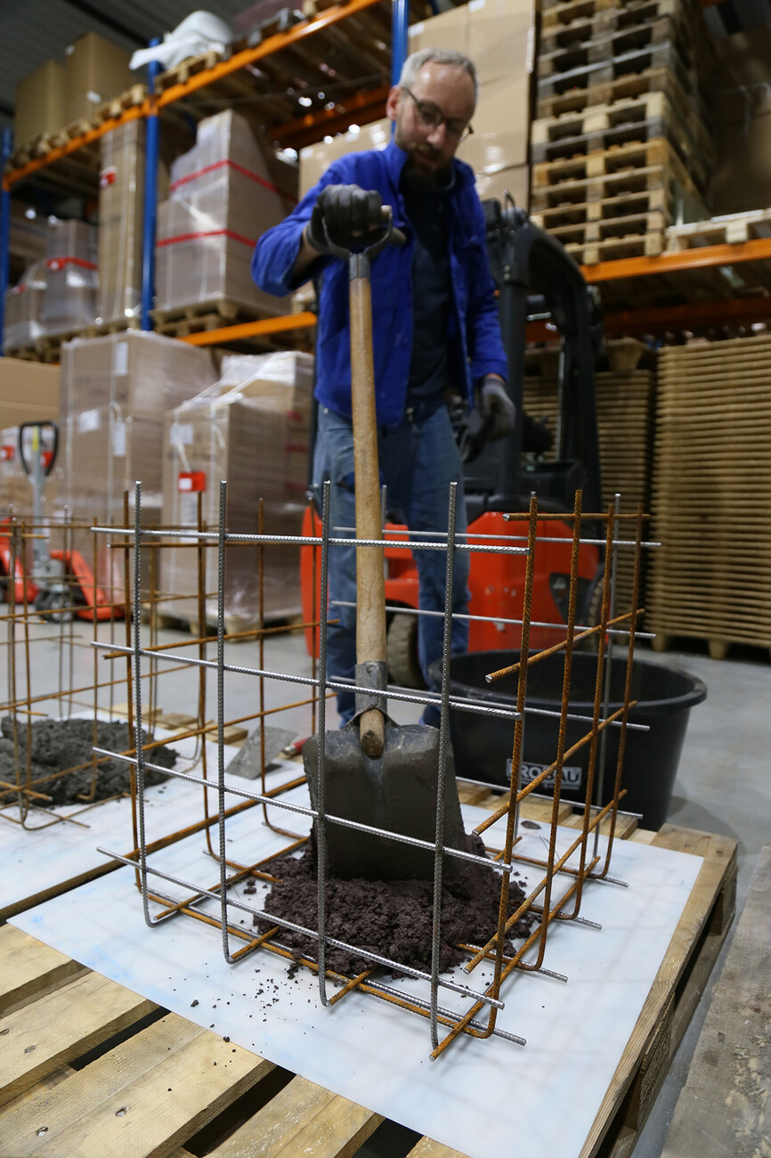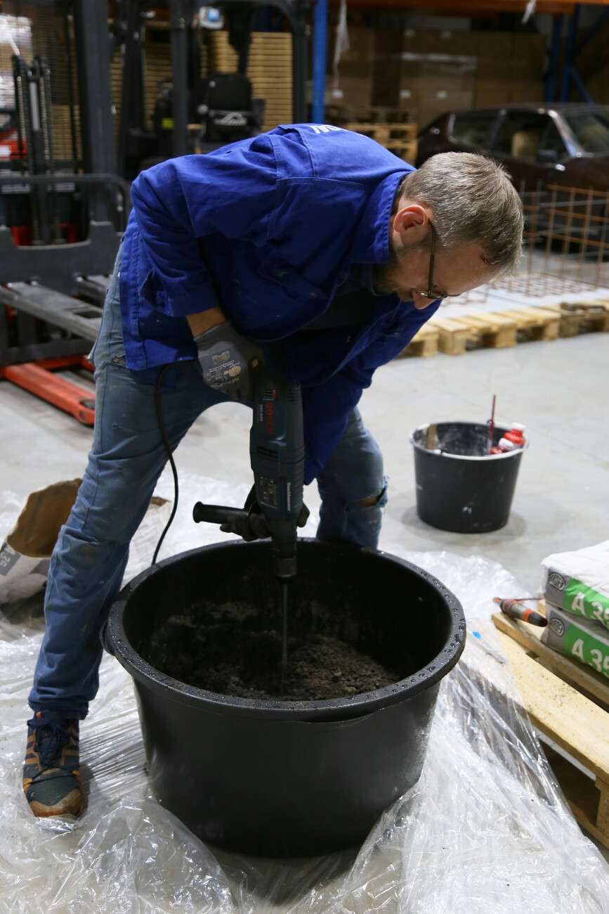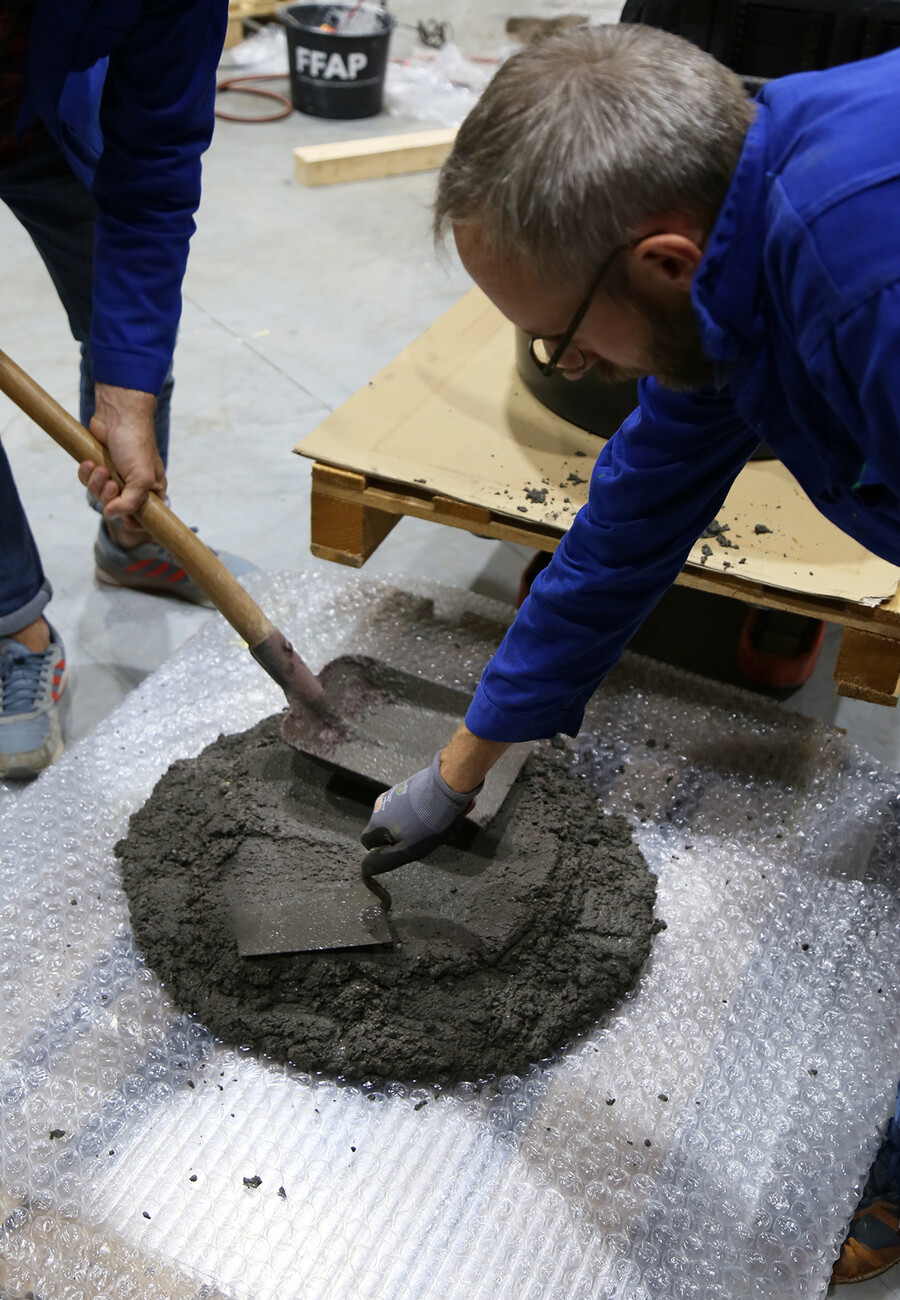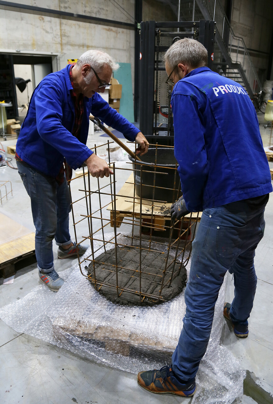 The idea for this unusual side table first came to Samuel Treindl and Patrick L'Hoste some four years ago when in a spontaneous action Treindl transformed the “pulpo Galerie” in Lörrach near Basel into a luxury construction site in the form of his “Research Center for Anarchistic Production”. A ceramic mixing element combined the concrete with gold leaf and simultaneously incorporated its own precious constituent ingredients. Visitors were able to experiment with and experience the difficulty involved in the pouring the concrete and see how even an amateur can be a producer but that even inability has to be performed with skill. “The right pouring method is on a par with any highly-technological process,” argues Treindl. In order to achieve the necessary perfection in the imperfect a clear stringency is needed in the procedures that Samuel Treindl has perfected. “Every step he takes is well thought through,” says Patrick L'Hoste, who together with Ursula L'Hoste founded the company pulpo a good 13 years ago. And back then there was already an affinity with art and young, fresh approaches: “Many of our ideas come from art,” summarizes L'Hoste. And indeed, works by young talented artists are regularly presented in the “pulpo Galerie” alongside selected objects from the pulpo product portfolio. Design and art go hand in hand for pulpo, there is no need to draw a dividing line between the two. What counts are liberal approaches and a consistently high quality of craftsmanship in the production by European manufacturers. An eye for the details is also important in the side table by Samuel Treindl for pulpo, which is currently still in the prototype phase: “The process of production will never be identical a second time around, but you need an environment in which the process works,” argues Treindl.