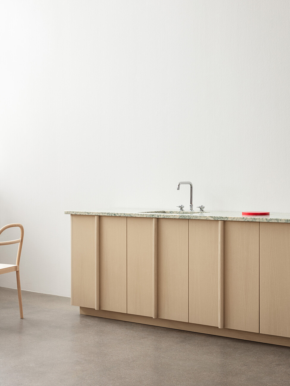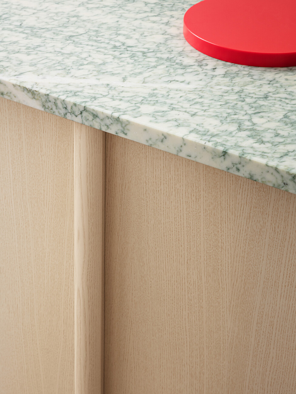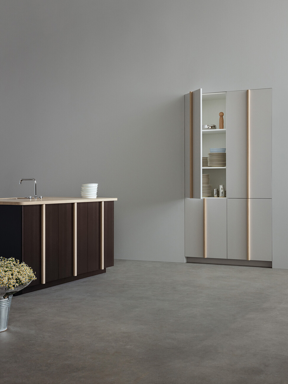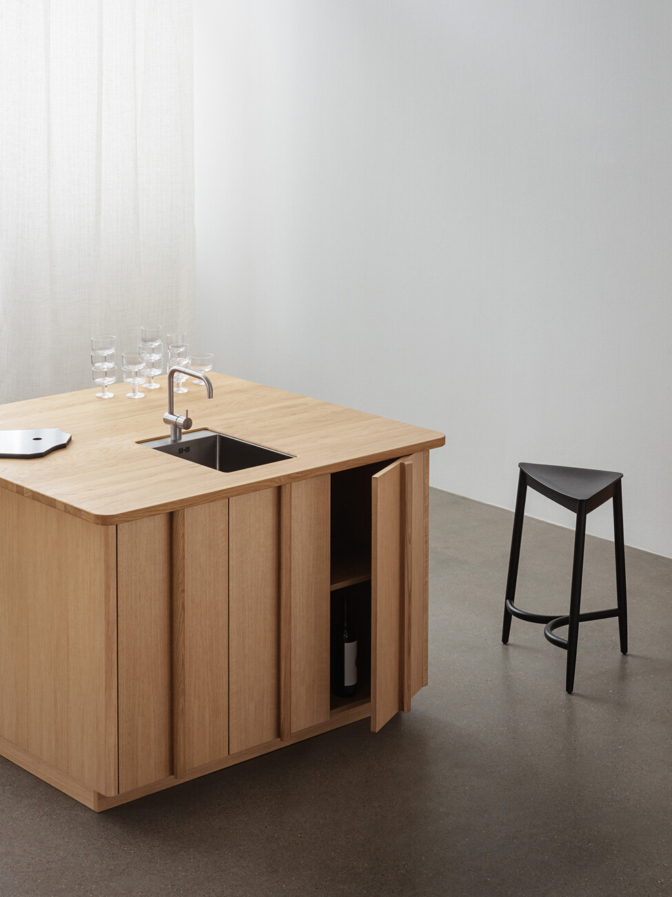 Available in natural oak and white ash, as well as lacquered ash veneer in the colours "Fresh Cream", "Pistachio", "Concrete" and "Dark Umbra", "COLUMN" can be adapted to any desired style and appear both subtle and sculptural. For the worktops, you can choose between natural stone and solid wood – ideal for creating homogeneous transitions or exciting contrasts in the material. "An object doesn't have to look functional to be functional," says Inga Sempé.