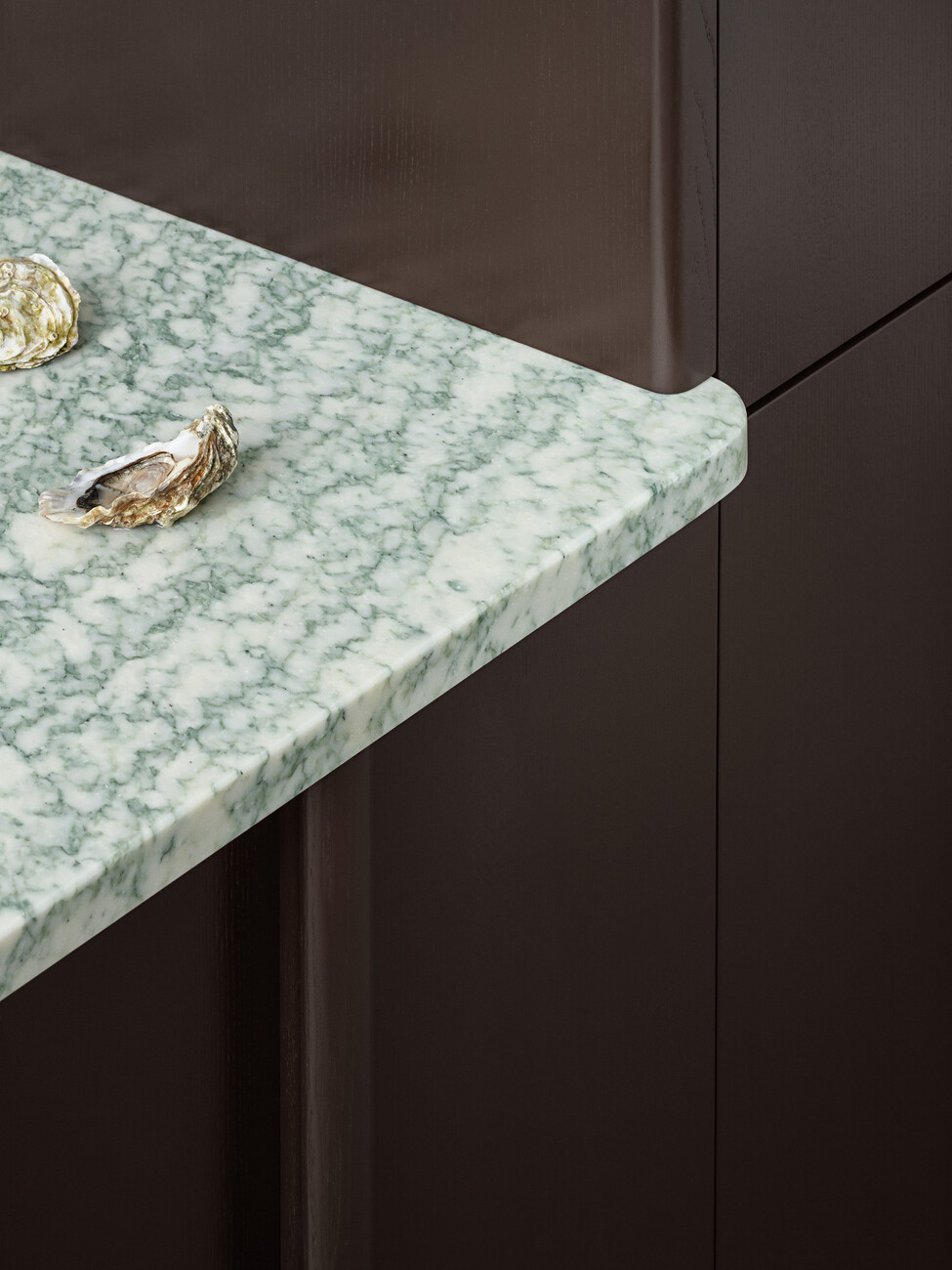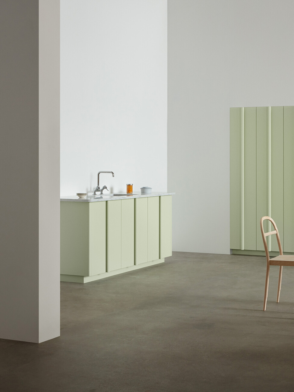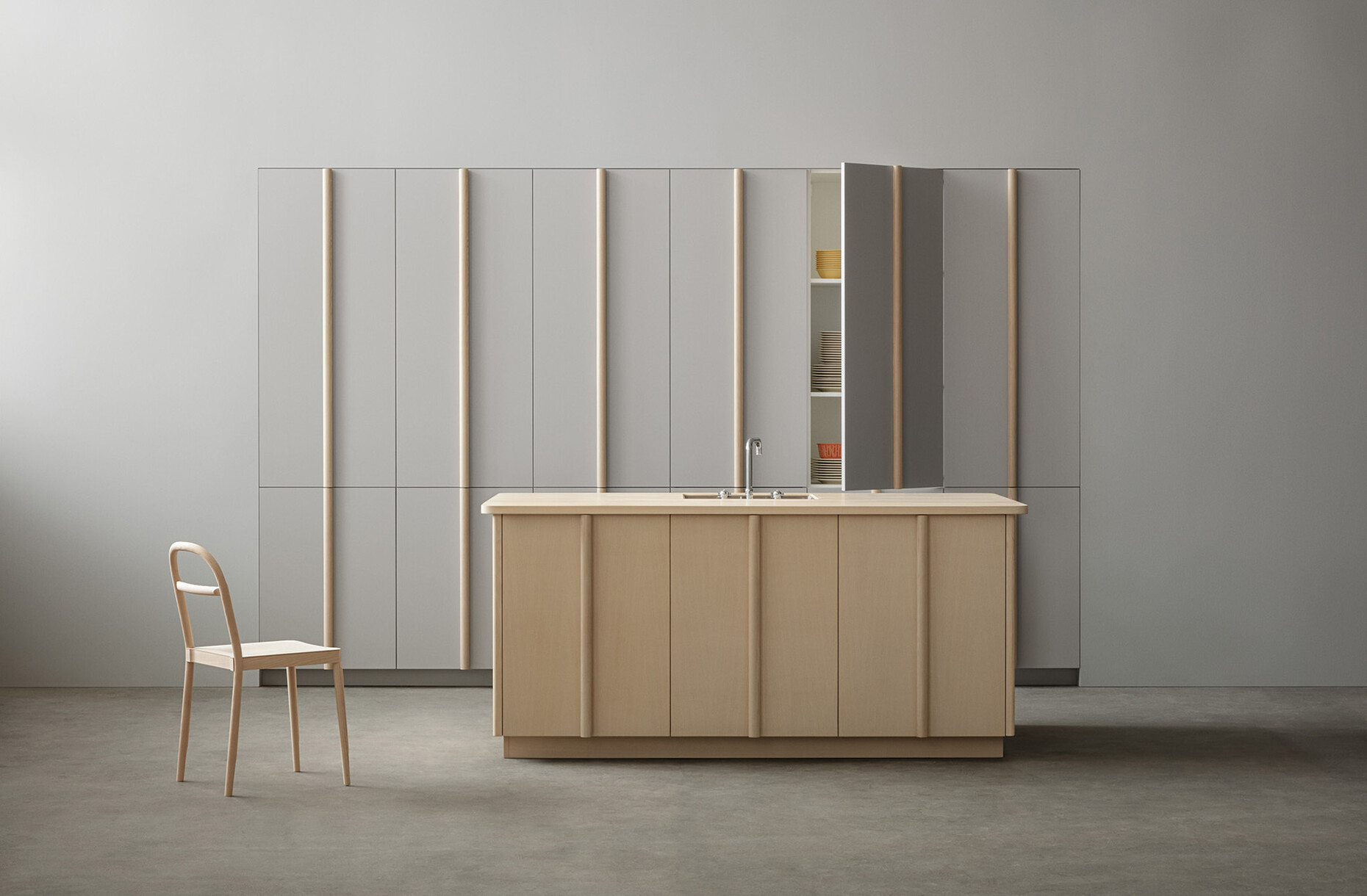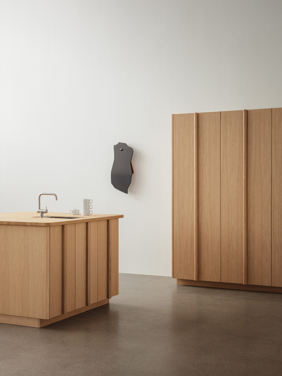 Available in natural oak and white ash, as well as lacquered ash veneer in the colours "Fresh Cream", "Pistachio", "Concrete" and "Dark Umbra", "COLUMN" can be adapted to any desired style and appear both subtle and sculptural. For the worktops, you can choose between natural stone and solid wood – ideal for creating homogeneous transitions or exciting contrasts in the material. "An object doesn't have to look functional to be functional," says Inga Sempé.