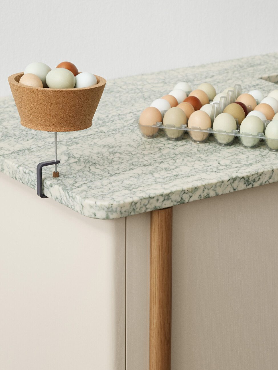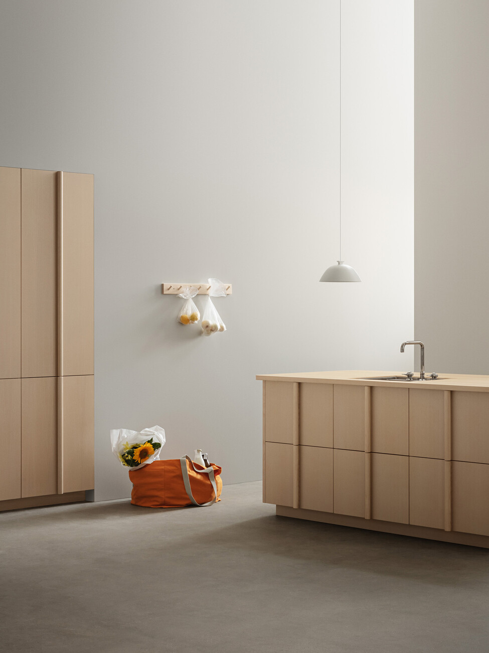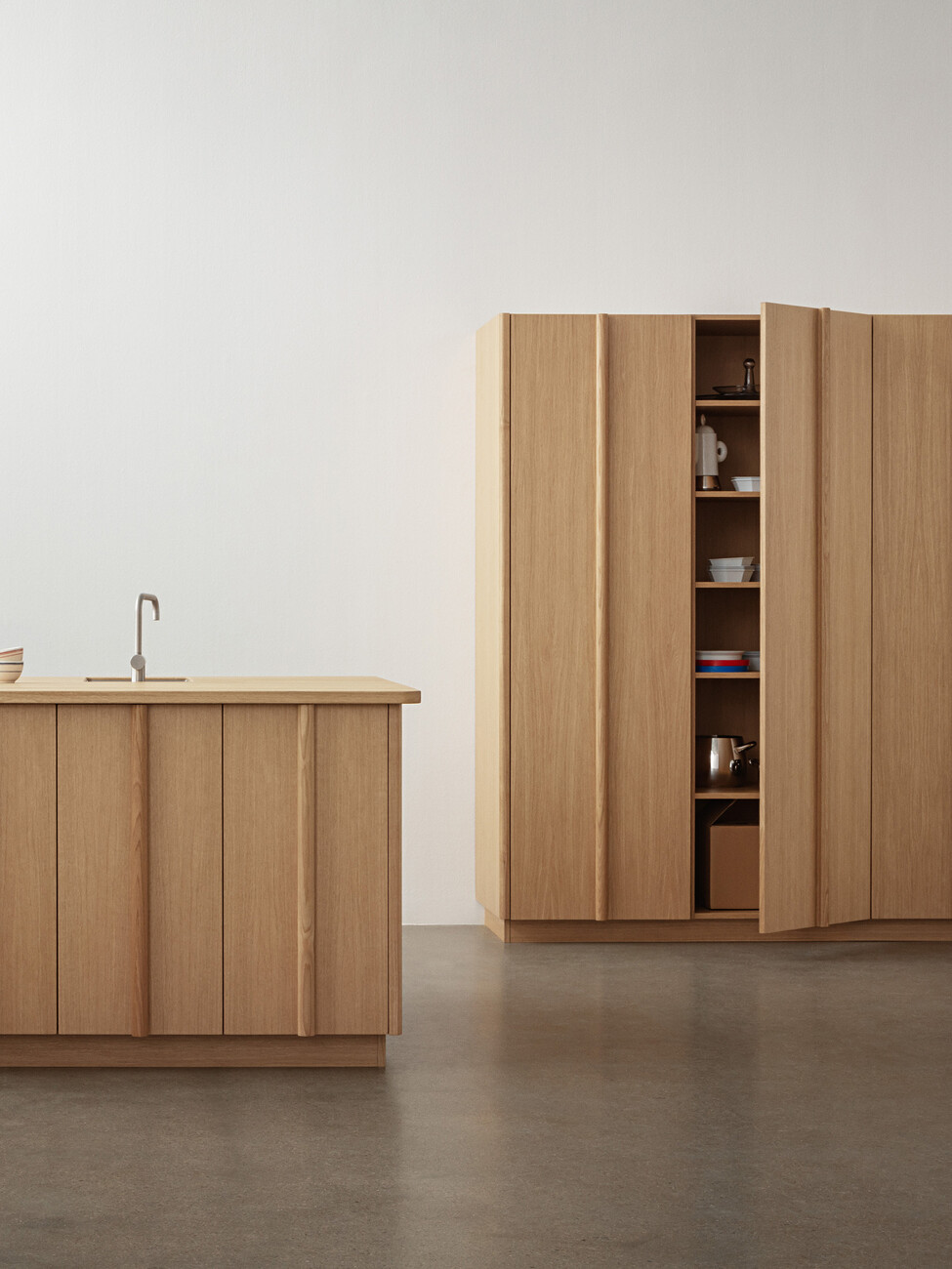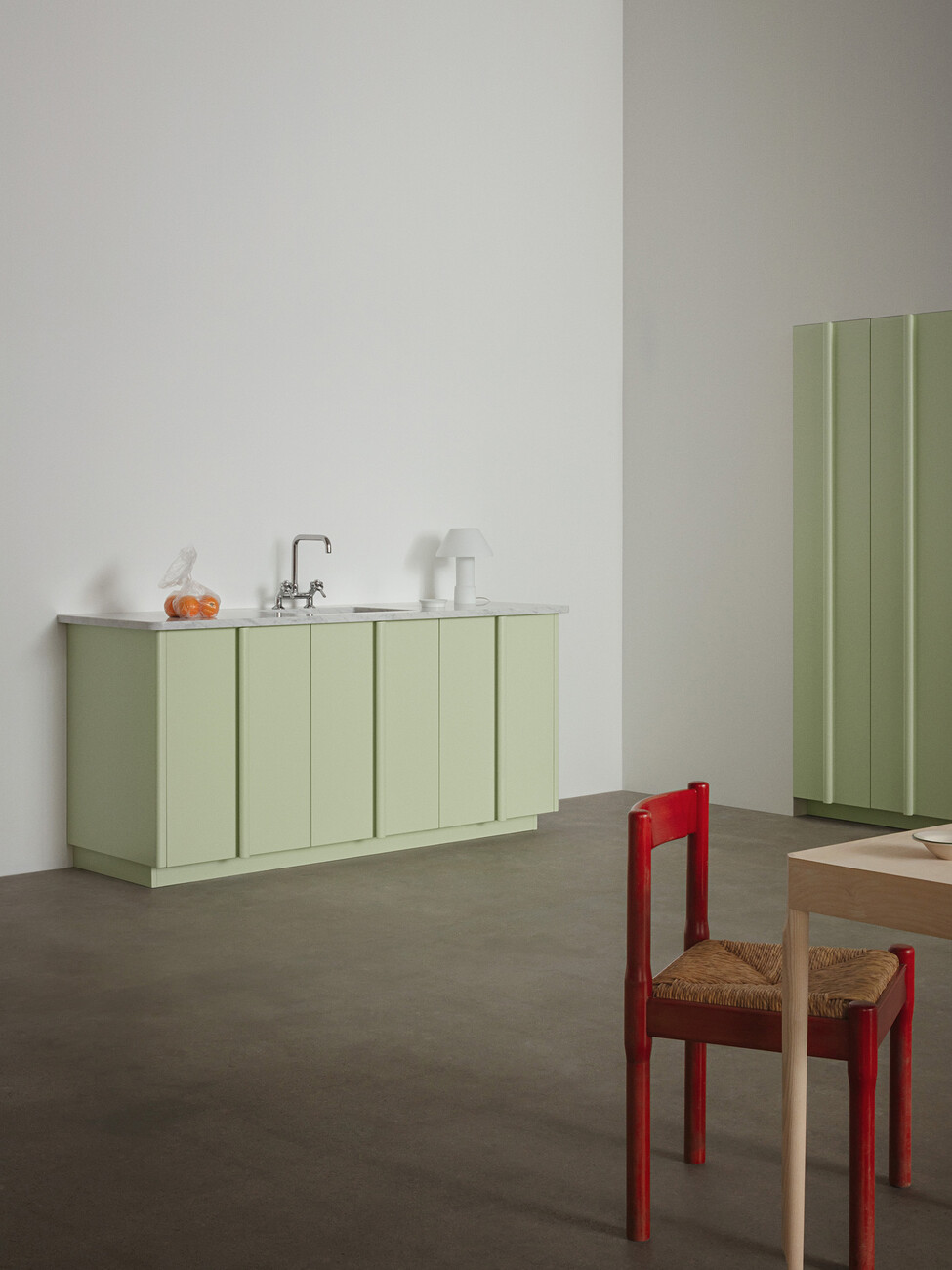 Available in natural oak and white ash, as well as lacquered ash veneer in the colours "Fresh Cream", "Pistachio", "Concrete" and "Dark Umbra", "COLUMN" can be adapted to any desired style and appear both subtle and sculptural. For the worktops, you can choose between natural stone and solid wood – ideal for creating homogeneous transitions or exciting contrasts in the material. "An object doesn't have to look functional to be functional," says Inga Sempé.