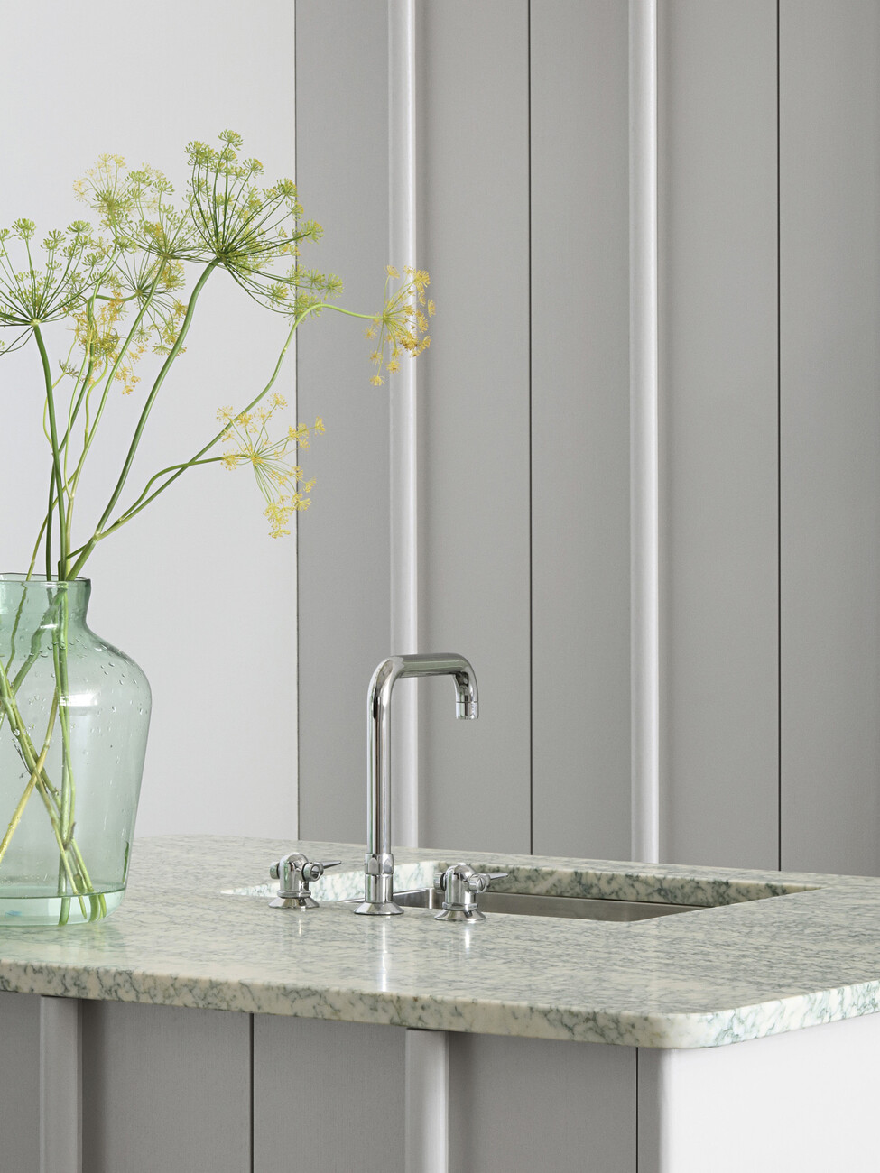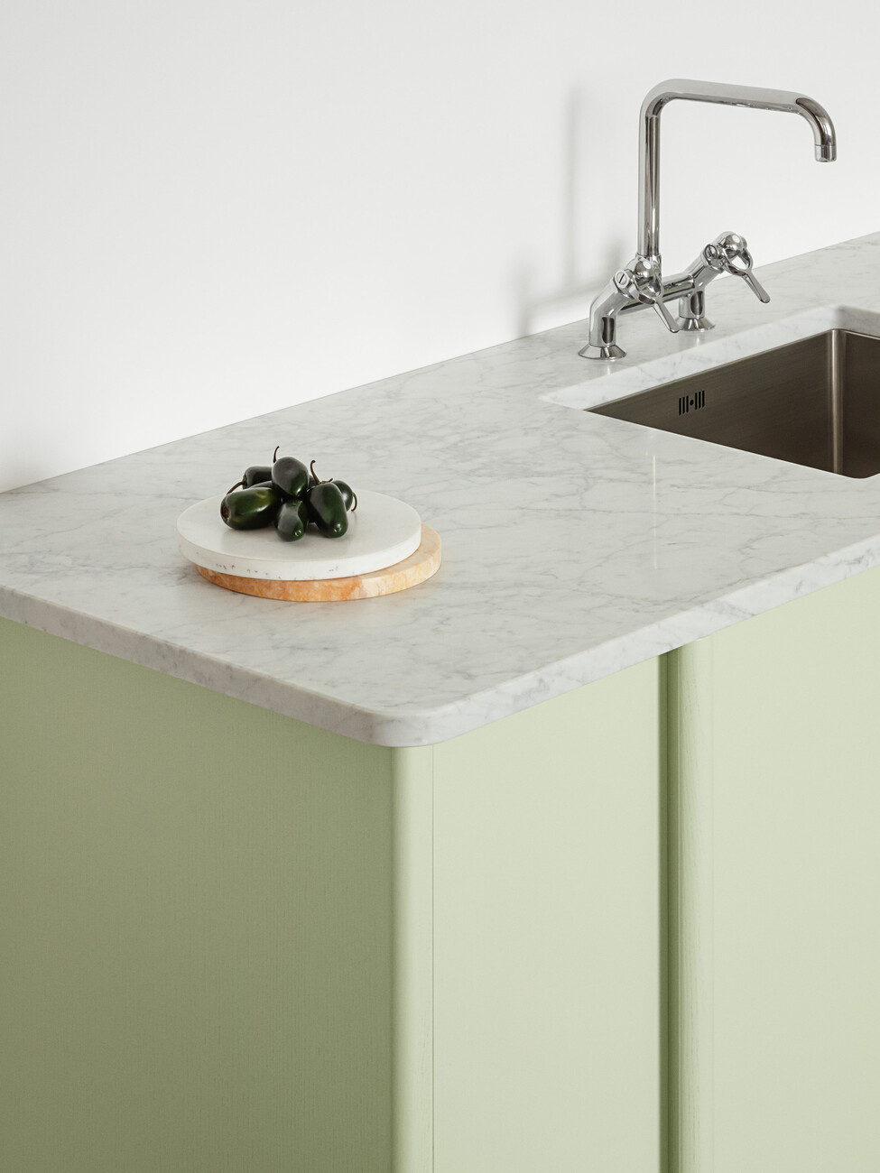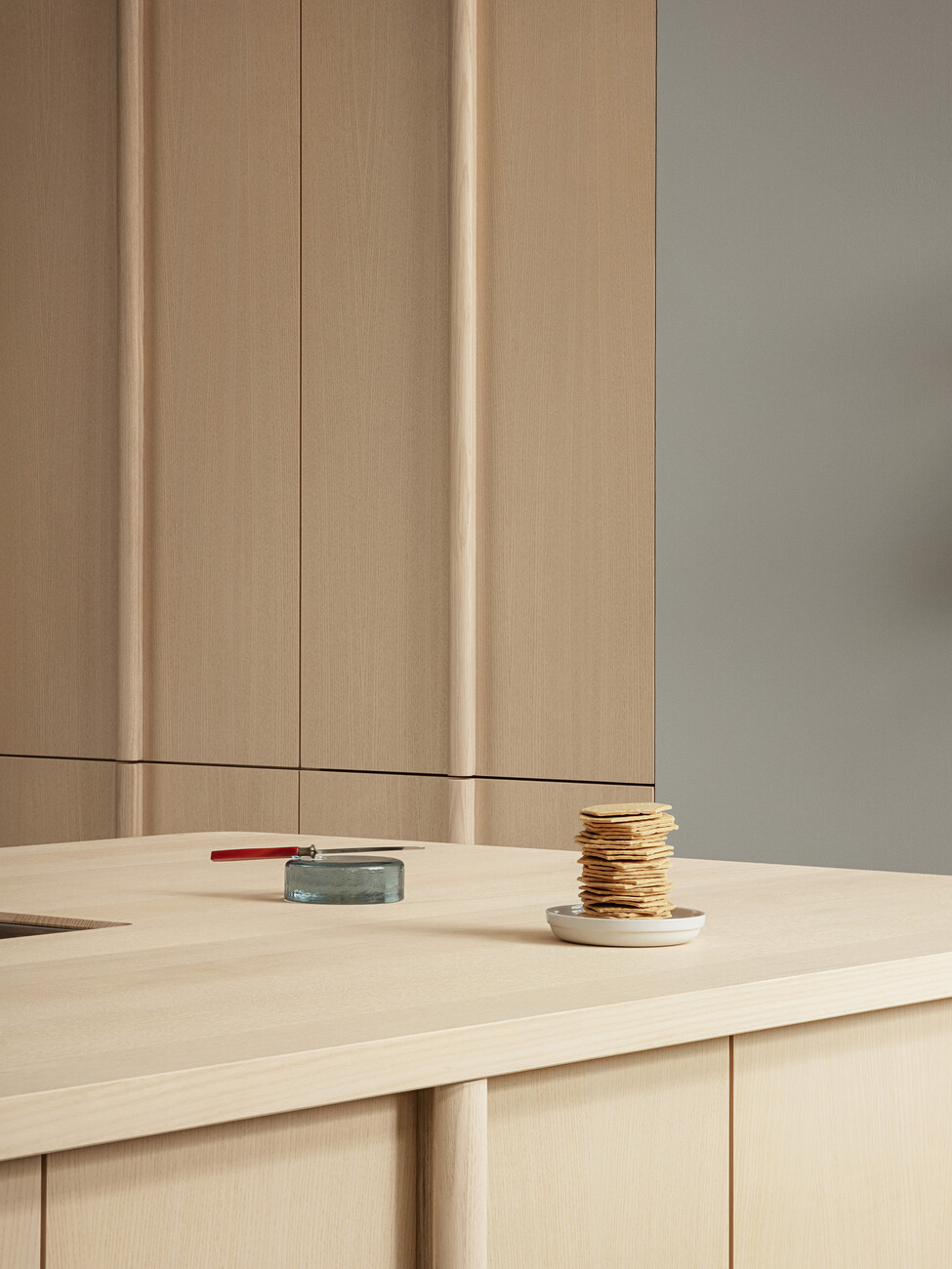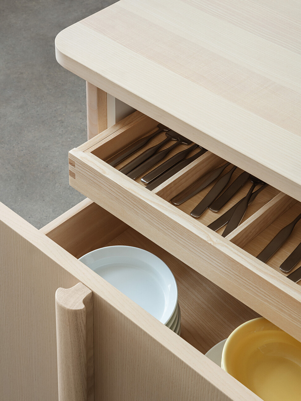 Available in natural oak and white ash, as well as lacquered ash veneer in the colours "Fresh Cream", "Pistachio", "Concrete" and "Dark Umbra", "COLUMN" can be adapted to any desired style and appear both subtle and sculptural. For the worktops, you can choose between natural stone and solid wood – ideal for creating homogeneous transitions or exciting contrasts in the material. "An object doesn't have to look functional to be functional," says Inga Sempé.