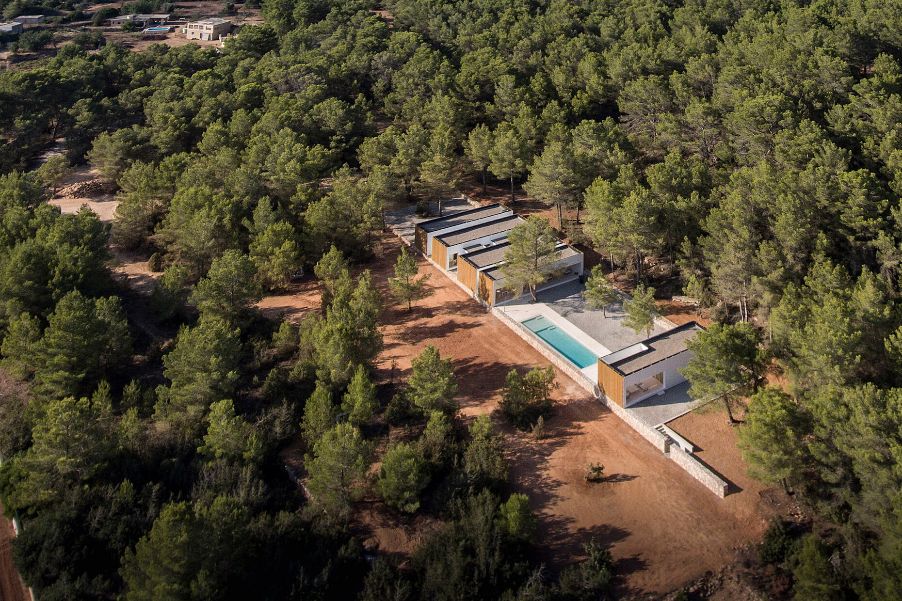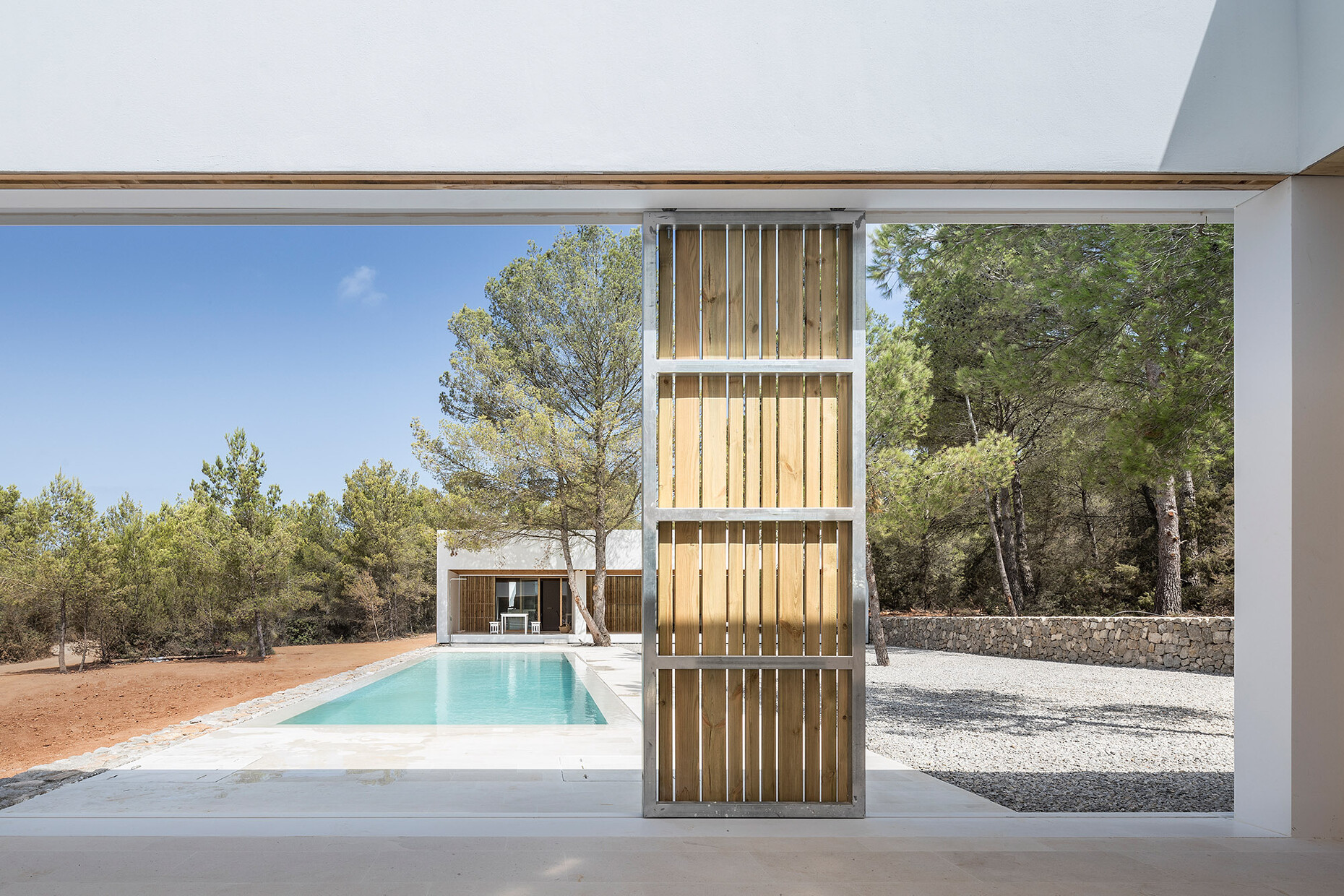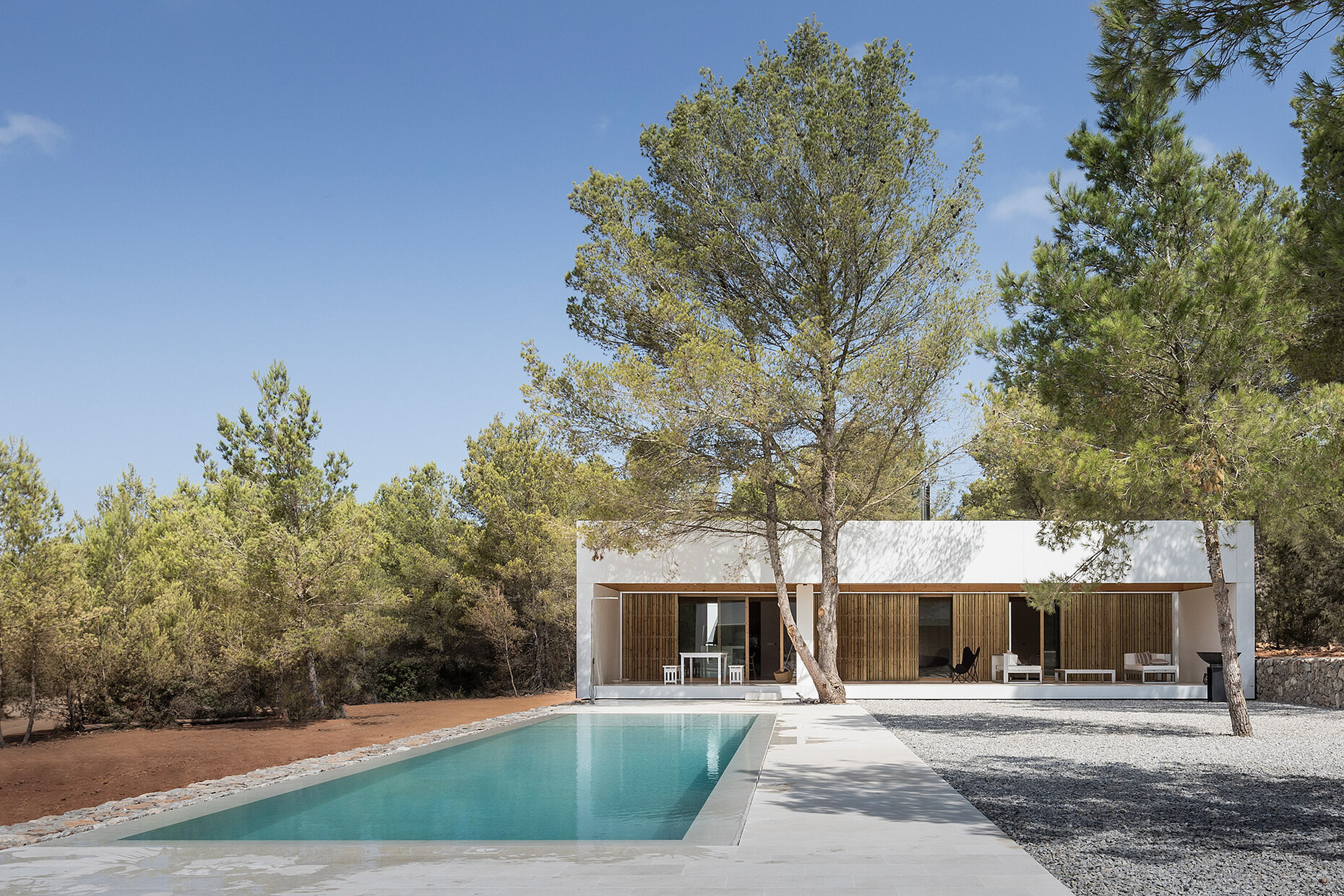 Located outside Sant Mateu and close to the north coast of the Balearic island, the Ca l'Amo residence is an ensemble of five structures on the edge of the forest that, taken together, form a large whole. In interaction, they blur the boundaries between inside and outside, while a common base connects the different areas and relates them to each other. Three structures form the living area for a large family, connected by several passageways, while the fourth structure contains a guest area. The fifth structure serves as a covered outdoor space that forms a direct connection with the landscape by setting the scene for the pine trees as a white abstract frame. It forms a front zone for the living area behind it and also acts as a climatic buffer. In addition, there is an elongated pool that picks up on the clean lines of the building and once again links it to the outdoor space.