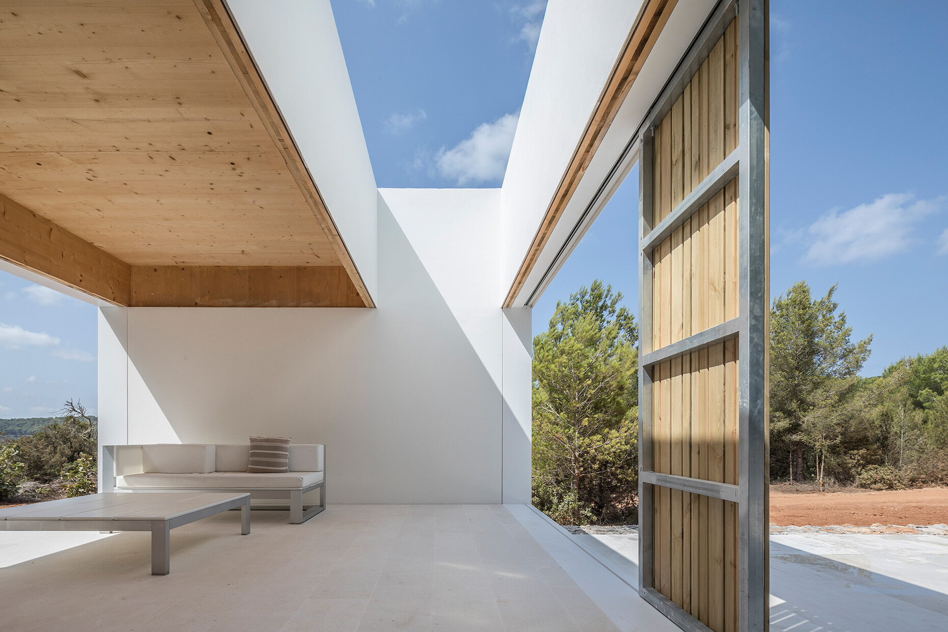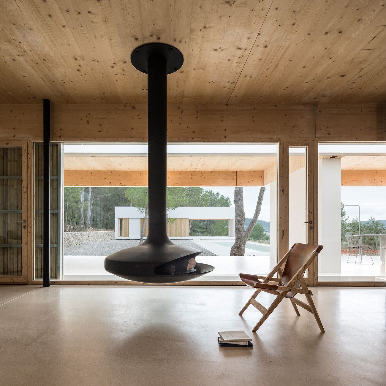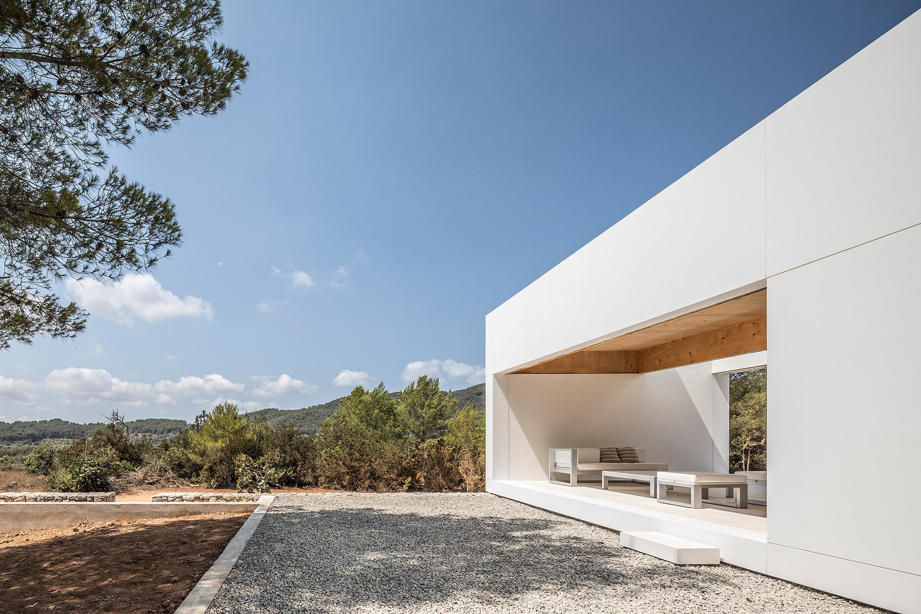 Located outside Sant Mateu and close to the north coast of the Balearic island, the Ca l'Amo residence is an ensemble of five structures on the edge of the forest that, taken together, form a large whole. In interaction, they blur the boundaries between inside and outside, while a common base connects the different areas and relates them to each other. Three structures form the living area for a large family, connected by several passageways, while the fourth structure contains a guest area. The fifth structure serves as a covered outdoor space that forms a direct connection with the landscape by setting the scene for the pine trees as a white abstract frame. It forms a front zone for the living area behind it and also acts as a climatic buffer. In addition, there is an elongated pool that picks up on the clean lines of the building and once again links it to the outdoor space.