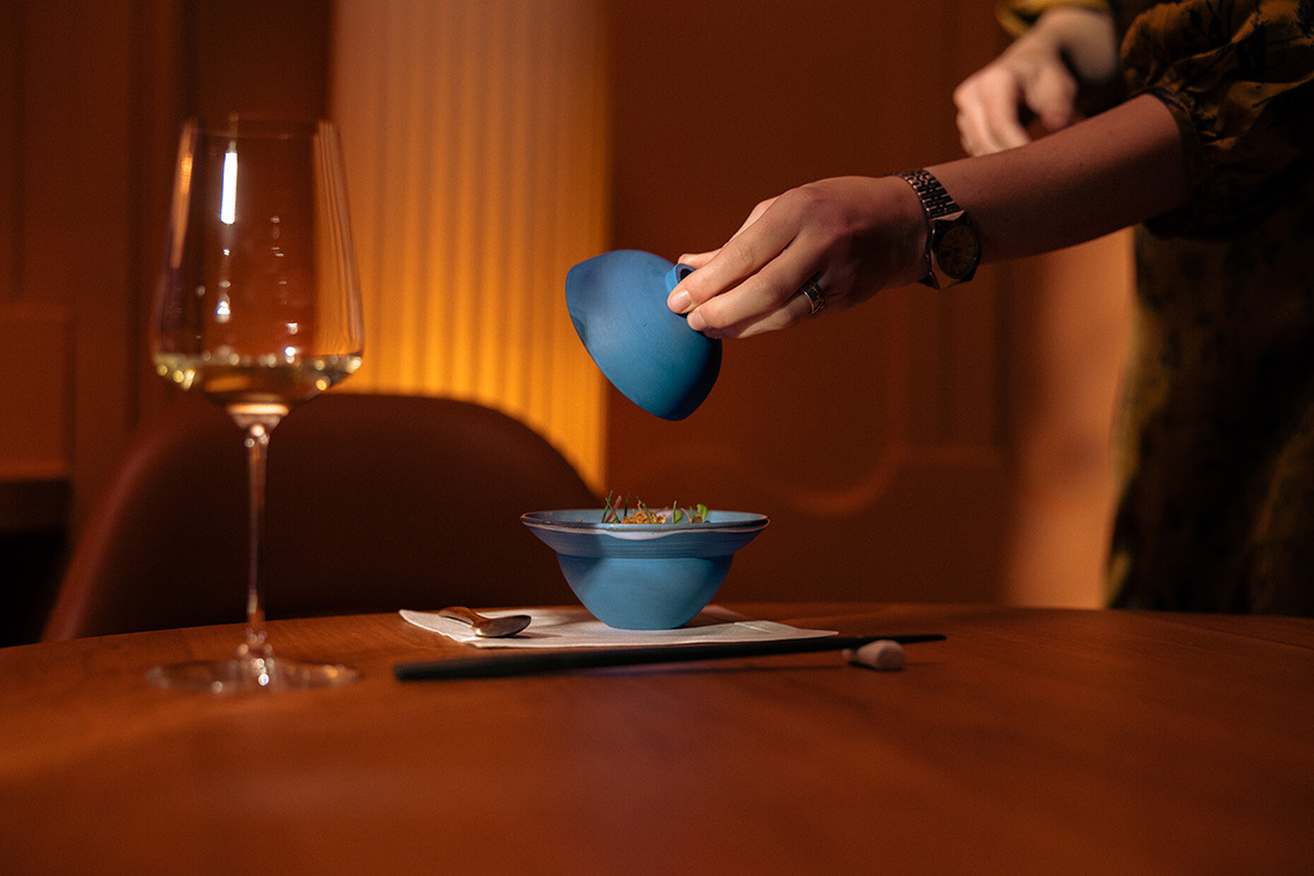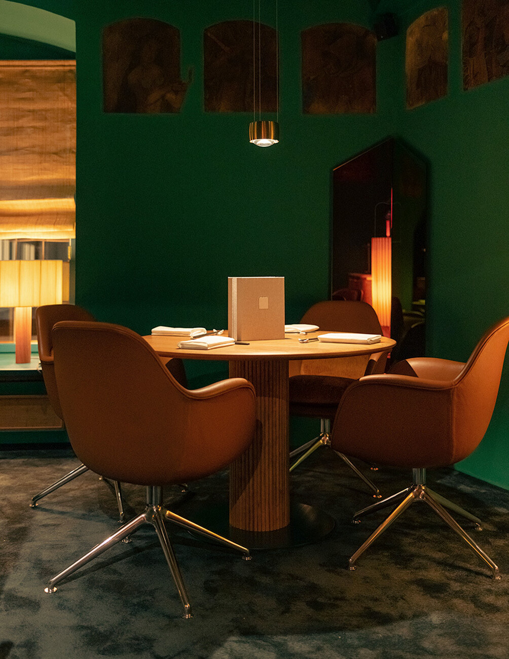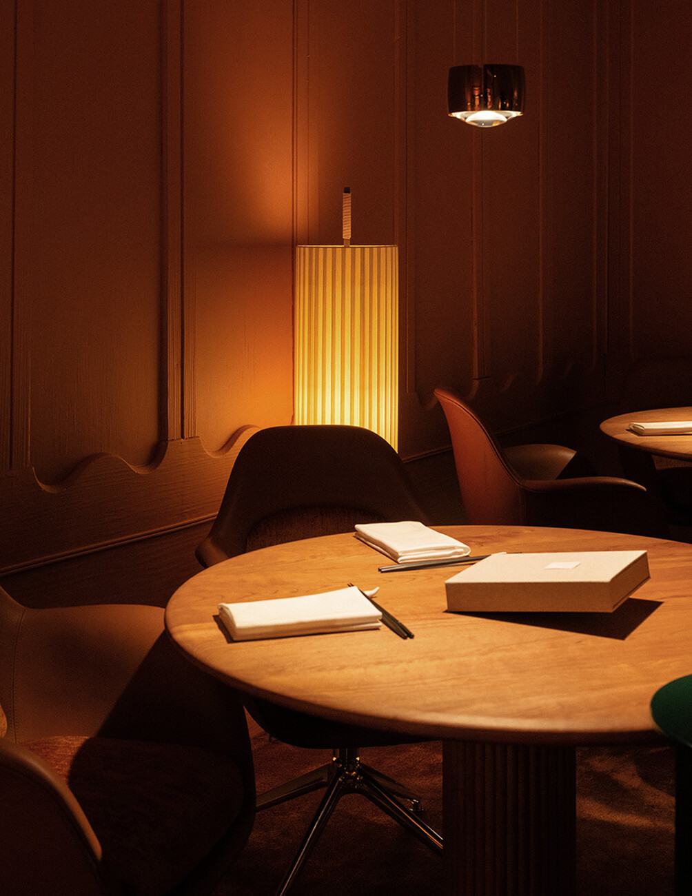 In the course of developing the interior concept for the fine dining restaurant, it quickly became clear that the place should resemble a private dining room with a warm host rather than a purely functional space for guests. In the course of this, the seemingly randomly distributed round tables in the room were each transformed into their own cleverly staged stages. The light of the pendant luminaires, which is adjusted to the table surface, includes the guests as "spectators" in this stage circle only to such an extent that an intimate, protected area is created, which makes it possible to fade out everything else in the room. This also creates a special effect when the host appears from time to time as if from nowhere, enters the circle of guests for a moment together with perfectly staged food and makes enjoyment as a subject tangible with all the senses.