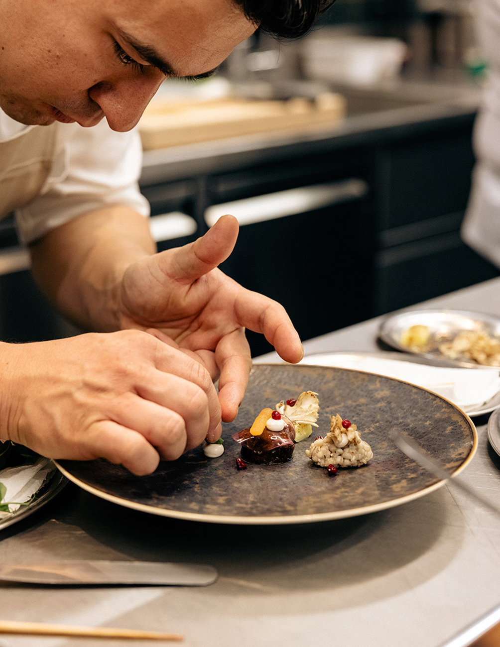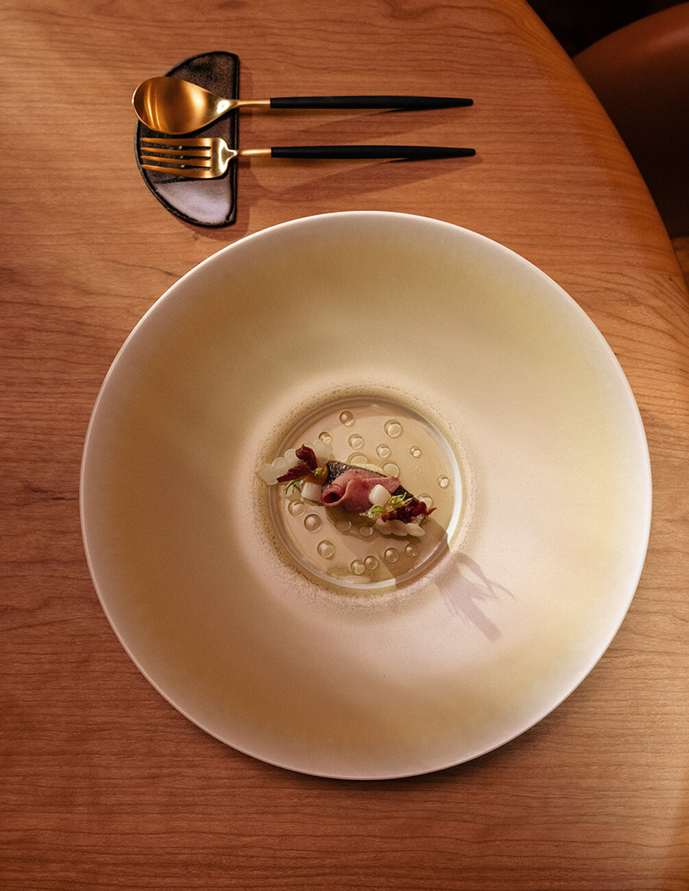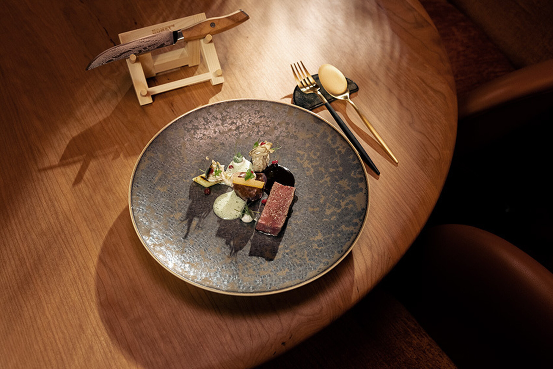 On three levels, Tohru Nakamura invites his guests to enjoy and, above all, to stay in the heart of Munich's old town: The listed town house from the 16th century offers the perfect setting for a relaxed aperitif on the terrace, a private celebration in the glassed-in wine cellar or a culinary journey where French esprit, Italian temperament and Spanish fire meet the precision of Japan. Upscale and unpretentious cuisine coexist here just as naturally as the theme of sustainability is woven into all processes. Not only do the ingredients come from the region as far as possible, but the choice of socially responsible and ecologically sustainable products was also paramount in the design, the wall paint, the woodwork in the interiors as well as the crockery and every single piece of furniture.