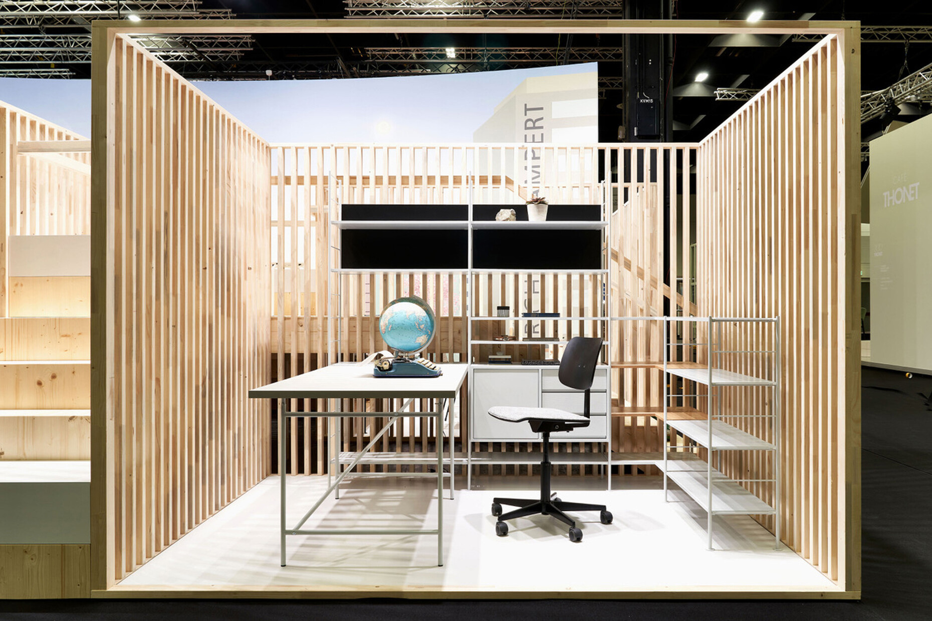 But evidently the topics of New Work and remote working from home did not pass you by completely unnoticed. For imm cologne 2020 you addressed the whole thing in the architecture of your exhibition stand with a reference to an iconic scene from the movie “Playtime” by Jaques Tati. The film protagonist stands on a gallery and looks out and across an office world of cubicles. The question this poses about privacy and openness in office architecture is more relevant than ever, after all.
