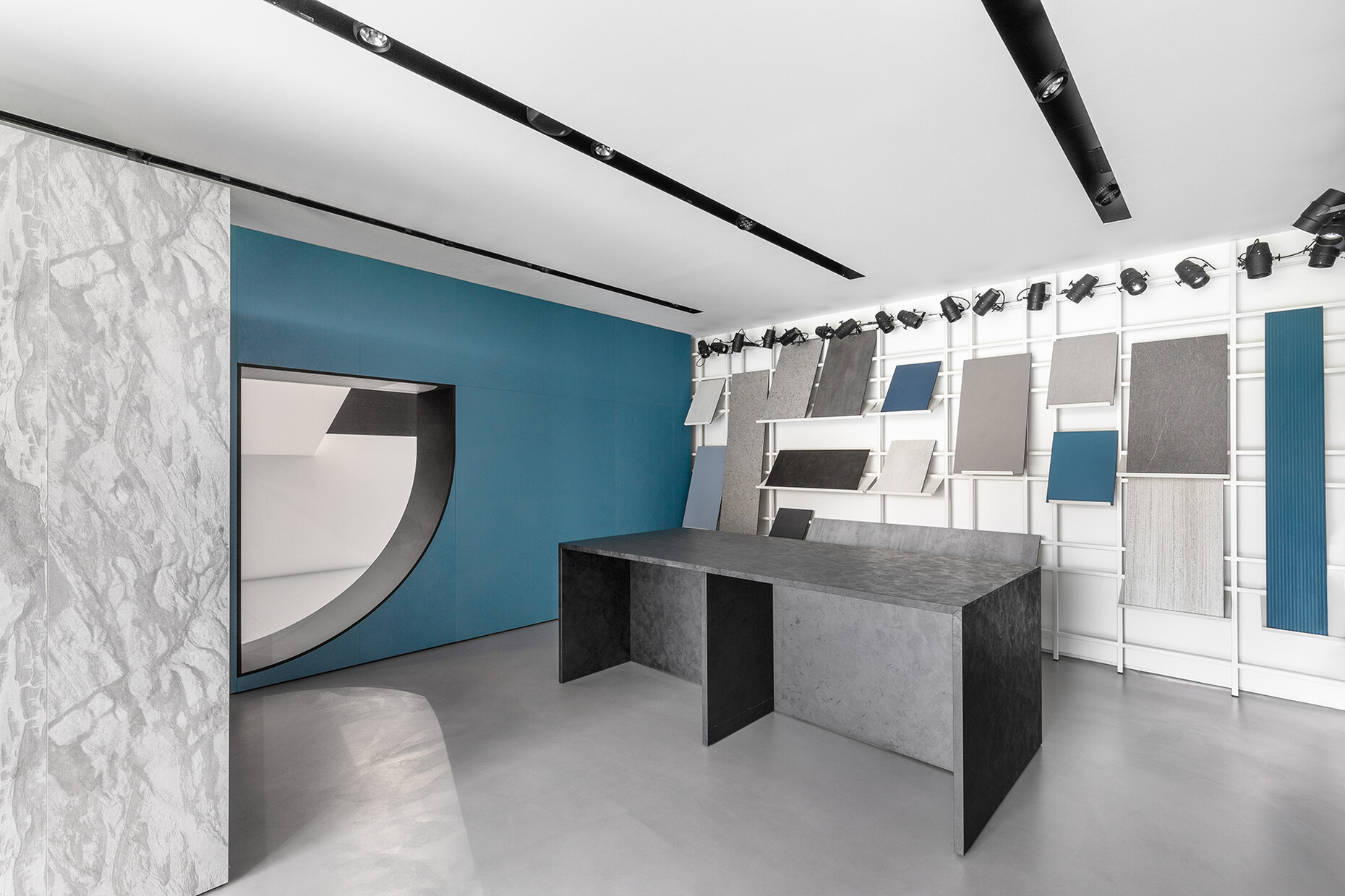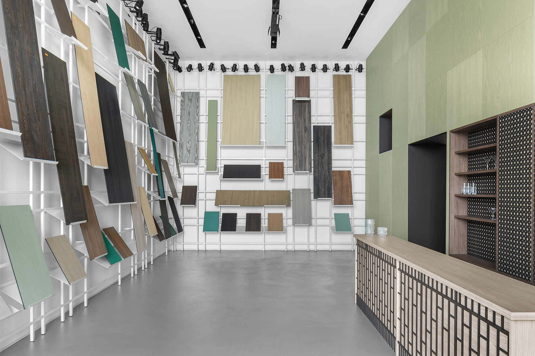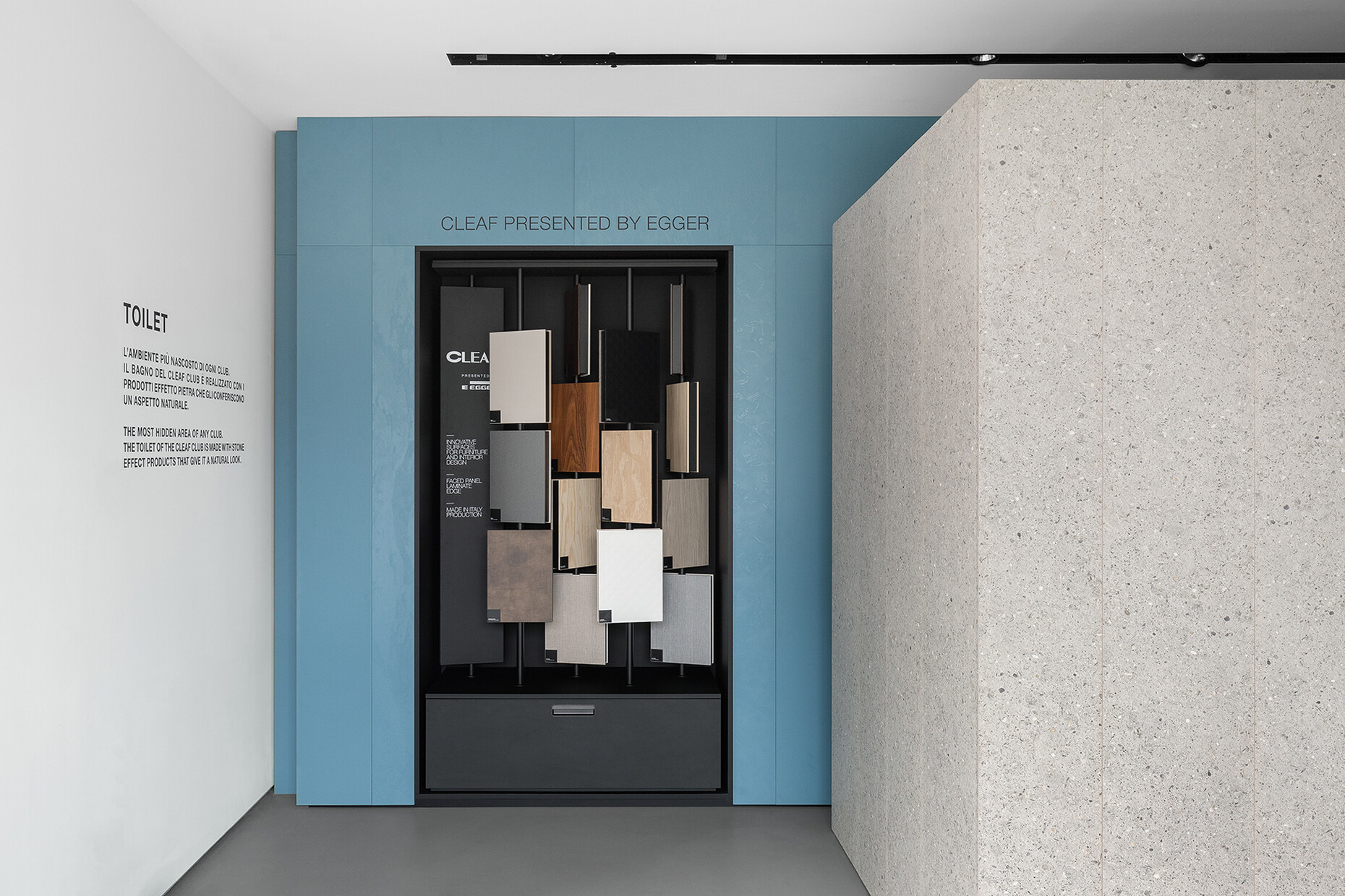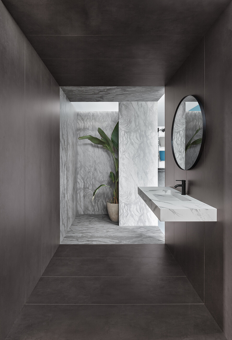 Pedro Campos Costa: We believe the best way to present something is to show it in use. So, we created different situations that might actually exist: a bar in a wooden look, a toilet featuring a stone effect finish, a dance floor with a metal look and a lounge with a fabric effect surface. Naturally it is still a showroom that should ultimately show different materials.