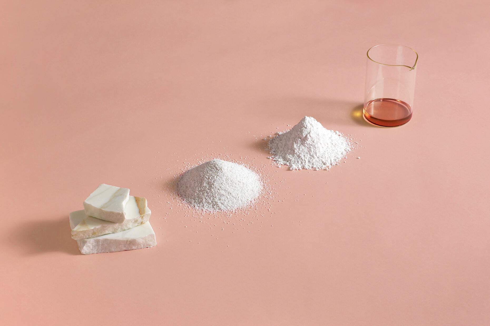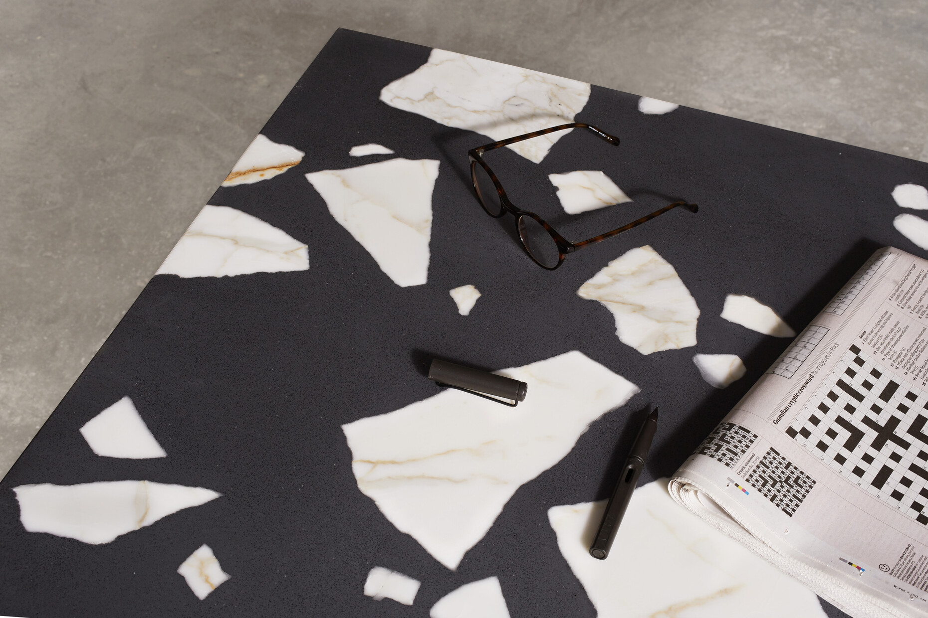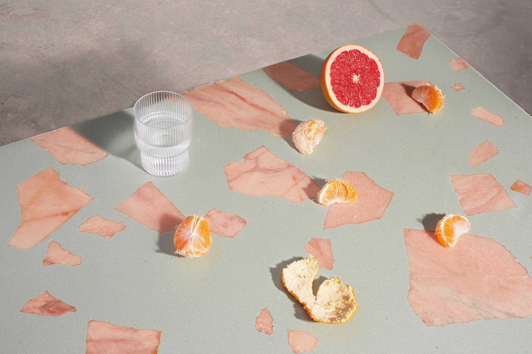 Terrazzo was a popular material for embellishing surfaces even in the days of Ancient Rome. Diverse and always with a unique appearance, this decorative exposed concrete was a favorite choice for a long time, especially when the aim was to equip the palaces of the wealthy with a material that was both hardwearing and particularly lightweight. The fragments used for the traditional cement flooring changed over the centuries and varied strongly from region to region – from ceramic and marble through to gravel. Designers of the Memphis movement even worked with glass to produce an unusual look. Highly complex to make by hand, gradually new trends like prefabricated terrazzo slabs and floor coverings of carpet, PVC or wood sidelined traditionally made floors, at least for a while. The fact that they are now experiencing a renaissance is in part thanks to Robin Grasby. The London-based furniture and industrial designer makes his “Altrock” terrazzo largely from recycled materials from the marble industry like flour, chips and chunks. And rather than relying on the classic screed as a binding agent, Graspy uses resin. Color pigments from black to pale pink produce a decorative result.