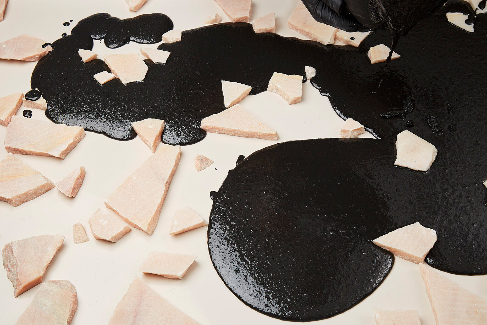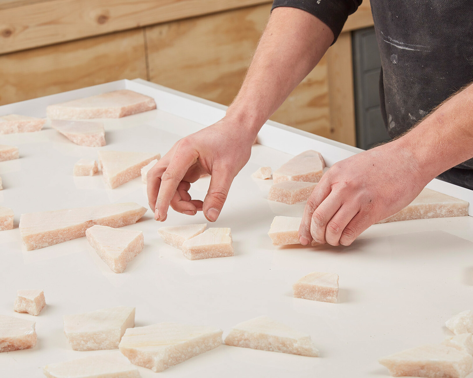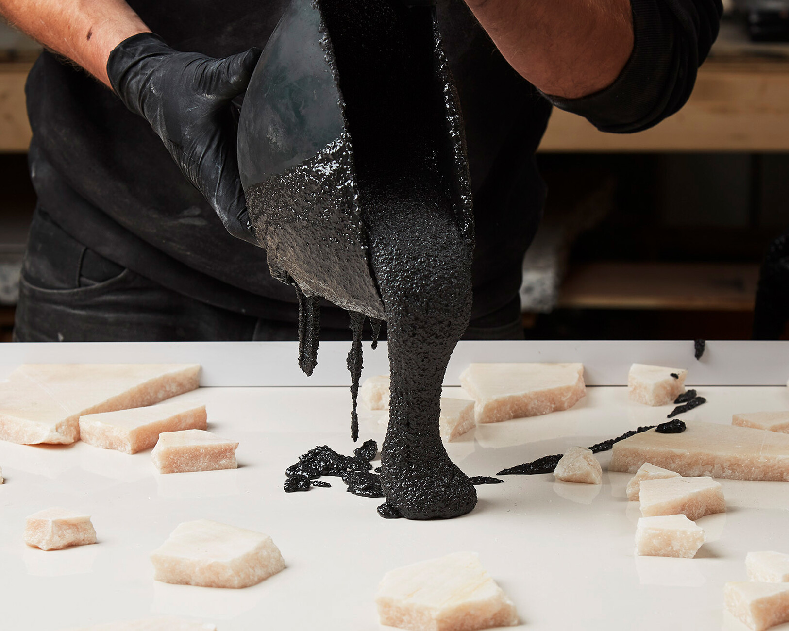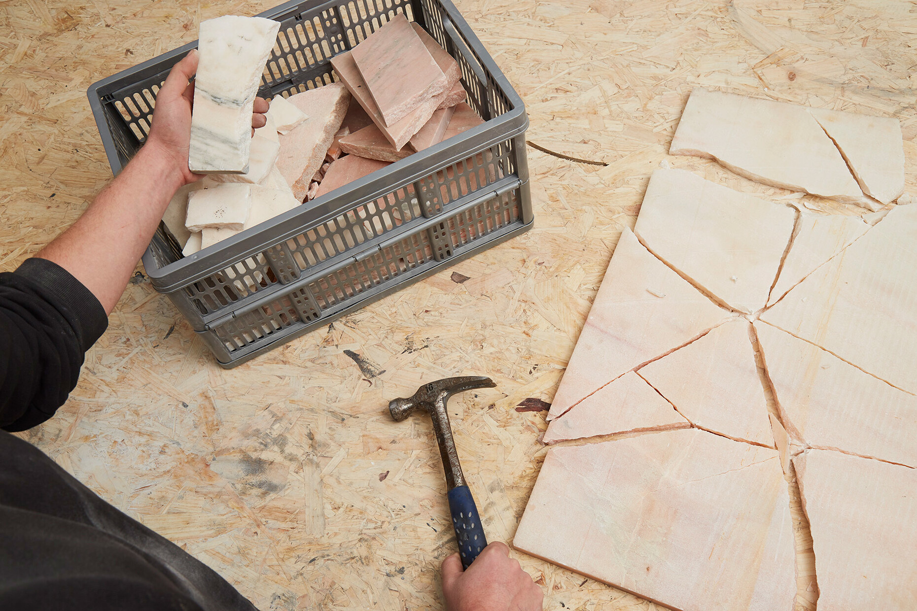 Robin Grasby: Material authenticity is decisive for the “Altrock” aesthetic, which is largely defined by a random arrangement of the fragments. I could cut the stones into shape, but breaking them places the focus on the materiality and texture of the marble as a natural material. I could also arrange the stones in a regular pattern, but the decision to opt for a “chaotic” arrangement reflects the unpredictability of the patterns and the fragmentation of the chunks. Or to put it differently, I think it looks more attractive.