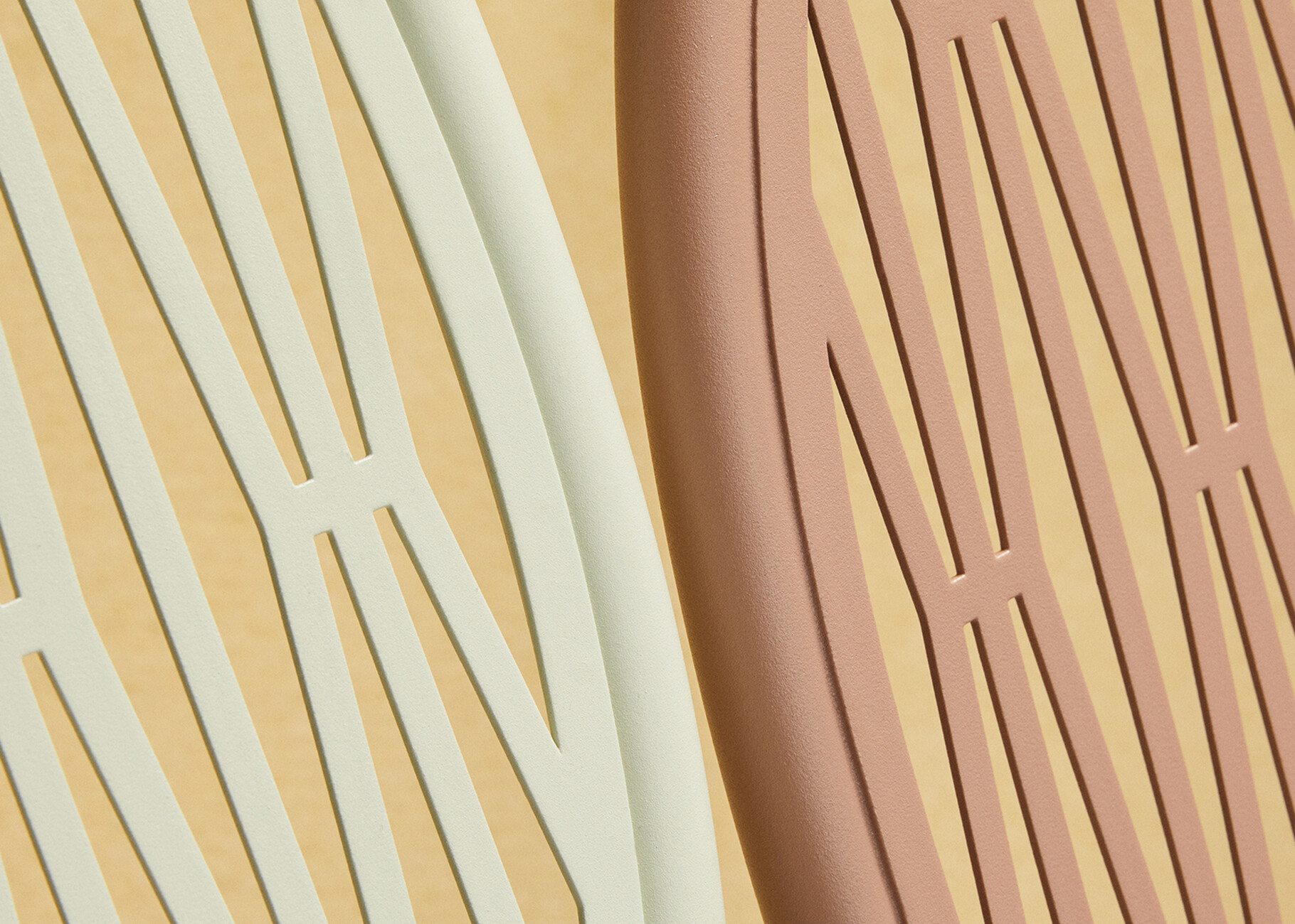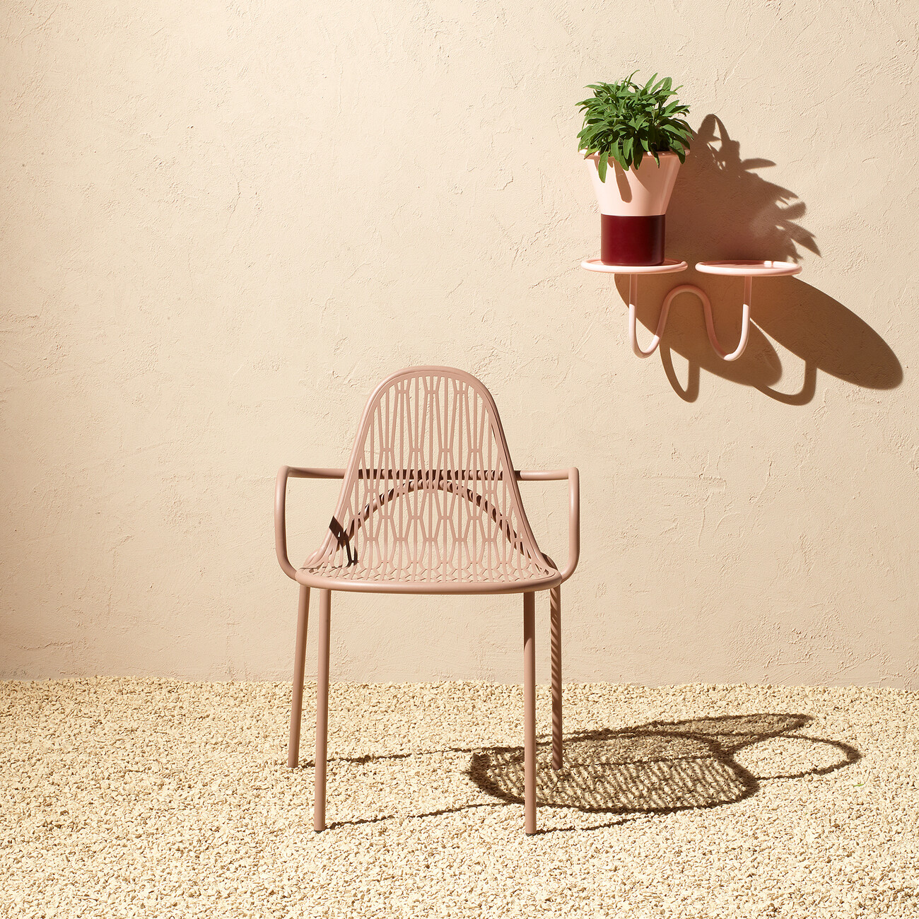 "Malvasia" unfolds its full effect in the sun: when the rays fall through the metal mesh and cast patterns on the floor, associations with the play of shadows on foliage or pergolas are automatically evoked. The design appears light as a result of the geometric arrangement of the struts. Meanwhile, the production of the pattern posed a real challenge, emphasises the designer: "This outdoor chair designed for S-CAB expresses a production challenge despite its simple and structured forms: The backrest and seat are created from a single calendered and perforated piece and then welded almost invisibly to the tubular frame. A complex endeavour that pushes the material to the limits of its flexibility."