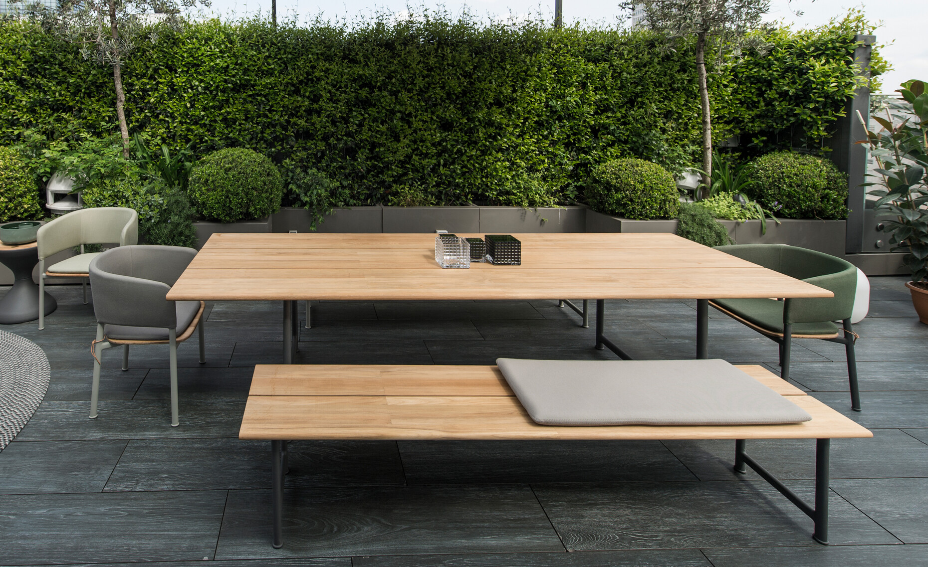 Cecilie Manz: I divided the table top in two. The gap in the middle means water can run off and the entire top seems less massive as a whole. The same applies to the benches and side-tables. The aluminum frame, available with two different color finishes, likewise has a very pared down feel to it. With the chairs and loungers the split is in the middle of the seat and the curved backrest. That, again, brings a sense of lightness into things.