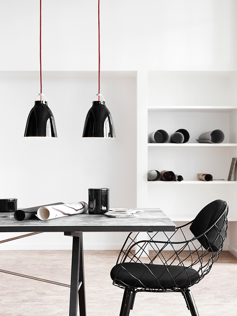 Cecilie Manz: The “Caravaggio” has a bit of a bizarre history. We started out with the most extraordinary version, the black luminaire with the red cable. And then we wondered whether there should not be a more toned-down version in white with a white or grey cable. The “more normal” version thus came on the market after the more striking one. And then we found it seemed obvious to add a model with a glass shade. The luminaire thus suddenly looked utterly different, and even the light it exudes is completely different.