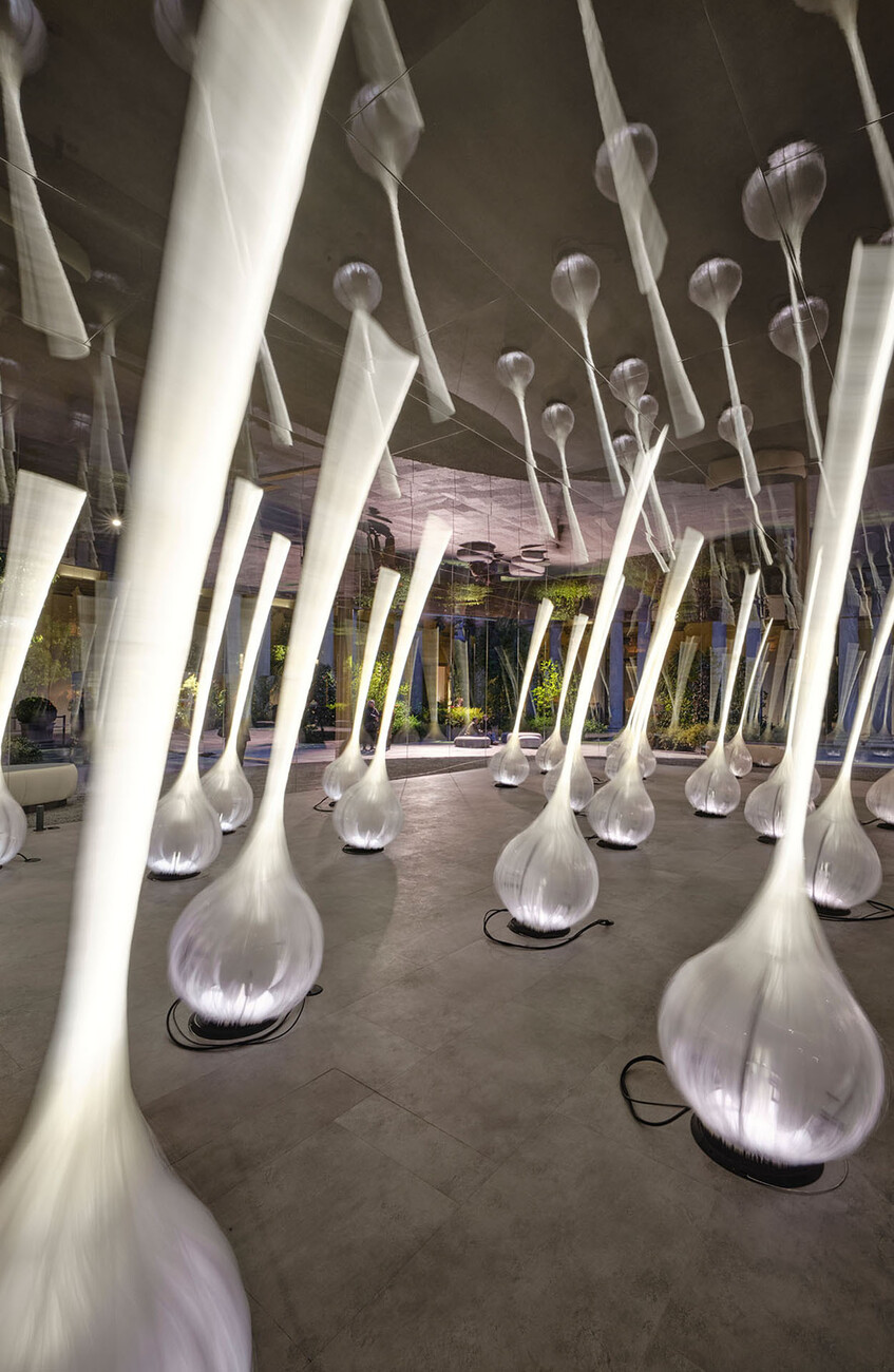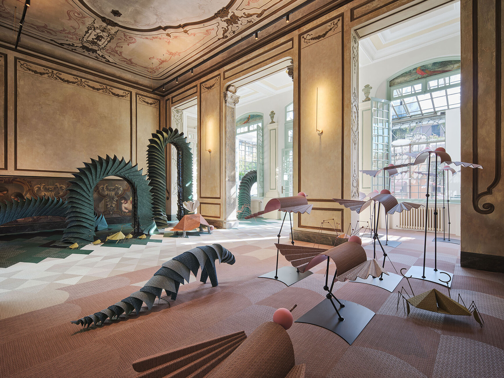 In general, the Milan Design Week was also worth a visit off the beaten track, such as the ‘Vienna Vibes’ exhibition by Galerie Zippenfenig, which exhibited many ideas by designers from Vienna in the basement of the Erotika Boutique, such as the ‘Tide Chair’ by ante up and Fantoplast made of recycled plastic sheets, the ‘bonbon’ side objects such as ‘nougat’ by studio högl borowski or the ‘Flybar’ pendant lamp by studio re.d. Studio Drift presented ‘Drift Us’, an immersive installation in collaboration with Audi: the robot-supported art installation in the courtyard of the Hotel Portrait Milano, in the form of oversized blades of grass, reminded visitors that they are in a constant dynamic dialogue with their environment. The synchronised movements were based on human breathing and heart rhythms. ‘Wind is the driving force of evolution and innovation in nature. Without movement, there is no progress,’ says Studio Drift. Like last year, Bocci exhibited in an enchanted building from the early 20th century in the Zona Vincenzo Monti and celebrated its 20th anniversary with a show curated by David Alhadeff. The diverse works of Omer Arbel could be discovered in new installations such as works by Orior, Calico Wallpaper, Shore Studios and Christopher Farr.