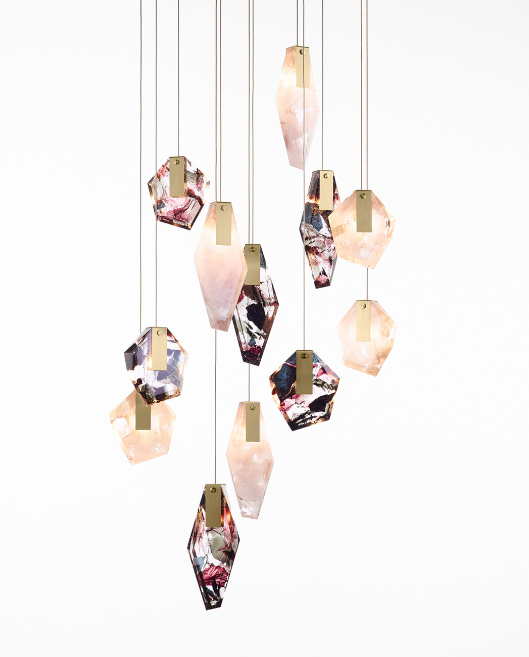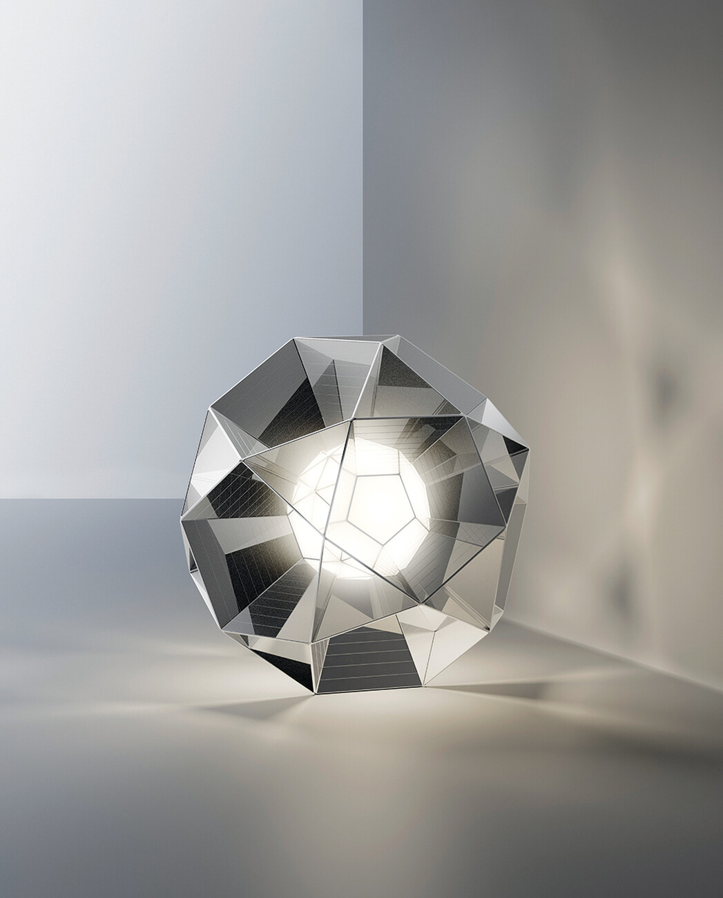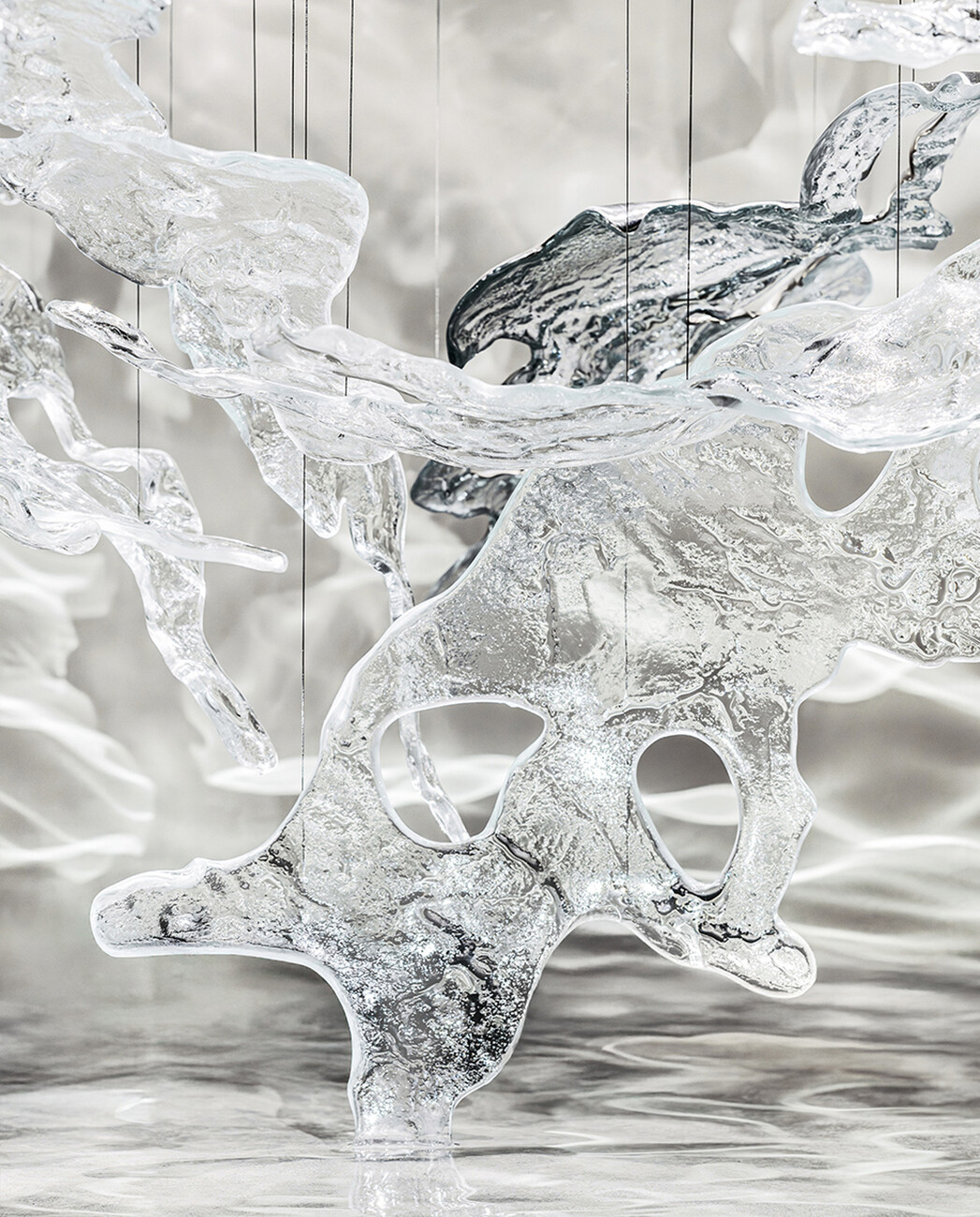 The reinterpretations of lighting that created new perspectives with filigree elements were also fascinating: Like BIG with ‘Arctic’ for Artemide, a collection whose structure resembles an Archimedean solid with no visible outer surfaces, made up of pentagonal elements. The mirrored surfaces are aligned and face each other, creating an interplay of reflections that changes depending on the perspective. Lasvit showed ‘Splash’ by Martin Gallo, a glass light installation made of fused glass, which, composed of many individual parts, explores the emotional resonance of water and its flowing, ever-changing forms. ‘I wanted to capture how a single drop can become something big, how the light dances on the surface and how water, like glass, harbours both stillness and energy,’ says the designer. The ‘Loomo’ wall light by Maxim Velčovský, whose glass disc shows the imprint of a textile structure and provides soft light, could also be discovered at the stand. For the new ‘Fragment Line’ and ‘Fragments’ collections, Bomma combined recycled glass fragments to create linear and dynamic luminaires. In its show, Preciosa Lighting demonstrated the diverse customisation possibilities of modular lighting design, such as with ‘Crystal Links’, a network of handmade crystal bicones and slender metal tubes. A-POC Able Issey Miyake and Atelier Oï showed ‘TYPE-XIII Atelier Oï’: artistic, wave-shaped table and ceiling lamps made of wire and fabric. Michael Anastassiades presented a new series of modular lights called ‘Cygnet’, ‘Frame’ and ‘Floor Mobile Chandelier’ for his eponymous brand at the Jacqueline Vodoz and Bruno Danese Foundation, made of delicate structures, like two equilateral paper triangles illuminated by a hidden light source. Snøhetta created ‘Aura’ for Viabizzuno: consisting of transparent ‘light prisms’, the light itself takes centre stage here.