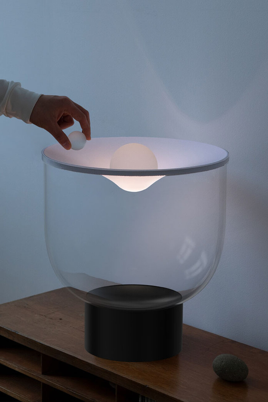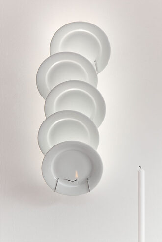 In addition to minimalist systems, Davide Groppi presented the electrified race track ‘Race of Lights’, which supplies small car lamps with energy. The course can be customised as desired thanks to its attachment with magnets and becomes the basis for an individual lighting design. With the ‘System Bind’ by Martín Azúa, Vibia makes it possible to change the lighting concept in the blink of an eye and to meet even difficult room requirements precisely. The ‘Poudrier’ wall light by Philippe Negro for DCW éditions can be opened and closed with a polished brass flap, while the light is diffused over the entire depth through a thick glass disc. In addition to a new version of ‘Fire’ as a mobile table lamp made of anodised or polished aluminium and mouth-blown glass, Grau also brought a small, round LED spotlight made of high-quality aluminium to Milan. This creates a cosy atmosphere with its blue-free light and promotes sleep. ‘Boltons’ by Herzog & de Meuron for Artemide consists of an adjustable metal disc and a conical glass body into which a delicate air bubble is incorporated. The upper reflector is freely adjustable by means of a magnetic sphere, allowing precise control of the light. Meanwhile, Mathias Hahn has designed the new ‘Gambosa’ luminaire made of steel with a wide range of colours for Marset. As a modern interpretation of the table lamp with simplified structural elements, they appear to balance on top of each other. The cable runs from top to bottom, while a clip guides it. With ‘Jasna Kuchnia’, the Ingo Maurer team developed a luminaire made of five porcelain plates, which, backlit with an LED line, sets the scene for an everyday element and, when switched on, reveals just how translucent ceramics can be with a small detail: A small, dark match is depicted on the front plate. When switched on, the light seems to ignite it – a subtle illusion that emphasises the playful character of the design. The plates can also be removed from the composition.