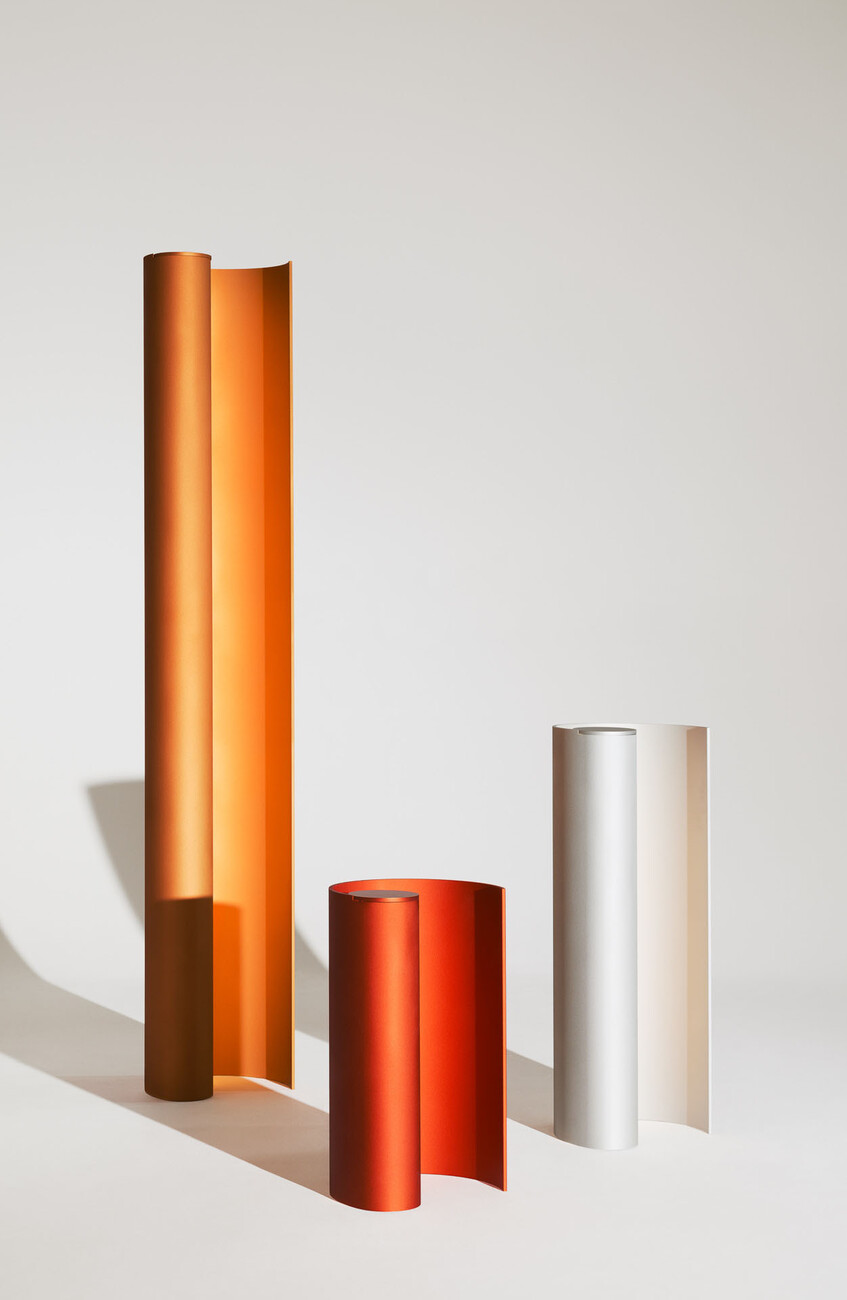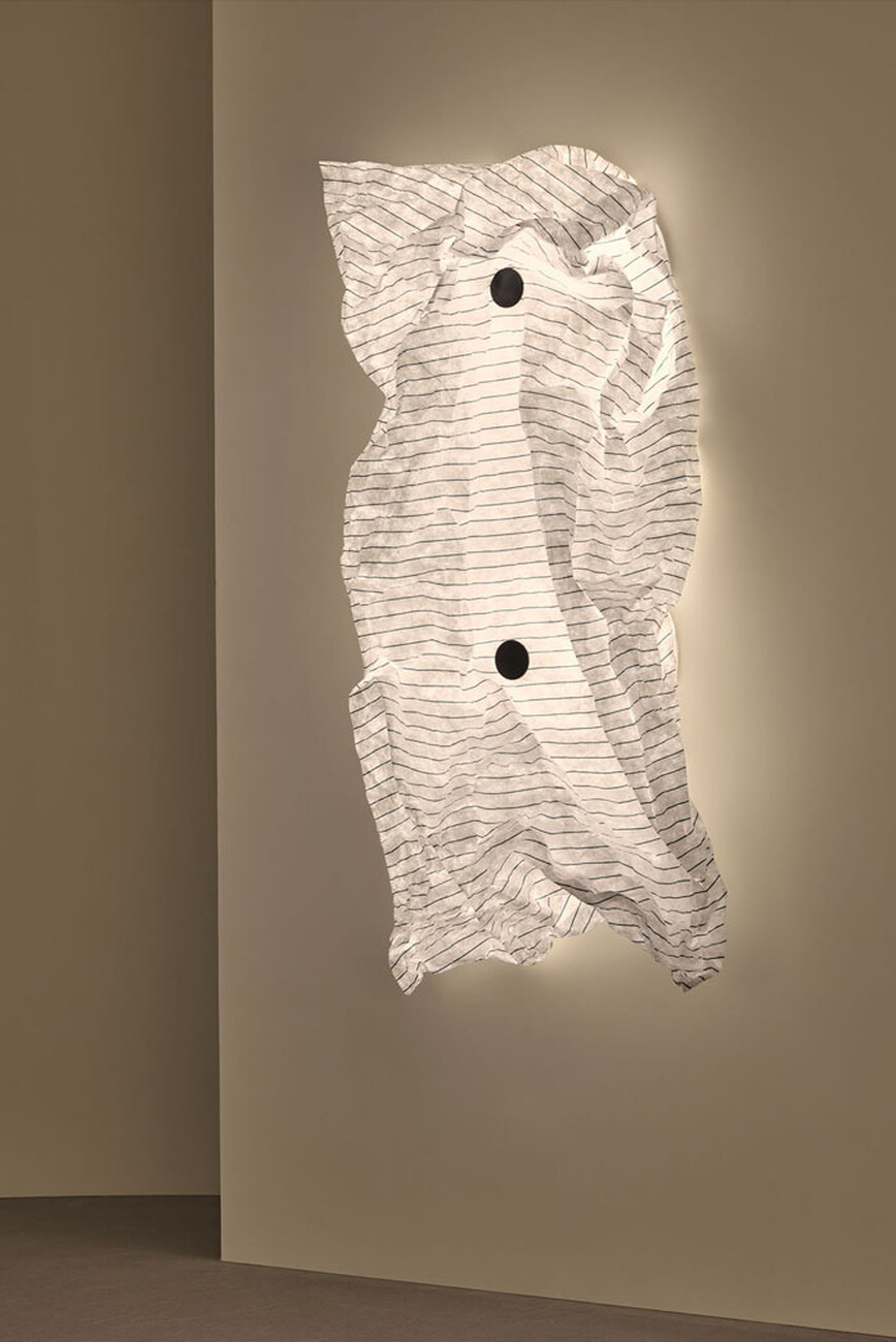 In the halls of the Euroluce International Lighting Exhibition, the invitation to haptic interaction surprised visitors with numerous luminaires: First and foremost, ‘Maap’ by Erwan Bouroullec for Flos, consisting of a paper-like, ultra-light Tyvek cover with a light source designed for standard bulbs. The tear-resistant body can be reshaped again and again, can be attached with magnets and provides atmospheric, flat light. At the same time, the ‘Linked collection’ by Michael Anastassiades at Flos, a modular glass system in hook form, whose elements can be hung inside each other for lighting, was also on show. Pedrali presented ‘Kawara’ by Yusuke Kawai, a lighting collection made of extruded aluminium, which is formally inspired by the traditional Japanese roof tile and offers numerous variants as a pendant luminaire, horizontal or vertical luminaire and as a floor lamp. The light can be directed as desired by hand using the adjustable modules. In addition to its new outdoor collection by Patrick Norguet and estudi{H}ac, Lodes also presented the new ‘MAP’ ceiling and wall lighting system, which was developed with Geckeler Michels and flexibly combines different modules. From the start module, the fabric strip fitted with special conductors is stretched freely between the various lighting points and feeds the entire system, whereby the power supply source always remains concealed. The ‘Vika’ columns by Khodi Feiz for abstracta dampen noise and emit pleasant light at the same time. They offer a wide range of variations, whether as a single object, for installation in corners or as a room divider. ‘Tortuga’ by Moritz Putzier for Martinelli Luce is a small wall light made of aluminium that resembles the shell of a turtle and can be rotated 360 degrees and tilted 43 degrees to direct the light. The ‘Dud’ wall light by ZP Studio | Eva Parigi e Matteo Zetti can also be flexibly adjusted. Its shape refers to the typographic characters ‘D’ and ‘U’ and can be rotated independently of each other on a common base. With ‘Grammoluce’ by Min Dong and Habits Design at Martinelli Luce, you can playfully access the light: the borosilicate glass structure is covered by an elastic fabric that is deformed with crystal glass spheres of various sizes placed on it, thus serving as a switch and dimmer for the lamp. The number and weight of the spheres placed on the fabric change the intensity and colour tone of the light emitted.