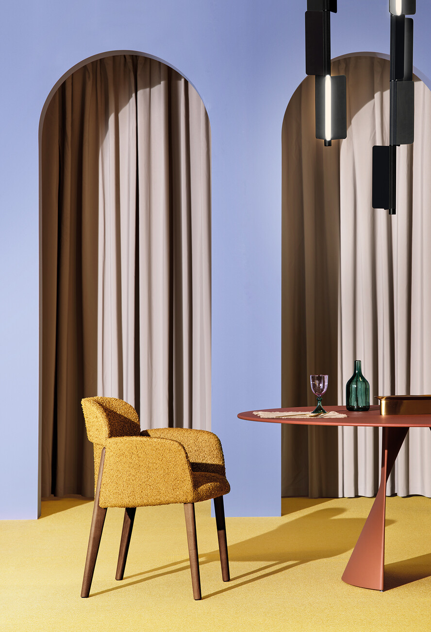 Being able to cope with the waiting room of the present while shaping the future is a task that creative minds face every day and their response to it was divided into two streams as they walked through the halls and showrooms in the city: back to what was and forward to new paths. The organic shapes and earthy colours of the sixties and seventies were given a slightly modified new lease of life, as at the Pedrali stand: Patrick Jouin translated the homage to the past and the nod to the future with the ‘Opale’ chair, whose silhouette is defined by a combination of leg, armrest and backrest made of solid ash or walnut wood. A handle is also set into the backrest. Comfort was a central theme in many shows, preferably framed in precise structures made of wood or chrome, as in the ‘Aristo’ chairs by Sebastian Herkner for ClassiCon with a backrest upholstered on two sides and framed by an elegantly curved tubular steel frame. In their ‘Kagu’ chair for COR, Jehs + Laub pulled the wooden legs made of either ash or oak up to the armrest and integrated them into the upholstered seat shell.