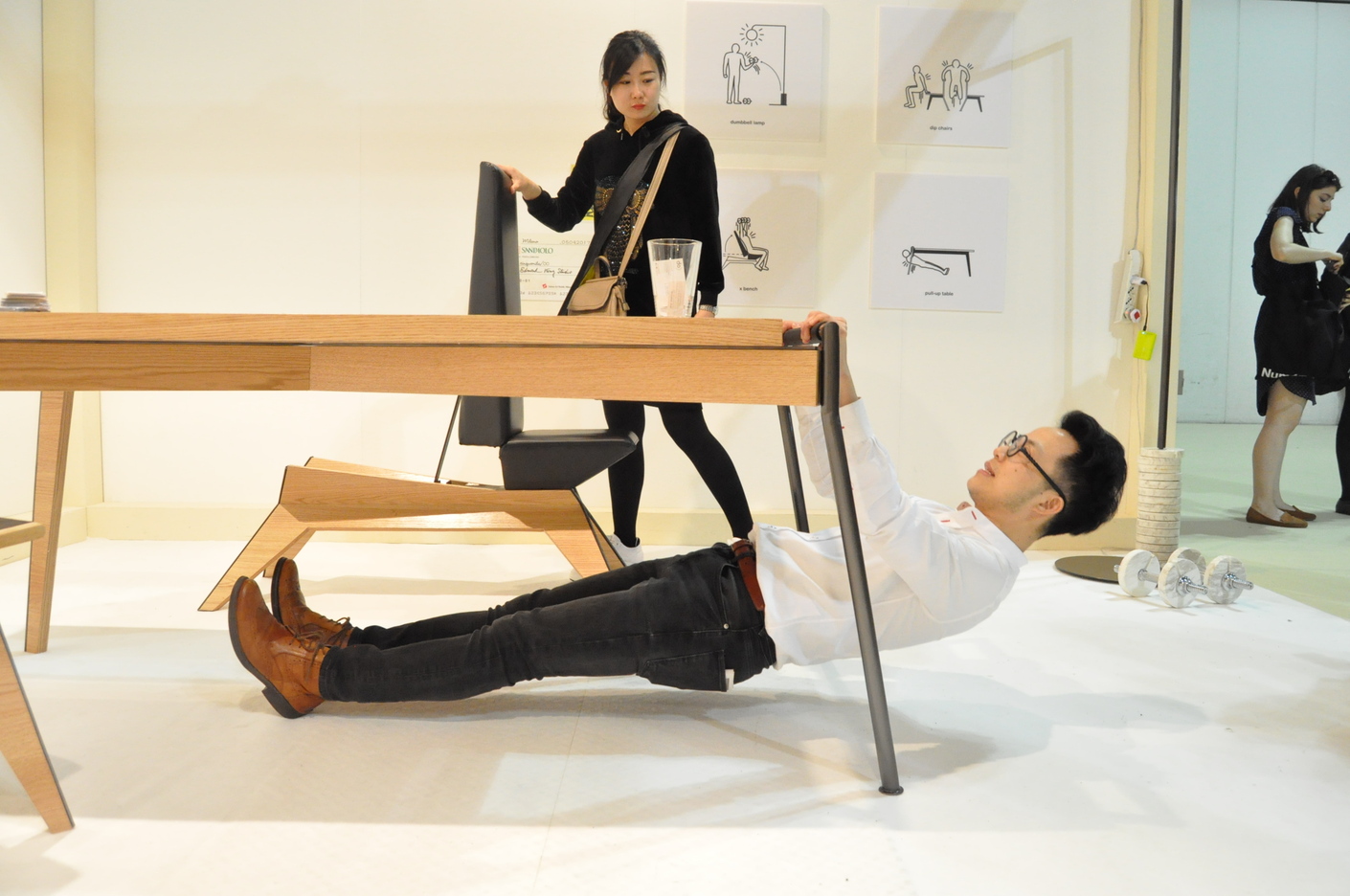 This year, young talent from Asia was especially prominent, albeit no longer primarily from Japan, but also from China, Taiwan and Korea. And one thing was for certain: The approaches they take seem to be more strongly steeped in the traditions of their respective cultures than is the case among their comrades-in-arms in Europe. For example, Hyung-Moon and Joo-Young Kim from Seoul rely on ancient Korean furniture making techniques for their projects. The result: among other things a straightforward stool that consists of three small solid wood panels where you only need to slot the tongues and grooves together. Edmond Wong, a young architect from Hong Kong, develops products based on his own needs. The outcome: his “Fitnitures”, for example, items of furniture that double up as fitness equipment and yet are beautiful in their own right – for there’s a standing lamp with a gymnastics ball as a diffusor or a bench on which you can do your crunches thanks to the headrest. The idea is admittedly not ultra-new, as industry has long since gone down the same path, as was to be seen at the last Orgatec.