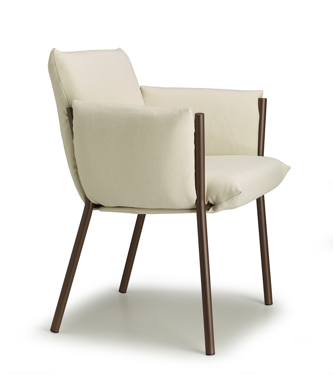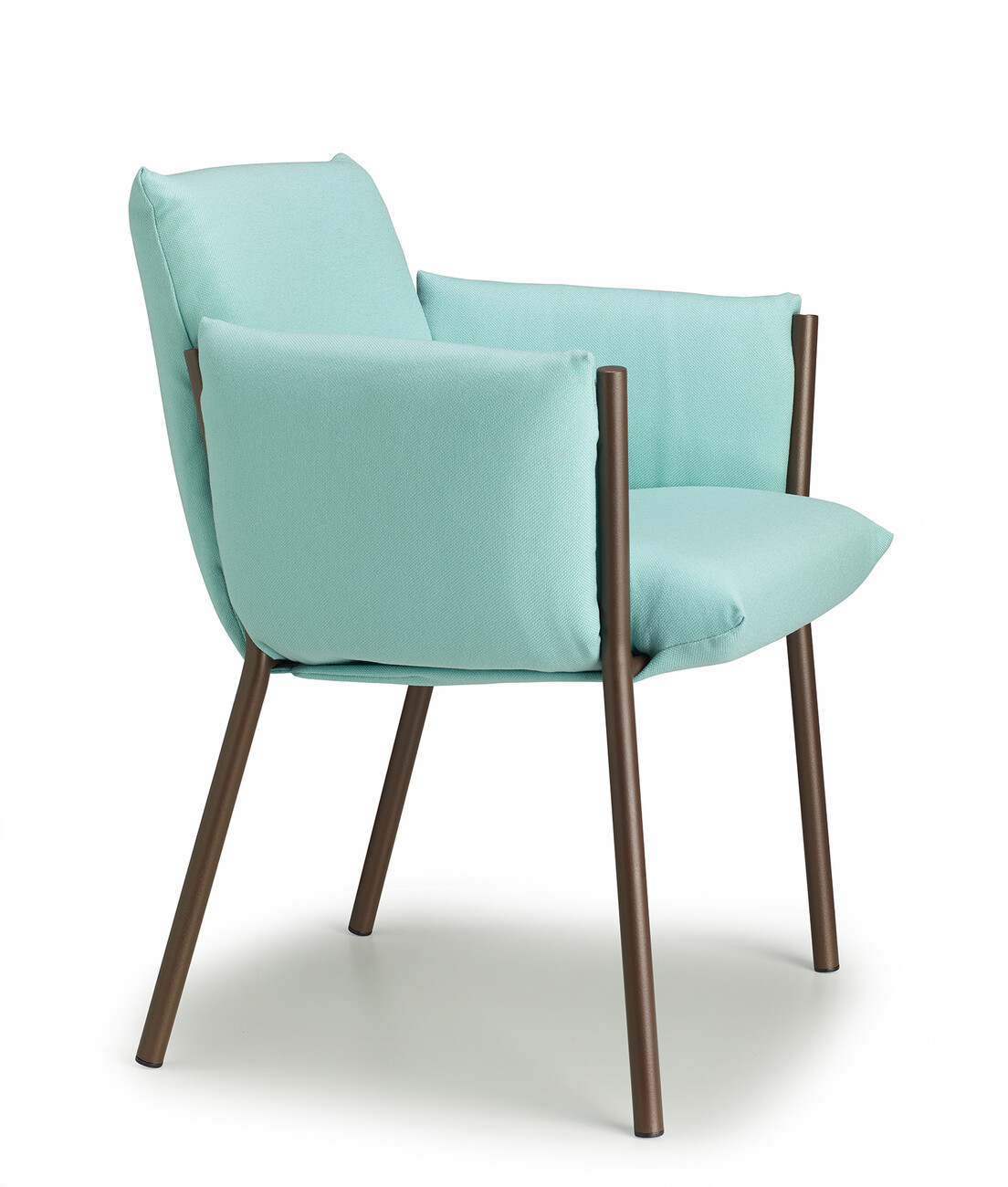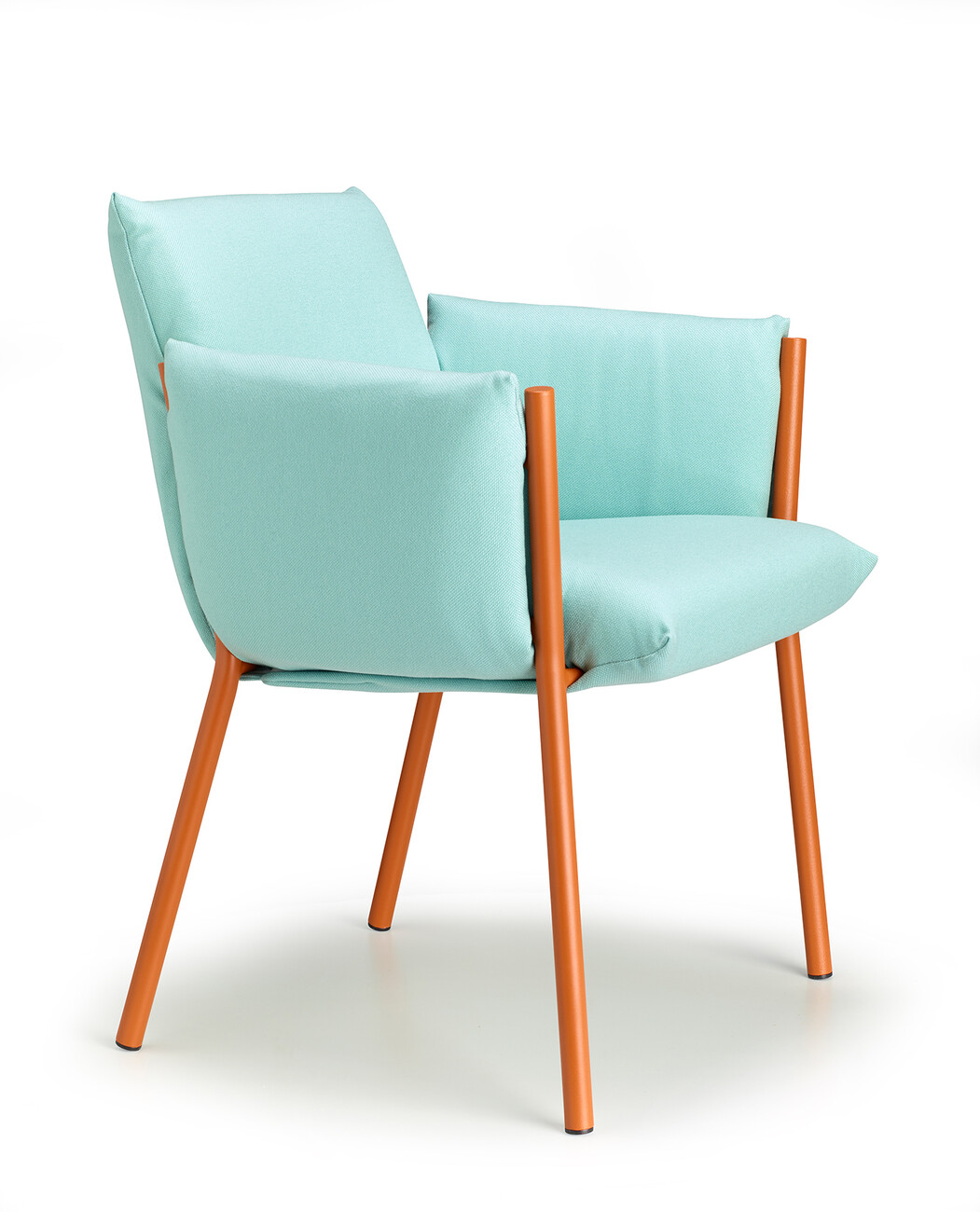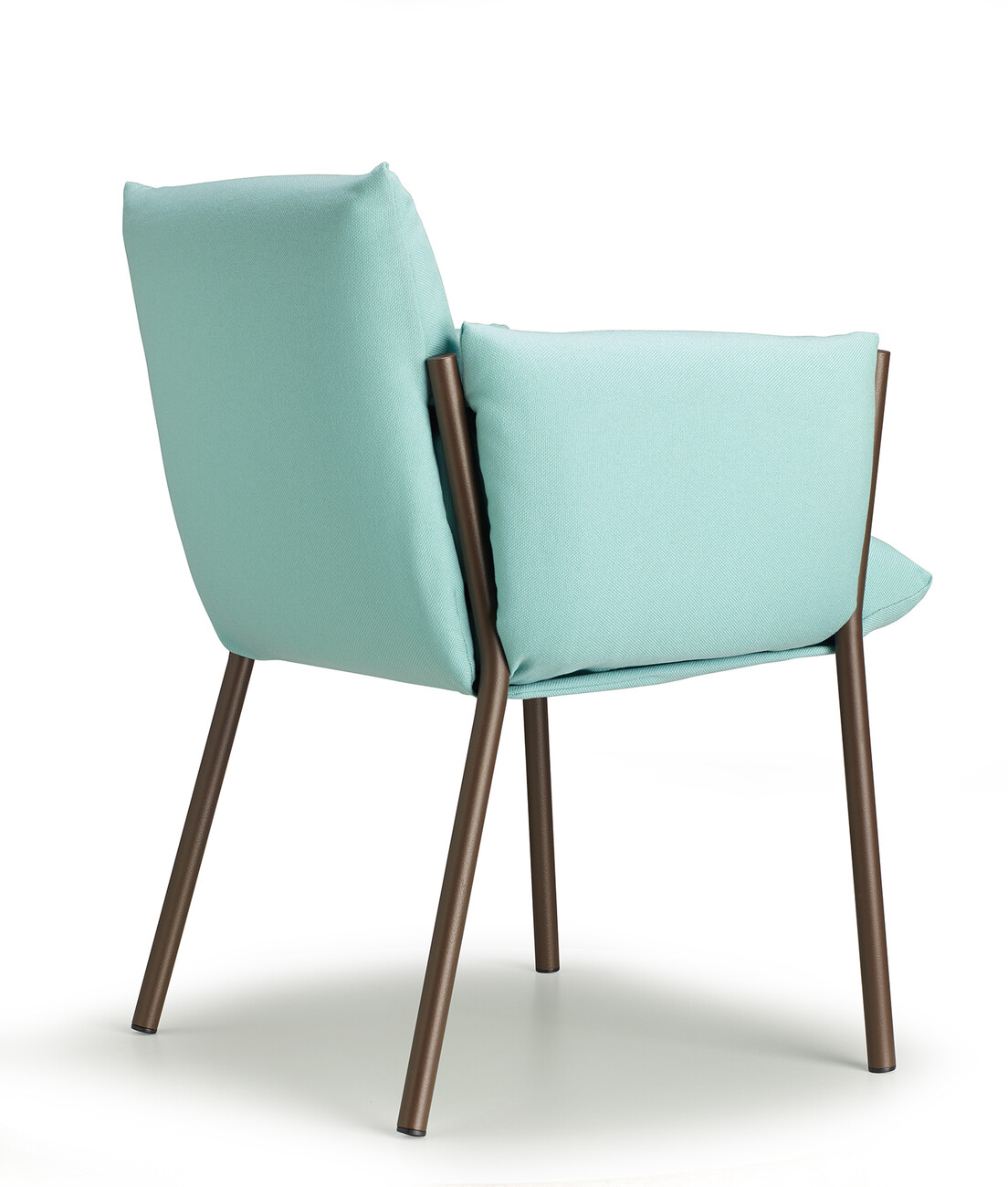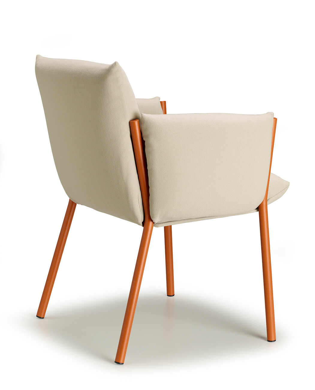 Regarding its compactness, “Brezza” is deliberately conceived as a kind of illusion, since all the components are easy to separate for the purposes of circular design. “‘Brezza’ is based on a powder-coated steel structure composed of tubes and plates. Once the cushions are in place, the frame recedes into the background in every respect – with the exception of the four legs, which give the object strength and a certain recognition value. The seat and backrest, as well as the two armrests, are connected. “This new way of ‘wrapping’ furniture makes it possible to position the upholstery by hooking it onto the frame and fixing it without zippers, Velcro, or buttons,” says Stabile, explaining the benefits of his design.