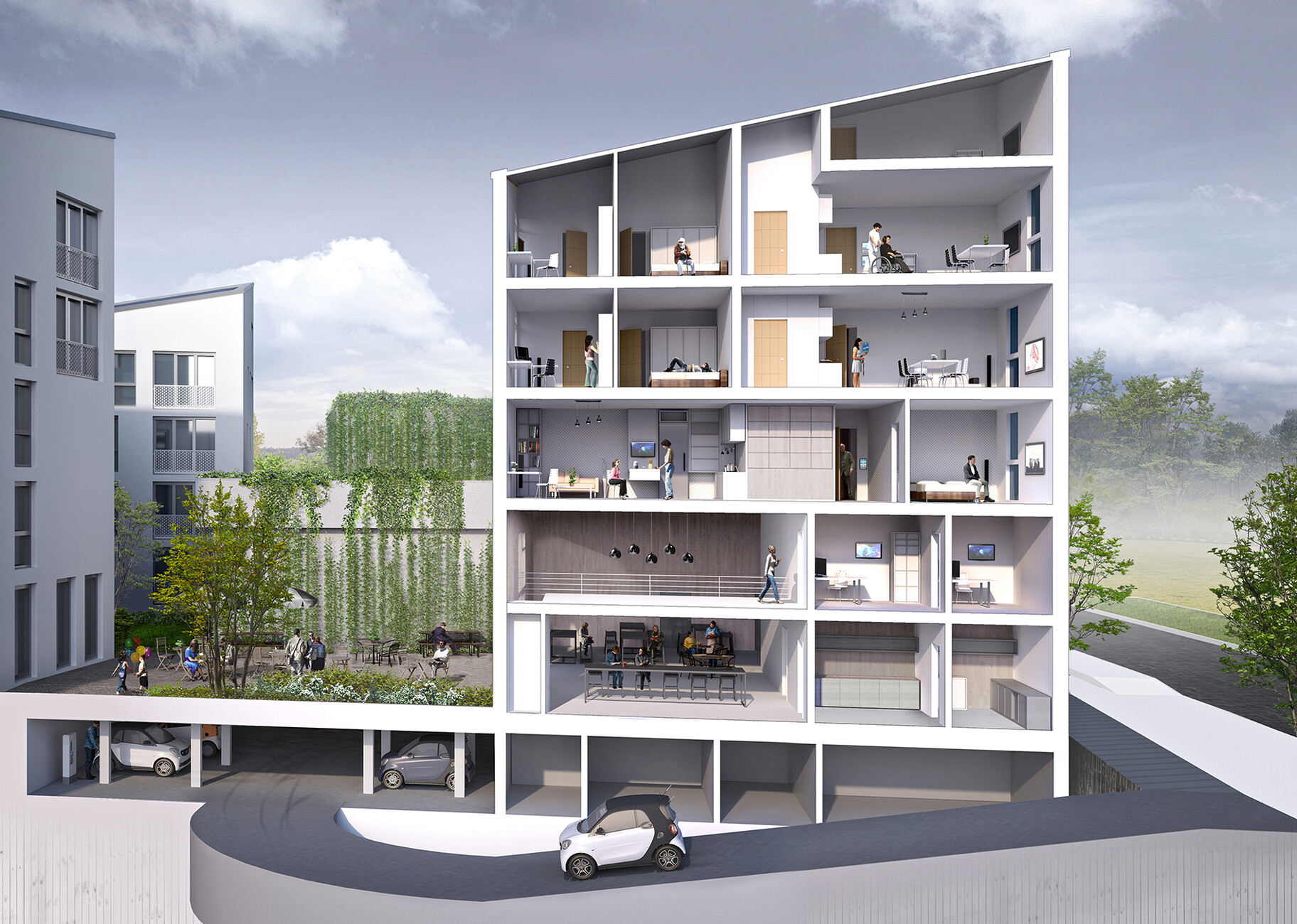 As a partner of the project Schindler has installed its complete PORT system. The latter not only controls the eight elevators but also access to the buildings and apartments. “If you have booked your electric Smart from the district’s own internal car sharing pool then as soon as you enter the underground car park the myPORT-app on your smartphone notifies the system that you have arrived home,”explains Sebastian Lurg. “After that it dials up the elevator that will take you to your apartment and opens the door once you are in front of it.”In future, it will also be possible for residents to hook up additional functions to the system. Then a certain lighting scenario can illuminate the apartment once the light control of the PORT system receives a signal that the occupant is on their way home.