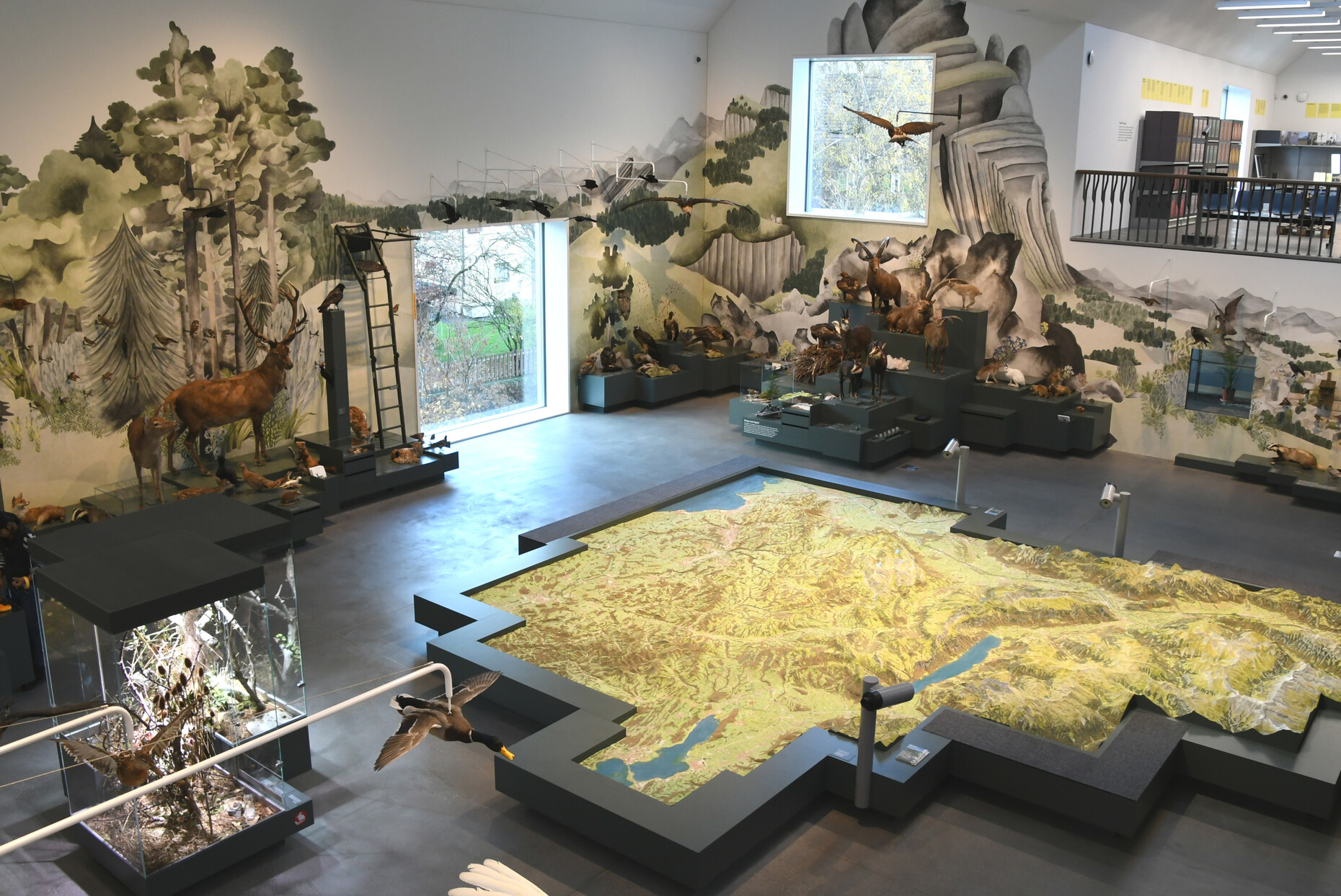 Another half-story up and the museum proper begins, arranged on three levels openly connected with one another and offering a varied course of smaller and larger, higher and lower spaces and niches. There is a room for temporary exhibitions on the lowest level, whilst in the middle – again a half-story higher – there is a two-story area housing a large topographic model of the entire canton, and on the top story the visitor can look forward to seeing the skeleton of a duck-billed dinosaur which, together with the stone formation that still partially encases it, weighs two tons. Like most of the exhibits, this skeleton too is displayed without protective glass, which enhances the direct effect and makes the visit more attractive for children and young people in particular.