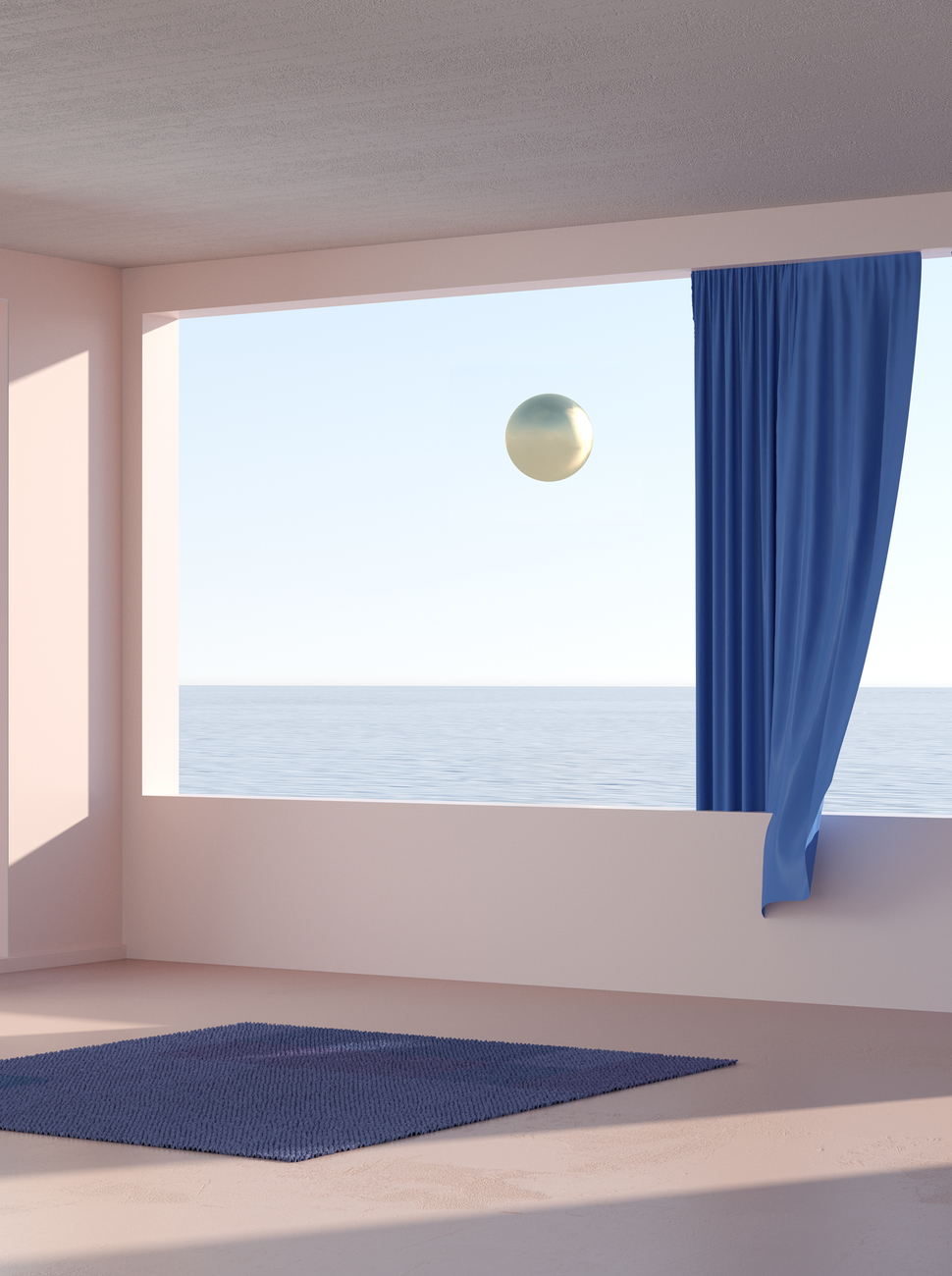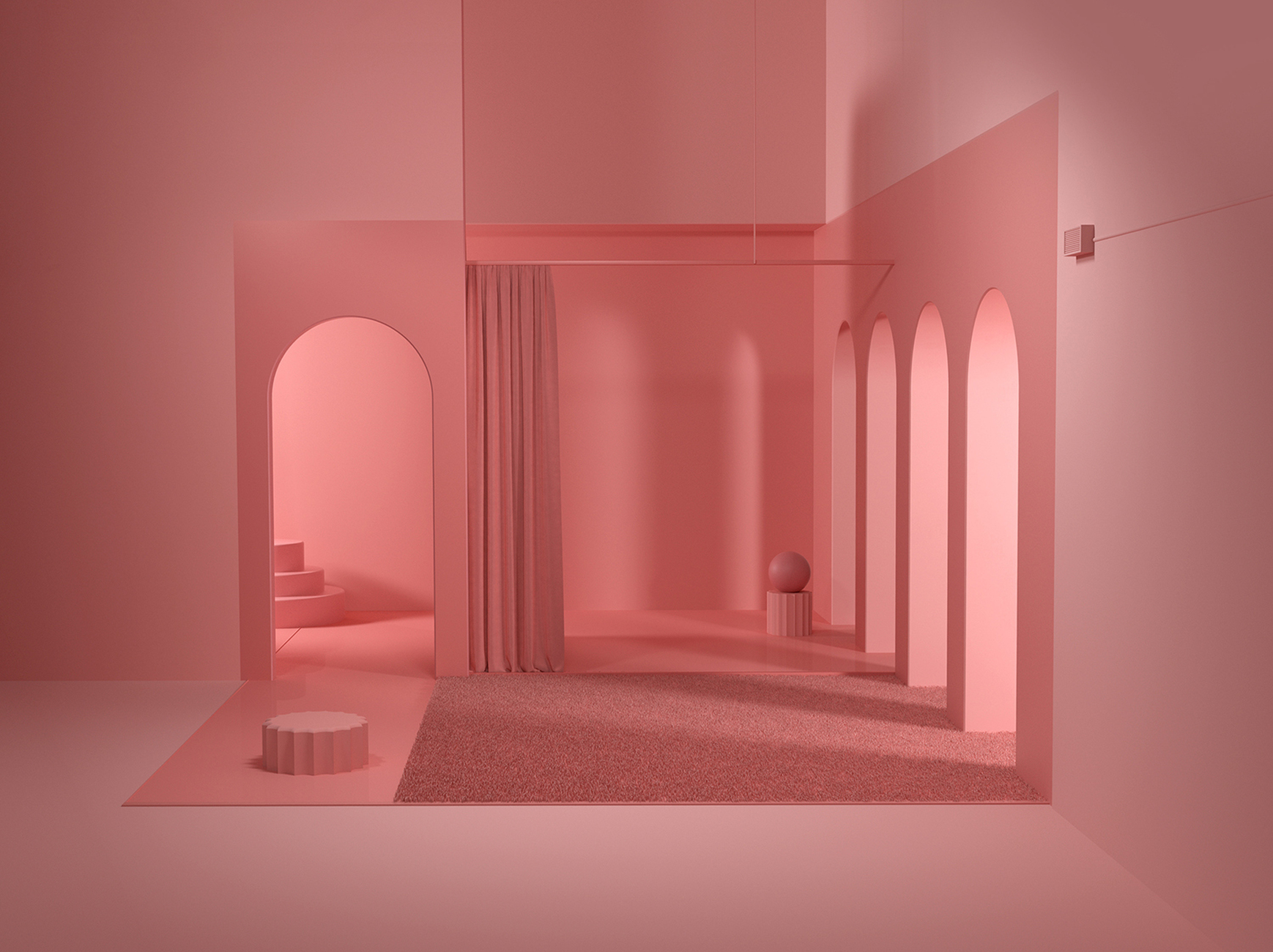 The designs by Six N. Five aim at aesthetics – their backdrops show a flawless, fragile beauty that is generally presented in soft colors: “Pastel colors are part of the studio’s DNA,” says Ezequiel Pini. The alien beauty that a glance into a dream appears to capture triggers a calming feeling of comfort in the observer. The fact that no living beings are depicted in their designs allows all the more scope for the individual’s power of imagination and their emotional connection to the studio’s works: “We create scenarios that invite people to navigate with their own minds, to explore them and to fill them with their fantasies,” says Pini. At the same time, everyday objects like a stool or a bed trigger our cognitive ability of recognition and give the digital image genuine dimensions. The digital twins of real objects and the artificial worlds in the Six N. Five universe merge almost seamlessly, as can be seen in their works for major corporations like Rimowa, Samsung, Laufen or Nike: Six N. Five embeds from suitcases to sneakers or sanitary ceramics the products so seamlessly into the digital flow that in the final outcome you barely perceive this to be advertising. Ezequiel Pini and his team begin the creative process without dummy runs directly on the computer: “First we produce a rough illustration with geometric elements, which we then perfect layer by layer right down to the addition of shade and dust”, explains the graphic designer, adding: “The presentation in 3D not only gives us the chance to capture and repeat the dream images, but also to perfect them.”