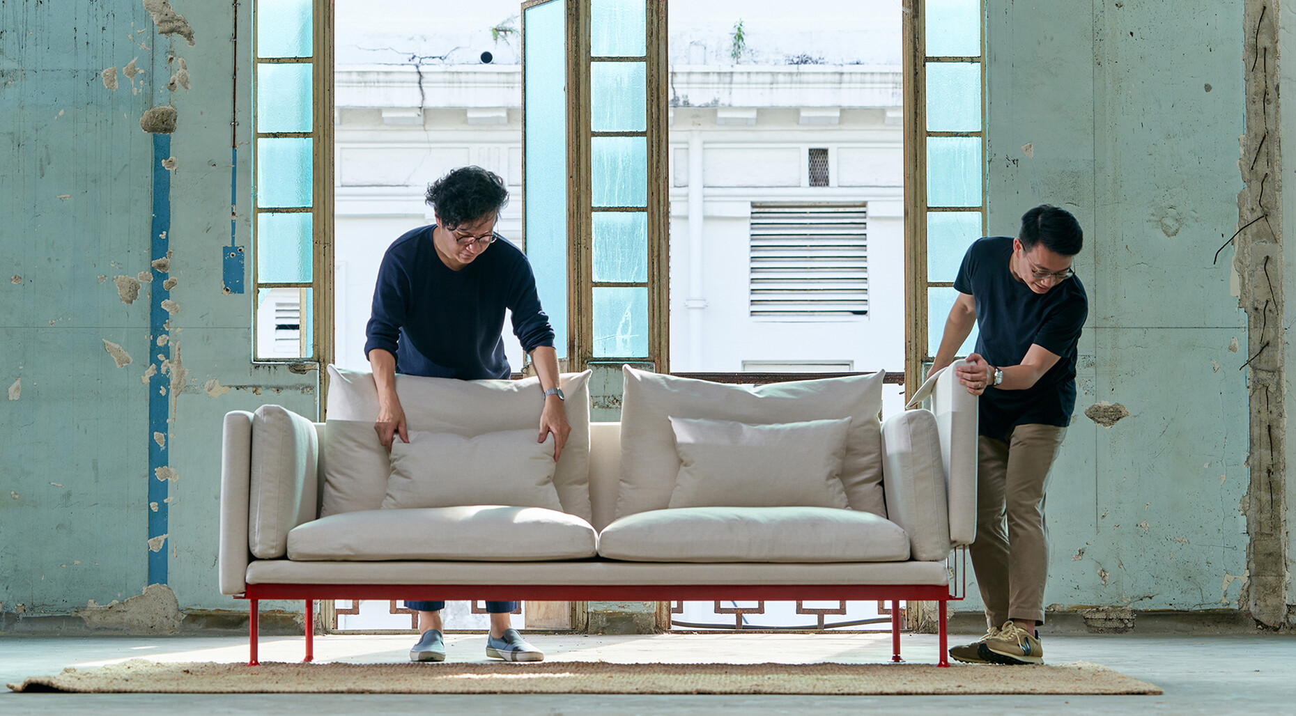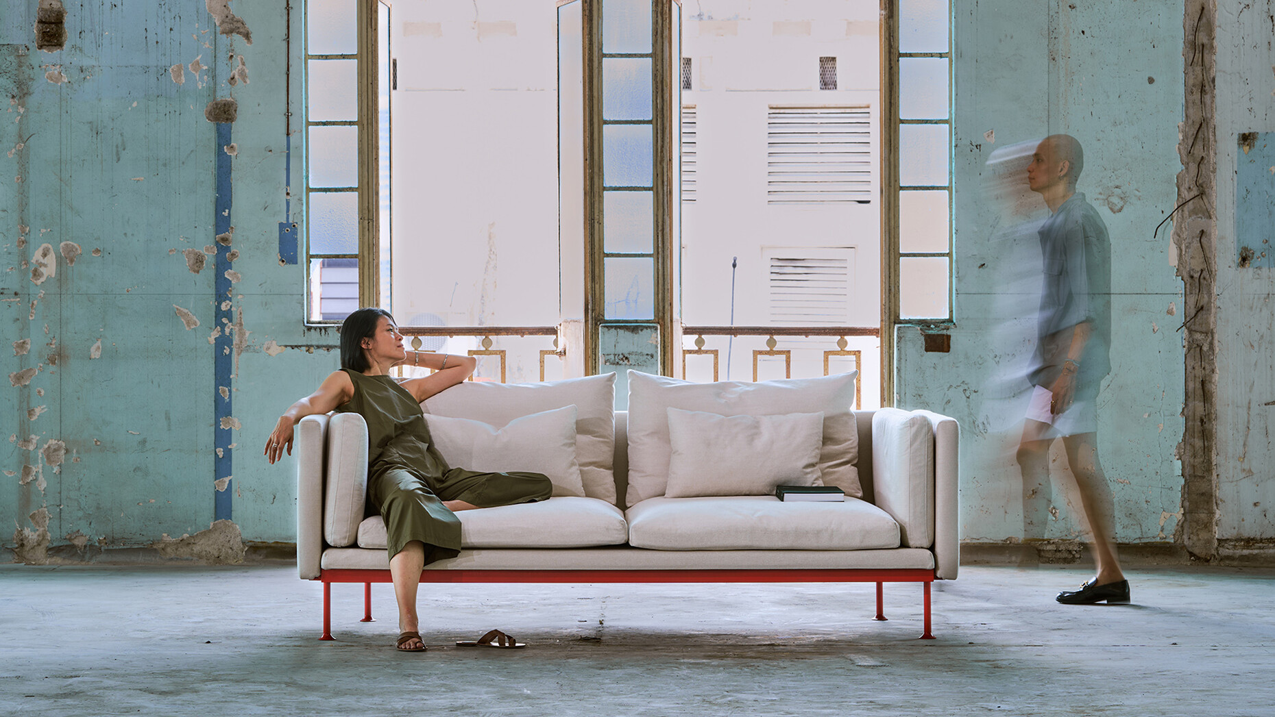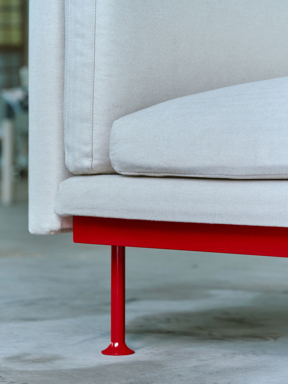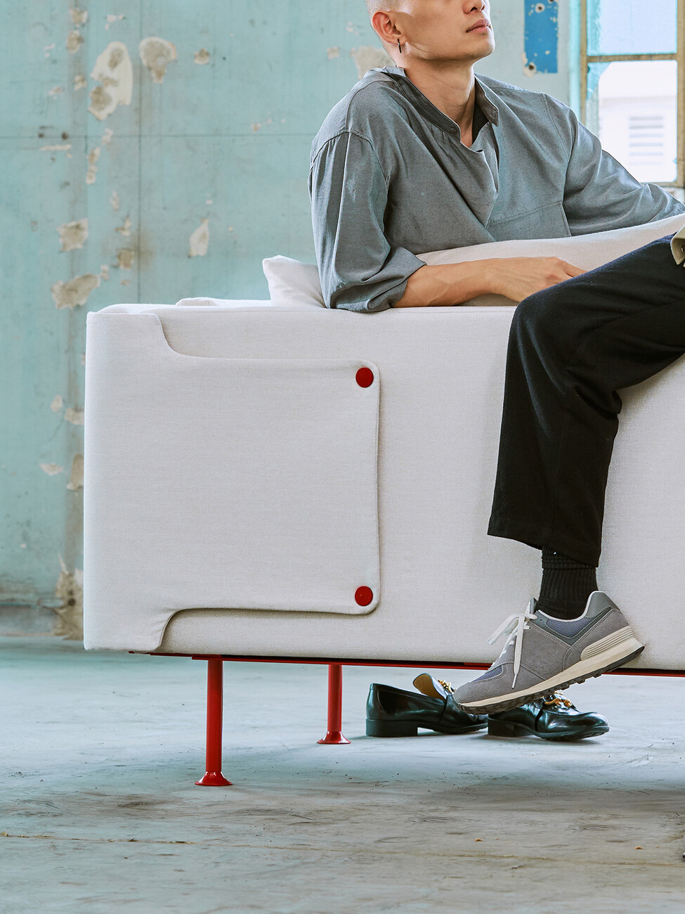 By Hogen seeks to combine traditional craftsmanship with modern aesthetics. The new three-seater "Unfold" offers a young and light look. A special feature is its effortless assembly: the feet of the metal frame are easy to attach and the side rests can be unfolded. The upholstery is slipped over and then fixed in place with a few decorative buttons, therefore the back can also serve as a convincing element in the room. "Unfold" thus not only visually reflects the fast-moving and adaptable spirit of urban life. The sofa is 220 centimetres wide, has a comfortable seat depth and is available in two colour combinations: black metal is paired with a rusty red fabric – the calmer version. The combination of off-white upholstery with a strong red colour in the frame and buttons creates a fresh impression. (eb)