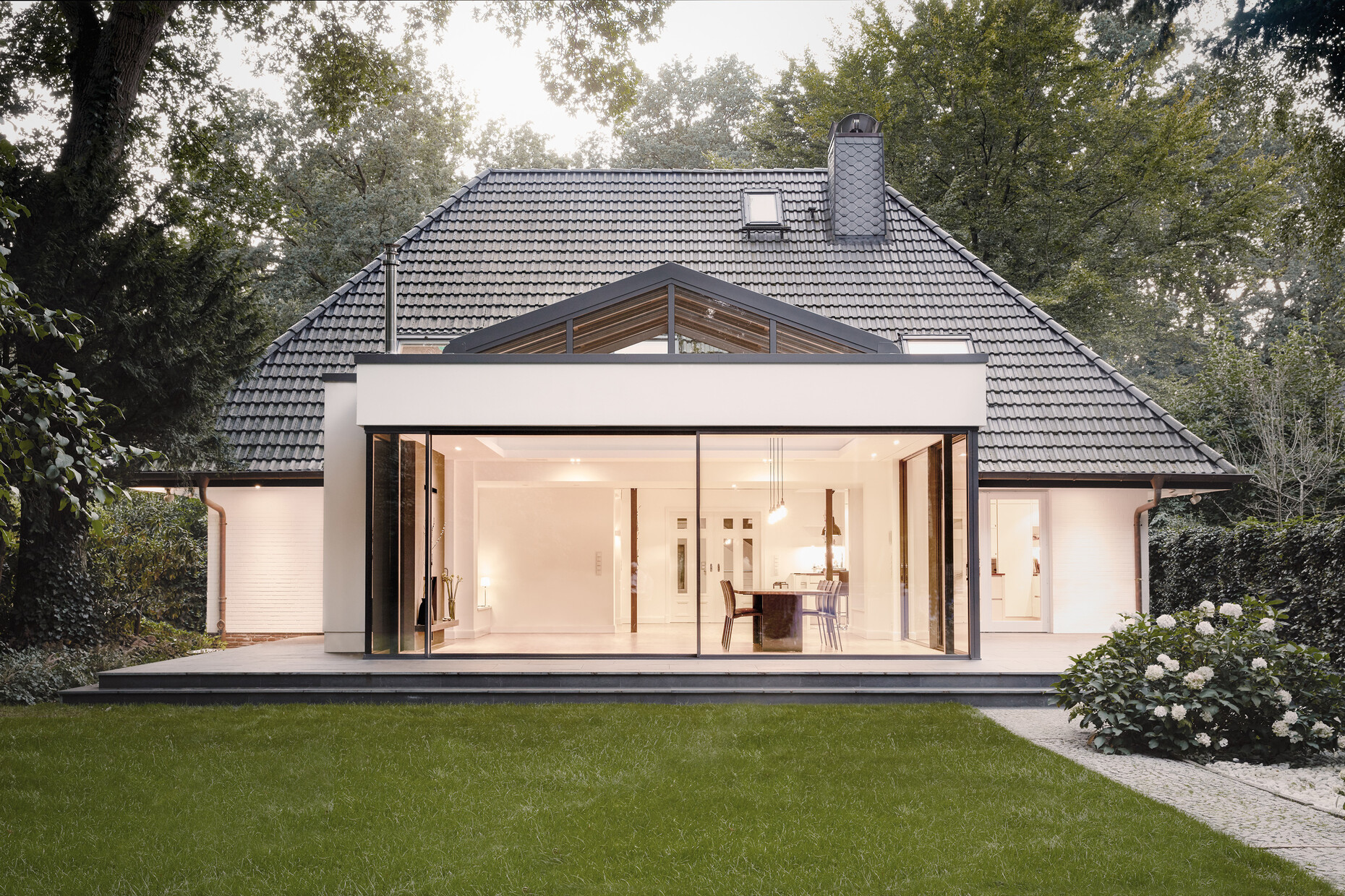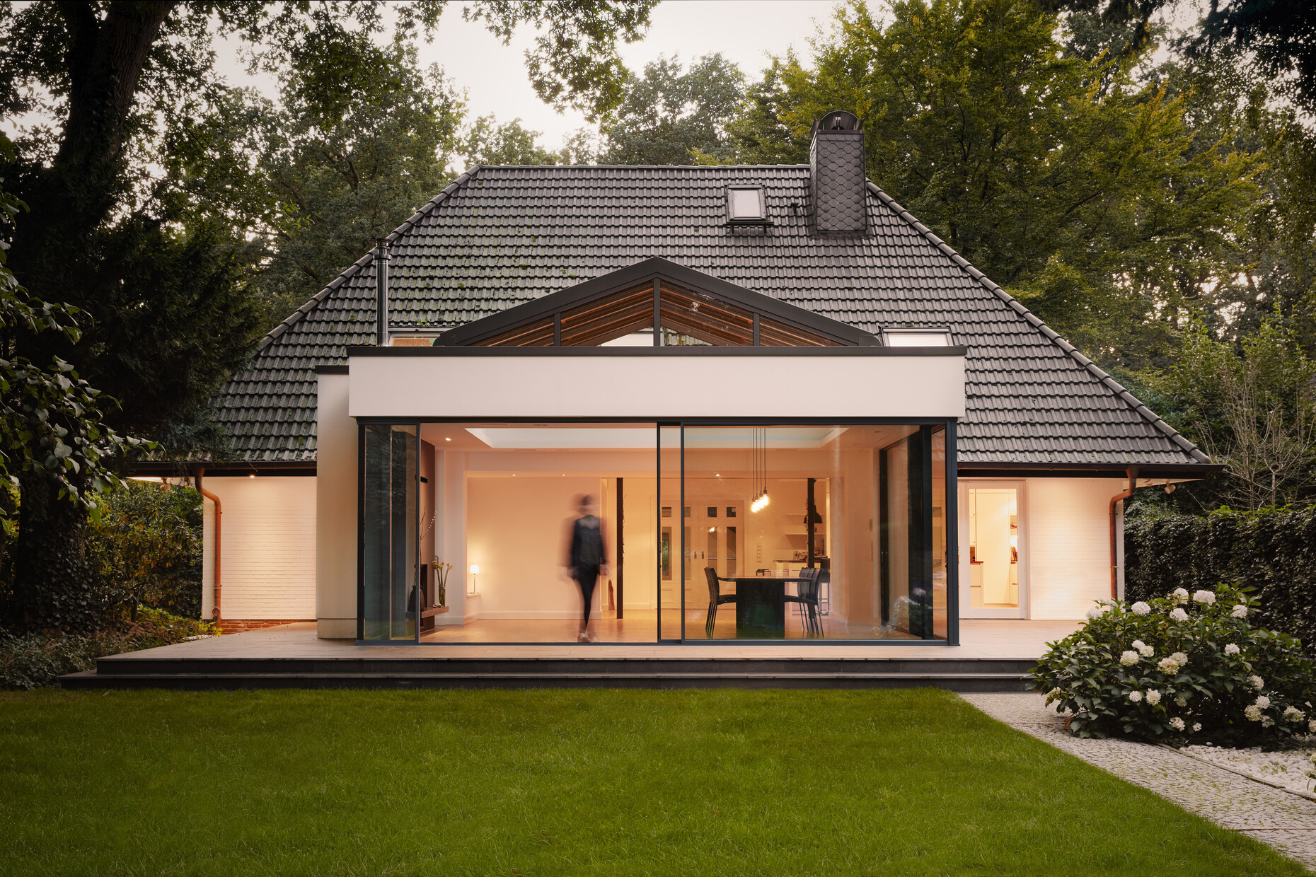A house built in the 1970s, with a large garden and directly bordering on the Klövensteen woods in Hamburg: The quiet location out in nature is an ideal retreat from big-city life. The only downside: The high trees right round the plot and the few windows meant the interior was forever kept in the semi-dark. Enlightenment was provided by a glass annex that directs lots of brightness indoors. It is the brainchild of the planners at Planungsbüro Eggers in Hamburg. The rear wall of the detached house was opened and expanded to feature a transparent pavilion that ensures an optimal influx of daylight. The gains are considerable: 45 square meters of additional space boasting an unobstructed view of nature.