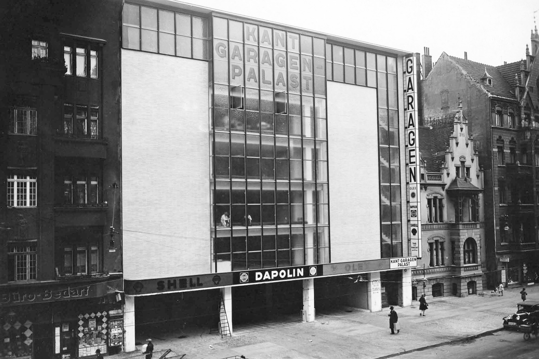 The parking garage, opened in 1930, was commissioned by the engineer Louis Serlin and designed by architects Hermann Zweigenthal and Richard Paulick (a Bauhaus and later GDR architect). All of the building's historical objects, i.e. inscriptions, fittings, building services, the original automatic fire doors and the steel, heated parking “boxes” with their sliding doors, which once housed valuable Horchs, Mercedes and Maybachs, were removed and secured.